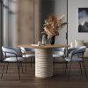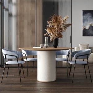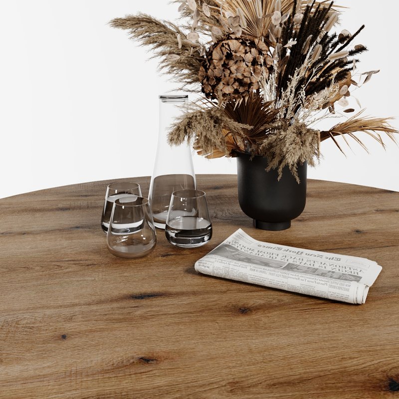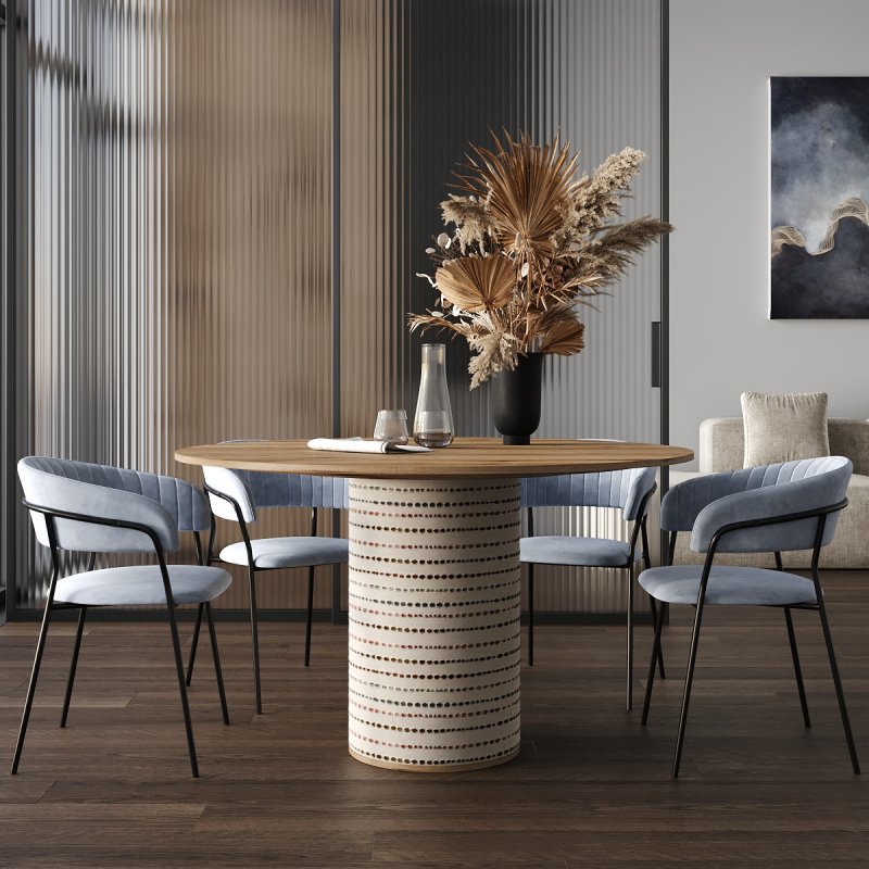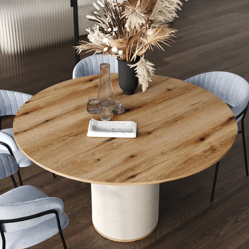 Стільниця виконана з ЛДСП з природною текстурою дерева, що створює теплий і живий вигляд, ніби природа увійшла до кімнати. Завдяки круглій формі за Лакі приємно зібратися разом — кожен у центрі уваги.