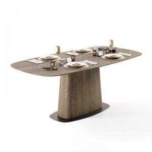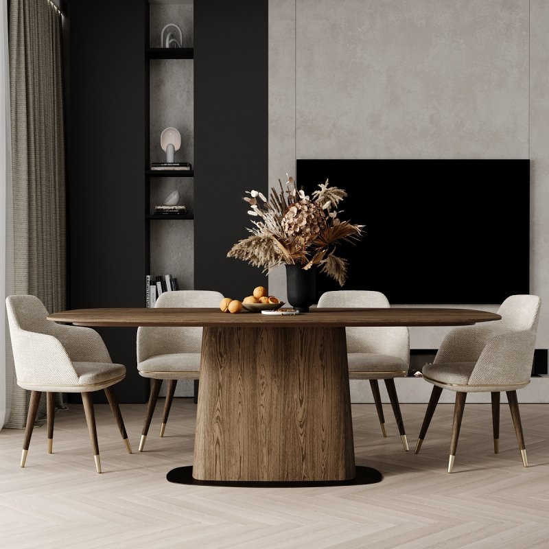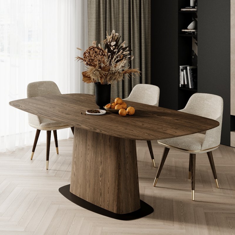 Основа та стільниця столу виготовлені з МДФ, вкритого шпоном дуба або американського горіха, що передає глибину та природну текстуру дерева. Конструкція розміщується на металевому диску, що додає надійності, стійкості та візуальної привабливості.
