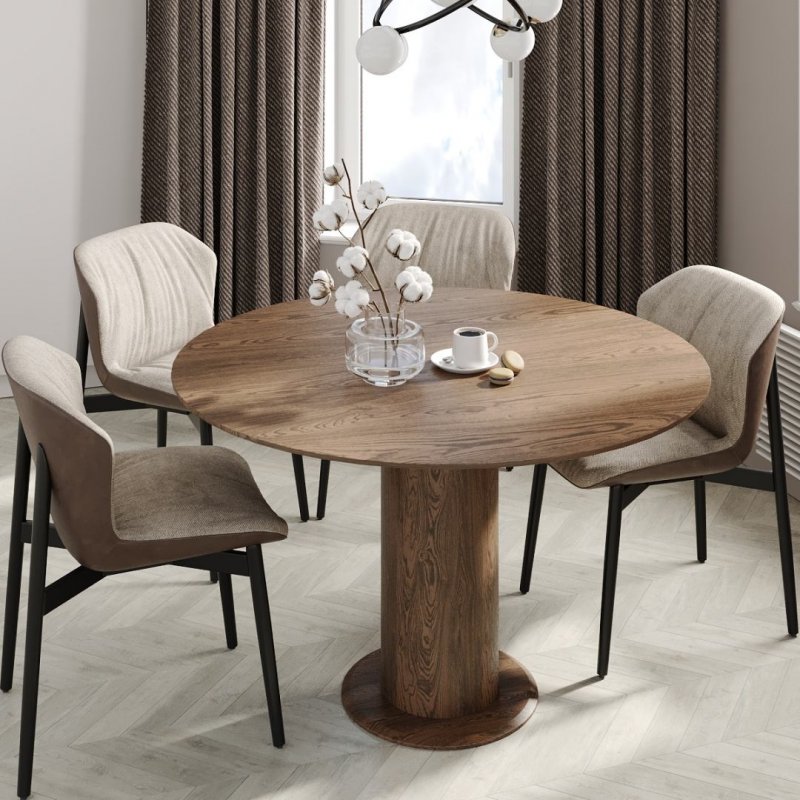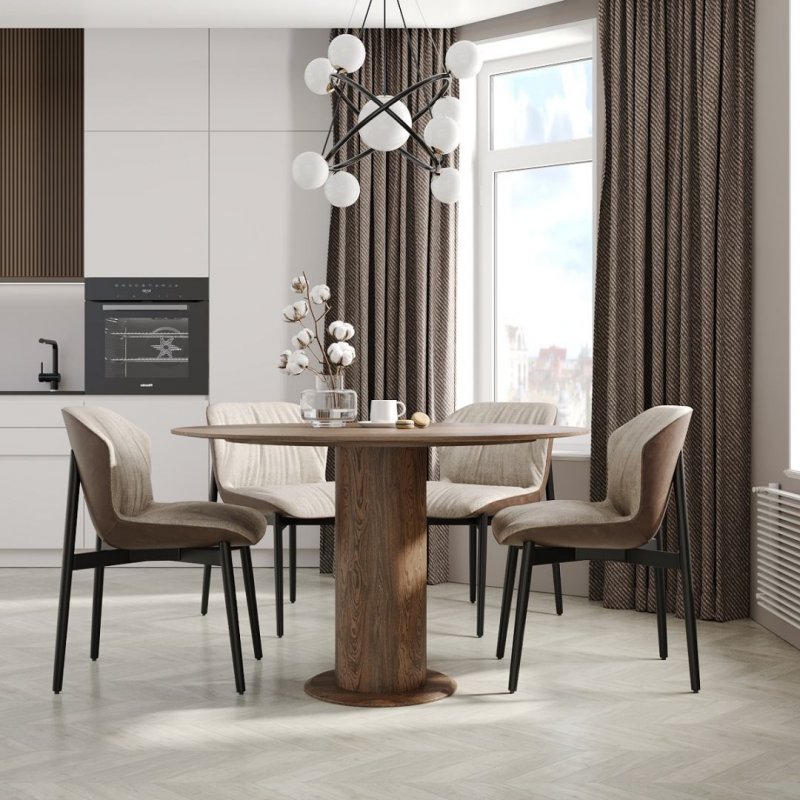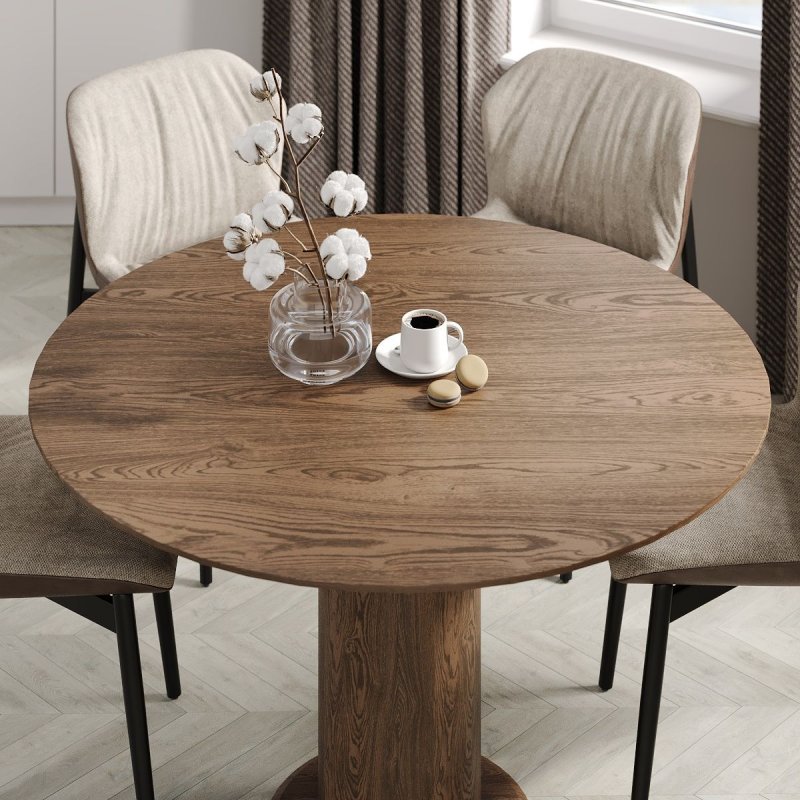 Циліндрична ніжка додає модного акценту, але не перевантажує інтер’єр. Саме така форма зараз у тренді: стіл виглядає лаконічно, стильно та легко адаптується до будь-якого сучасного простору — від кухні-студії до окремої їдальні.
