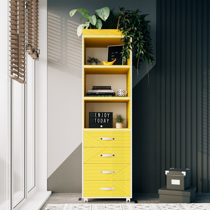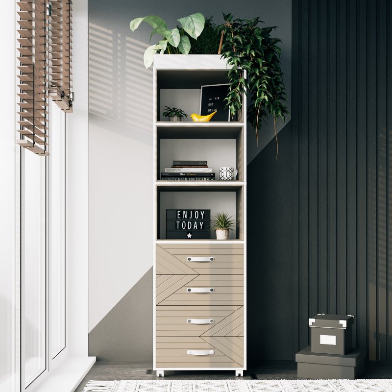 Стелаж Марокко – чудове рішення для систематизації речей у кімнаті. Він стане гармонійним доповненням до шафи або заміною їй, що допоможе заощадити простір. Стелаж обладнаний трьома відкритими полицями та чотирма висувними ящиками. Має симетричний вигляд із задньою та бічними стінками. Завдяки чому зберігати в ньому можна абсолютно різні предмети, залежно від призначення та місця розташування стелажу.