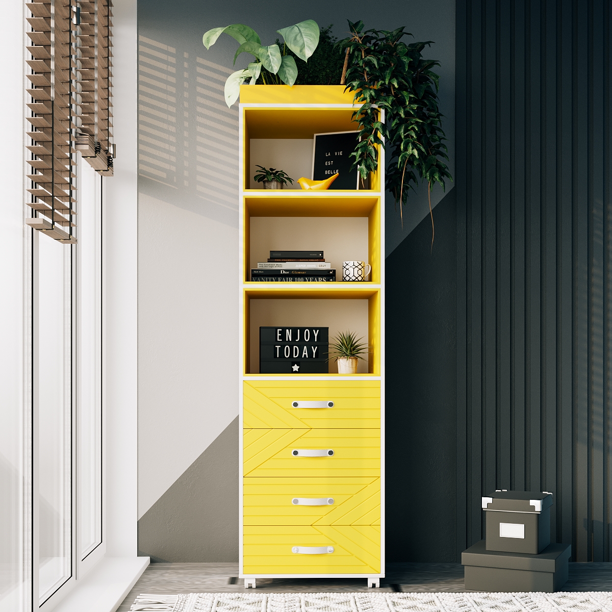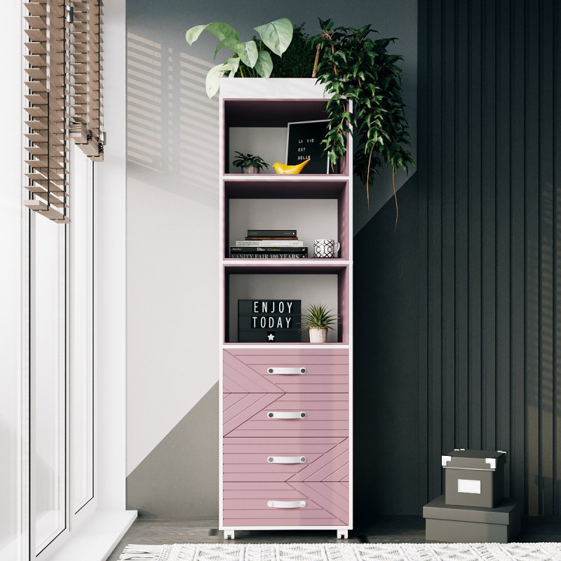 Компактні розміри 1750х500х400 мм (ВхШхГ) дозволяють поставити стелаж у будь-якому куточку кімнати, а наявність коліс робить його максимально зручним та мобільним. Такий виріб чудово впишеться в інтер'єри спальні, кухні, вітальні, гардеробу чи дитячої кімнати. Сучасний дизайн та різноманітність відтінків припадуть до душі кожному, незалежно від віку та статі. Родзинкою стелажу також є геометричні візерунки та чорні шкіряні ручки.