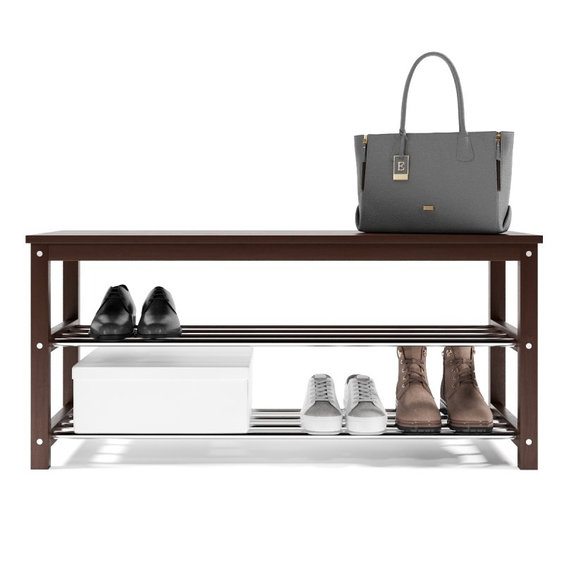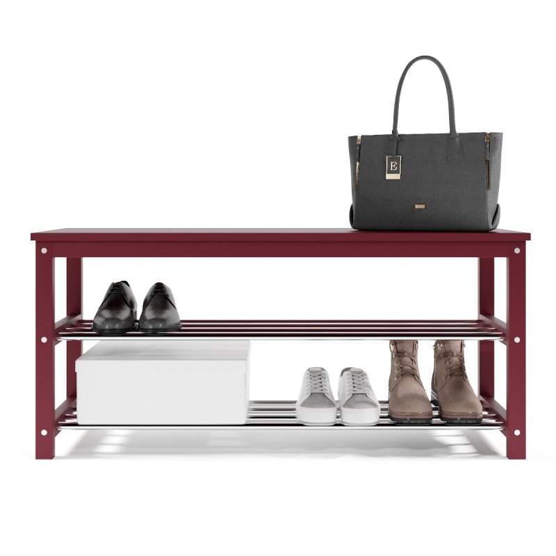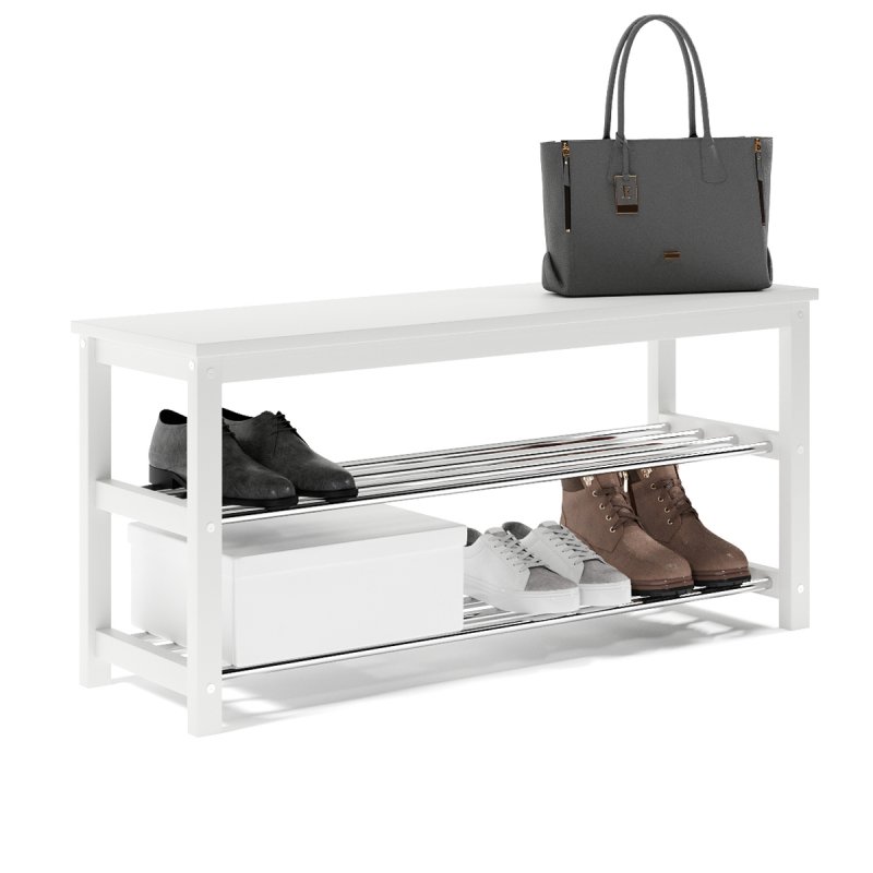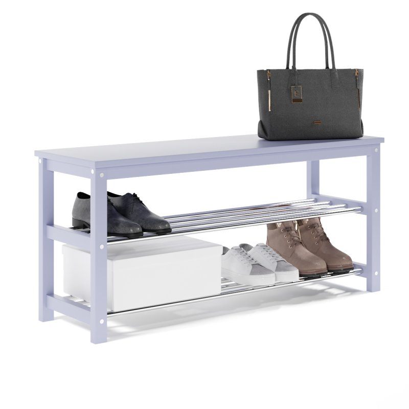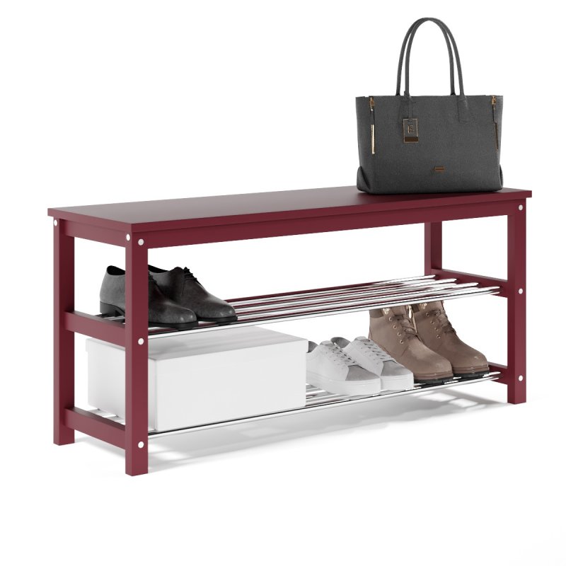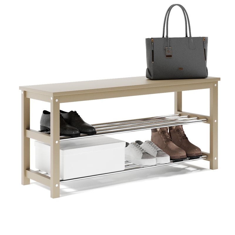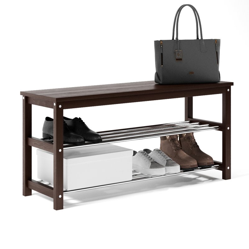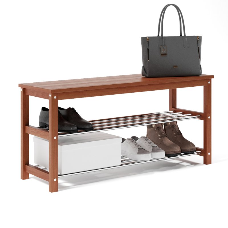 Завдяки натуральній основі та якісному італійському лаку, виріб має гарний зовнішній вигляд, поверхня надійно захищена від можливих побутових пошкоджень, подряпин, вологи та ультрафіолету. Габаритні розміри (В/Ш/Г): 480х1020х320 мм. Полиці виконані із сталевих хромованих труб діаметром 16 мм. Відстань від підлоги до нижньої полички – 65 мм, верхньої – 265 мм. Ви можете розмістити на полицях банкетки 8-10 пар дорослого взуття, це дозволить утримувати передпокій у порядку та не створювати під ногами зайвий хаос. Хромоване покриття металевих полиць забезпечує надійний захист від впливу корозії, тому можете сміливо ставити на них навіть вологе взуття, це допустимо.