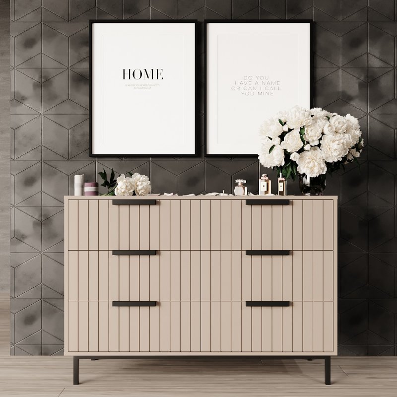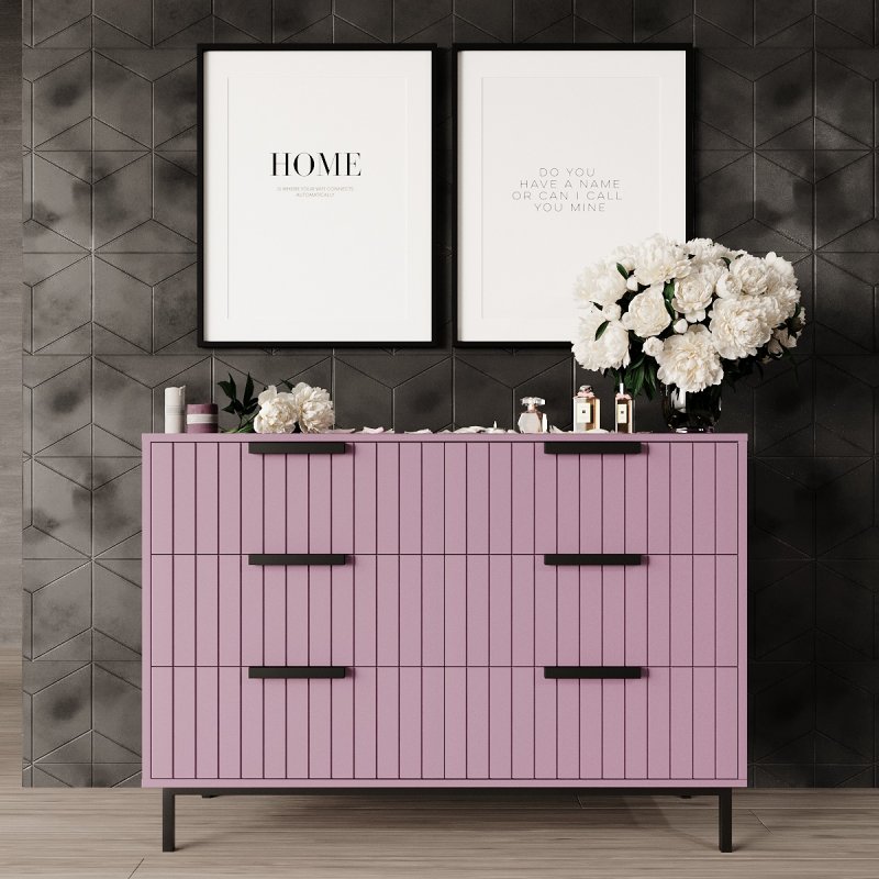 Традиційна прямокутна форма дозволяє поставити комод у будь-яке зручне місце. Висота ніжок оптимальна для комфортного вологого прибирання, а також робота пилососу. А якісні механізми здатні витримати великі навантаження та забезпечують безшумне та легке висування ящиків. Комод у спальню виконаний у п'яти спокійних та ніжних тонах (какао, лаванда, лагуна та елегант грей), які відносяться до найбільш підходящих для даної кімнати, допомагаючи розслабитися та налаштуватися на хвилю відпочинку. Розмістивши над ним дзеркало, він чудово впорається з роллю туалетного столика, тим самим заощаджуючи простір.
