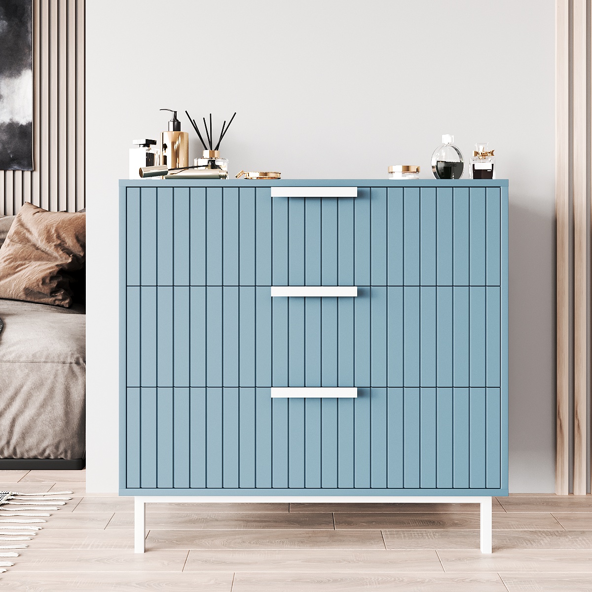 Незамінною частиною будь-якого інтер'єру є комод. Завдяки своїй місткості та функціональності він має великий попит і завжди залишається в моді. При своєму компактному розмірі комод може розмістити такий же обсяг речей, як і шафа. Дана модель має три просторі ящики для білизни, постільних речей, косметичних засобів та одягу. Відкриття ящиків відбувається дуже легко і плавно, завдяки високій якості механізмів висування. Для розміщення світильника, рамок із фотографіями або вази з квітами відмінно підійде стільниця.