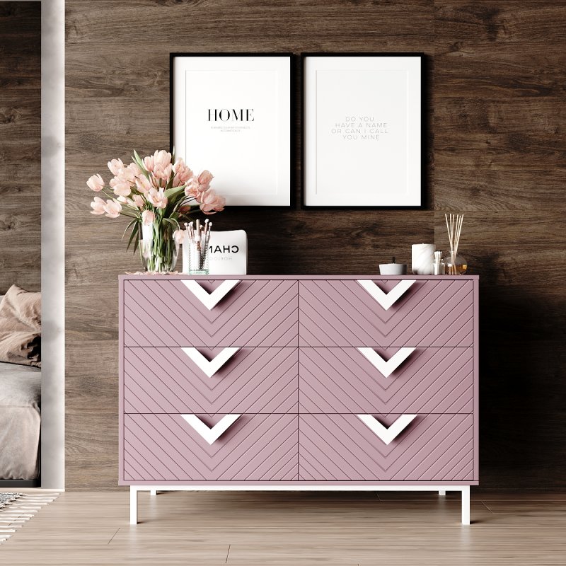 Завдяки плавному та безшумному механізму висування ящиків комод для речей також можна поставити у дитячій кімнаті, що допоможе у підтримці порядку. Це значно спростить Вам життя. Так як на нього, за наявності новонародженого, можна встановити пеленальний столик, а у верхні ящики скласти предмети для догляду за дитиною. Виготовлений комод із мдф на металевих тонких ніжках, пофарбованих термофарбою в білий колір - якісне та надійне поєднання, що дозволить прослужити йому довгі роки, залишаючись у чудовому стані. Виріб представлений у спокійних тонах (какао, елегант грей, лагуна та лаванда), один з яких ідеально підійде саме під Ваш інтер'єр.