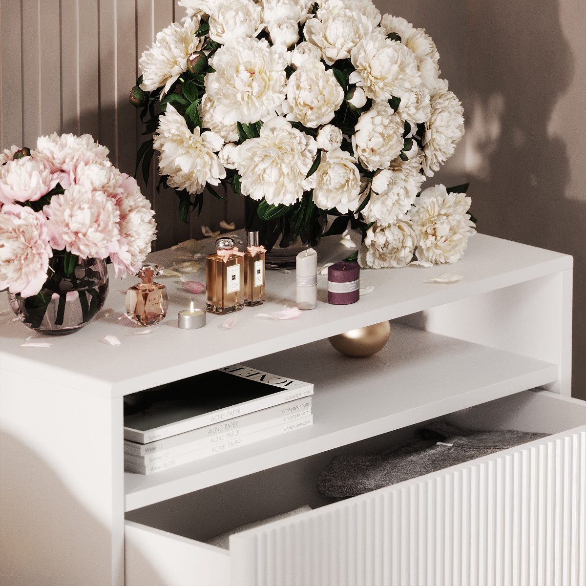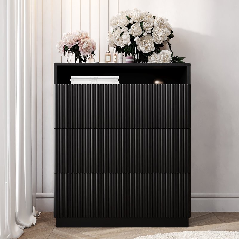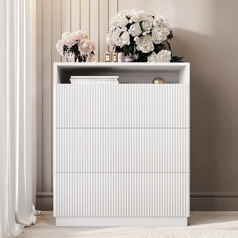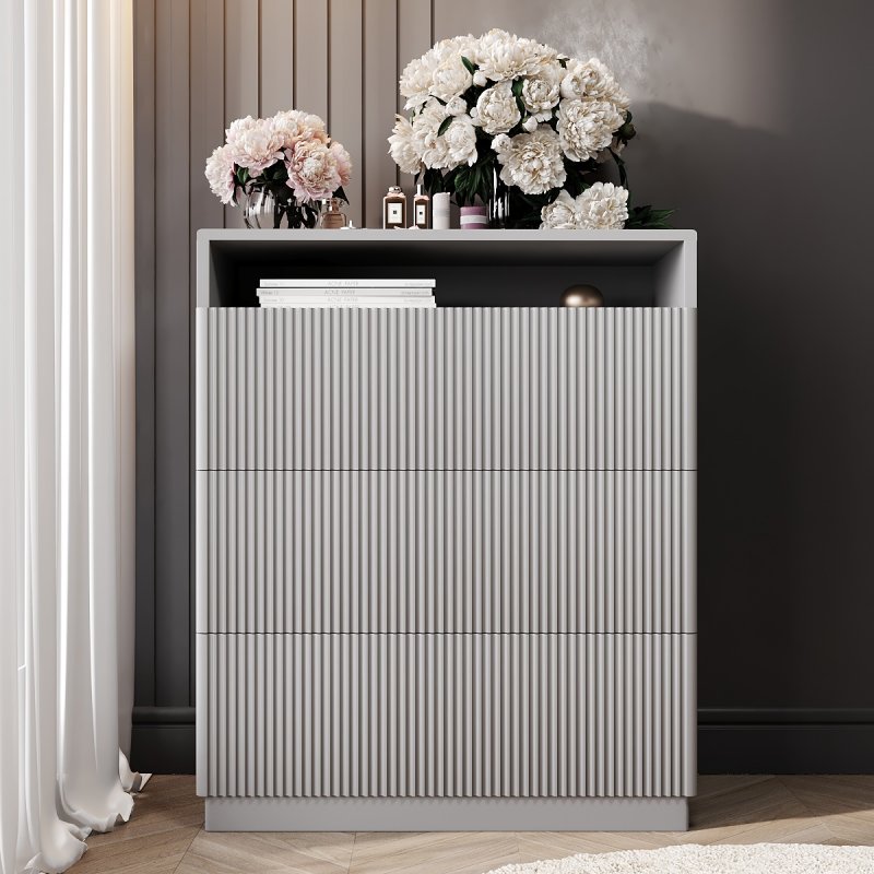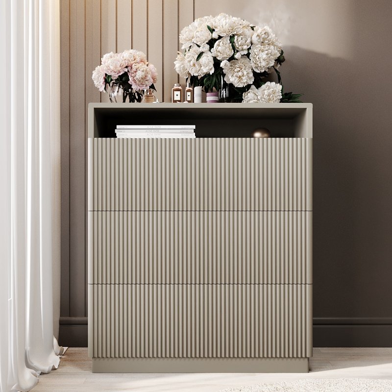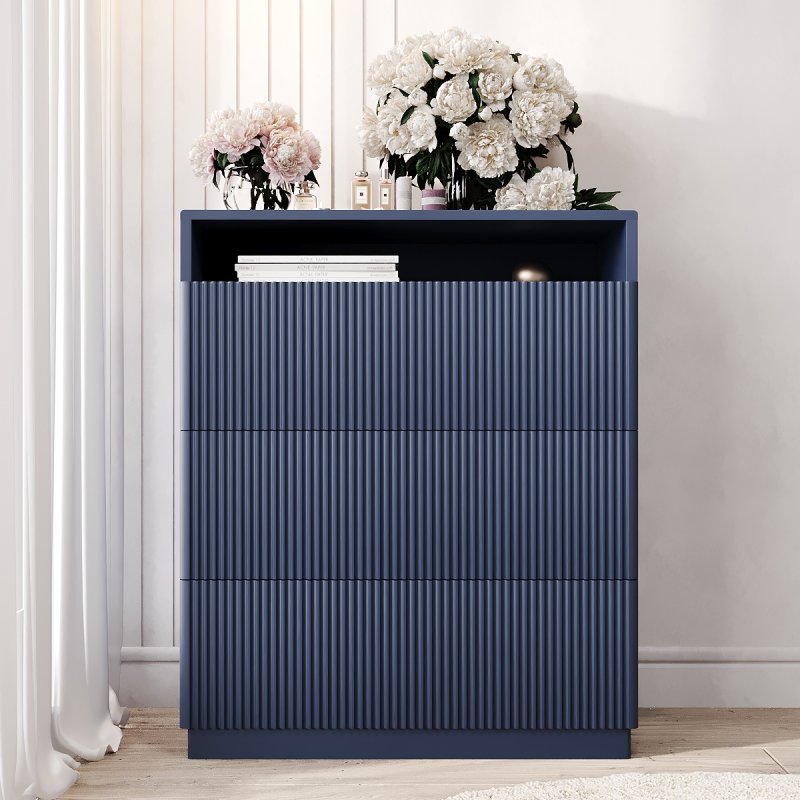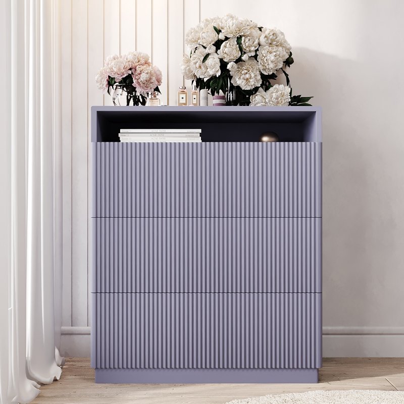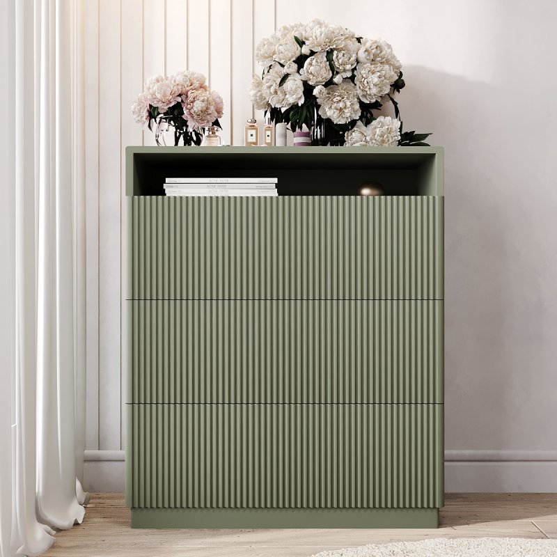 Виріб має досить компактні (830х860х400 мм), але місткі габарити. Виконано з якісно МДФ, що гарантує Вам надійність, екологічність та стійкість до впливу зовнішніх факторів. Фасади комода фрезеровані, пофарбовані спеціальною емаллю, а сама конструкція прямокутна, що додає стилю і гарантовано стане родзинкою Вашої кімнати. Ми надаємо широку кольорову гаму для фарбування на вибір. Так Ви зможете підібрати найкращий варіант для Вашого простору. Для зберігання потрібних Вам речей надані 3 місткі та зручні висувні ящики з системою відкриття push to open, а також з плавними та абсолютно безшумними напрямними.