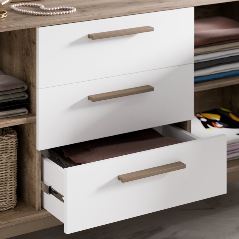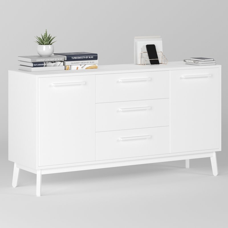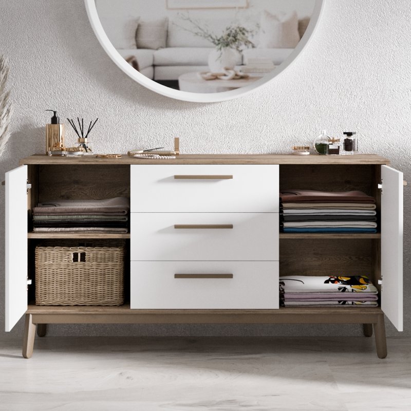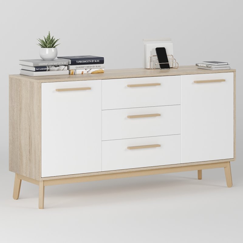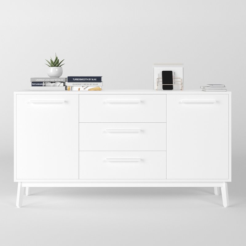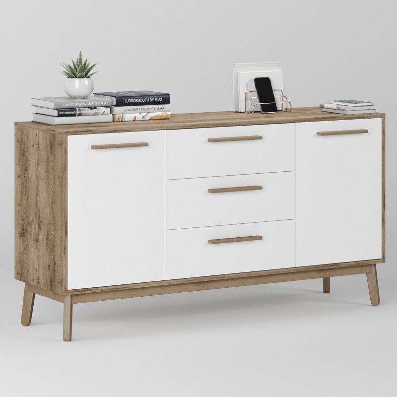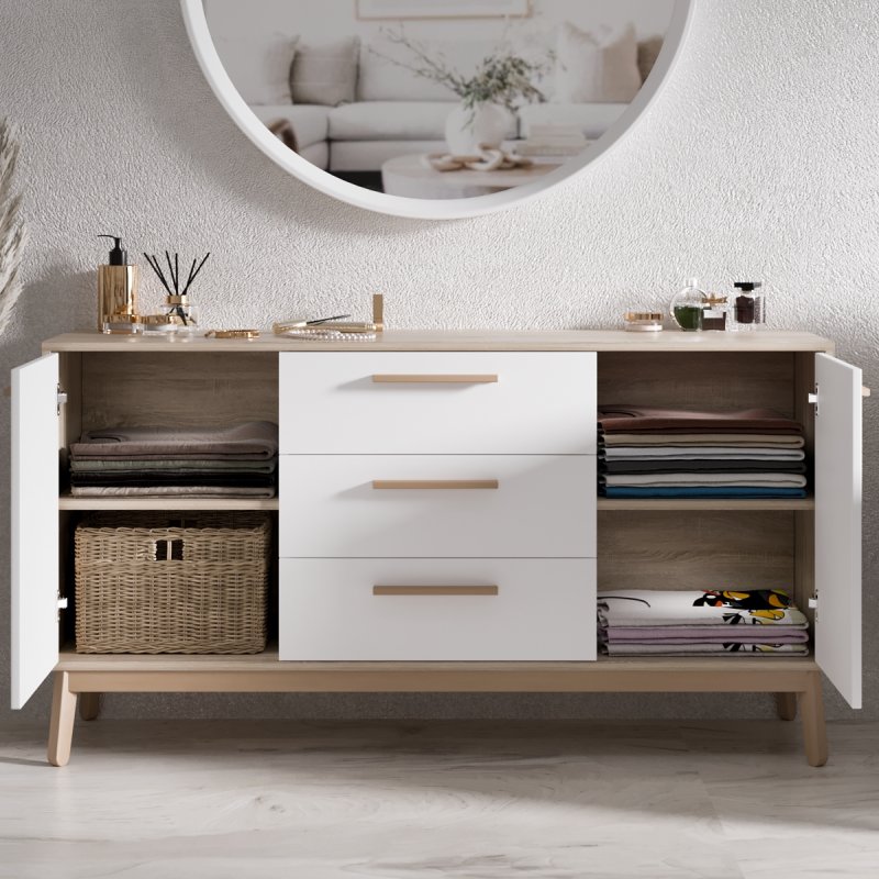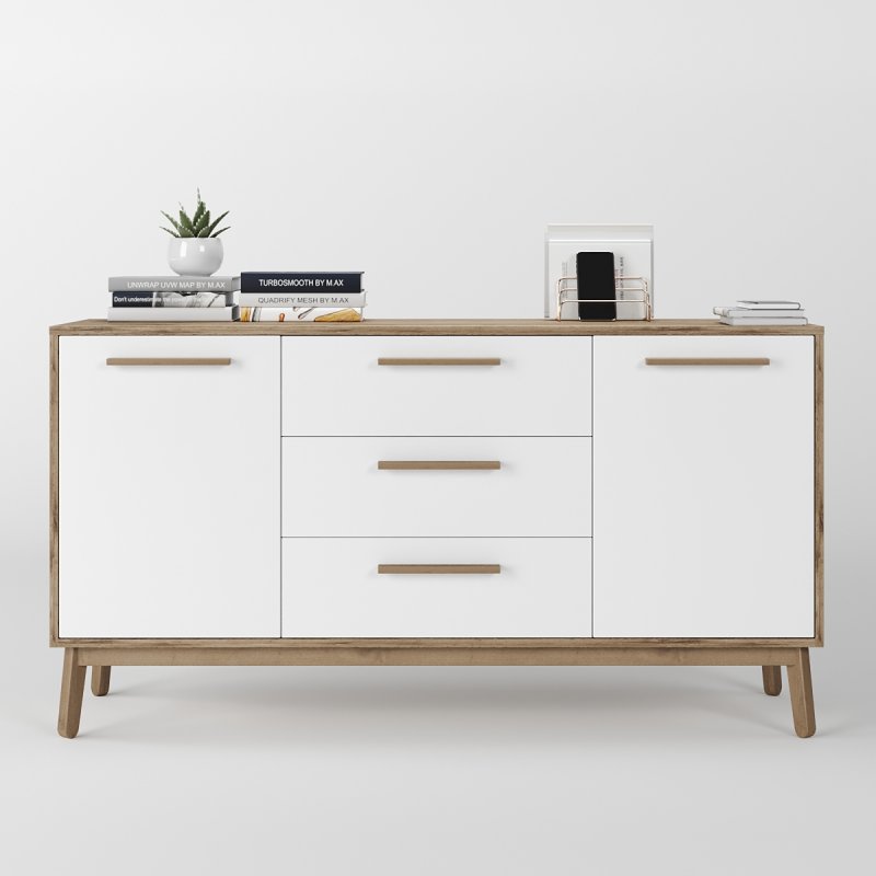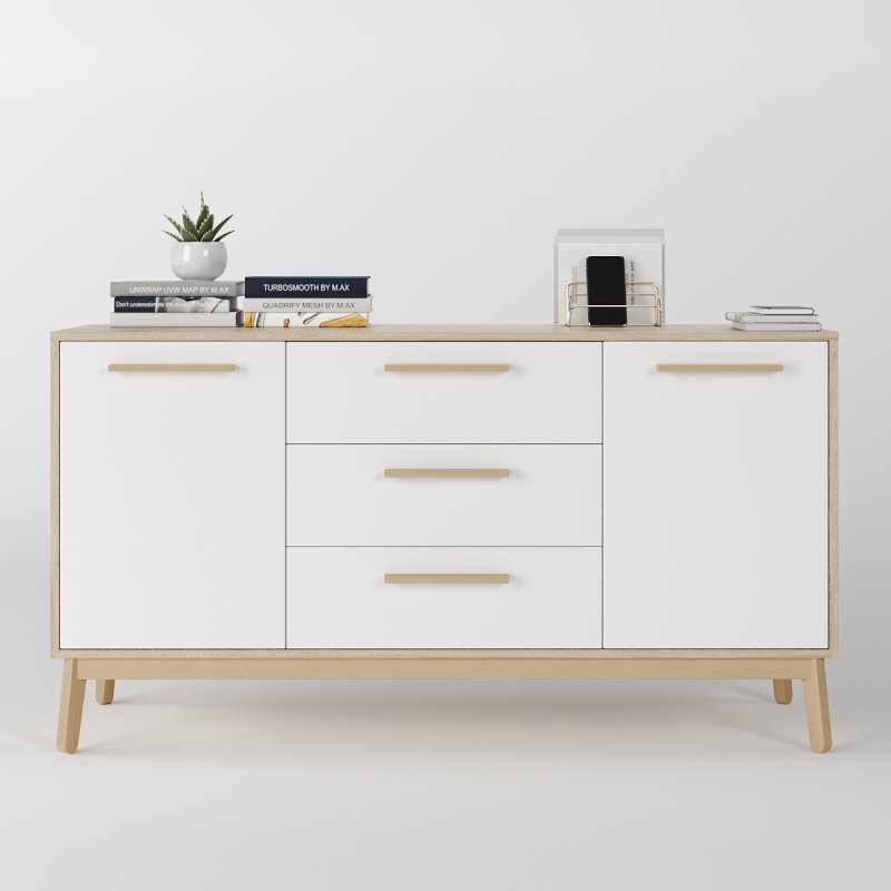 Комод досить широкий, вміщує дві просторі ніші з боків і три висувних ящика посередині. Глибина виробу дозволяє без особливих зусиль розмістити різноманітні речі. Висота сприяє розміщенню телевізора, дзеркала або картини, тумба буде гармонійно виглядати з такими одиницями. Габаритні розміри моделі становлять (В/Ш/Г): 750×1400×400 мм.