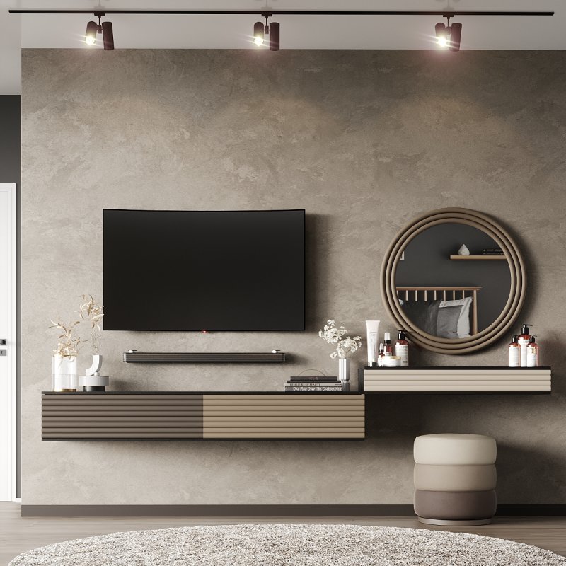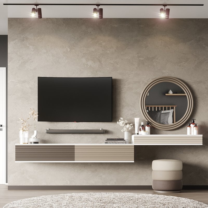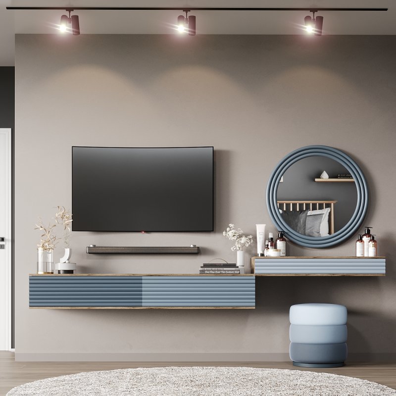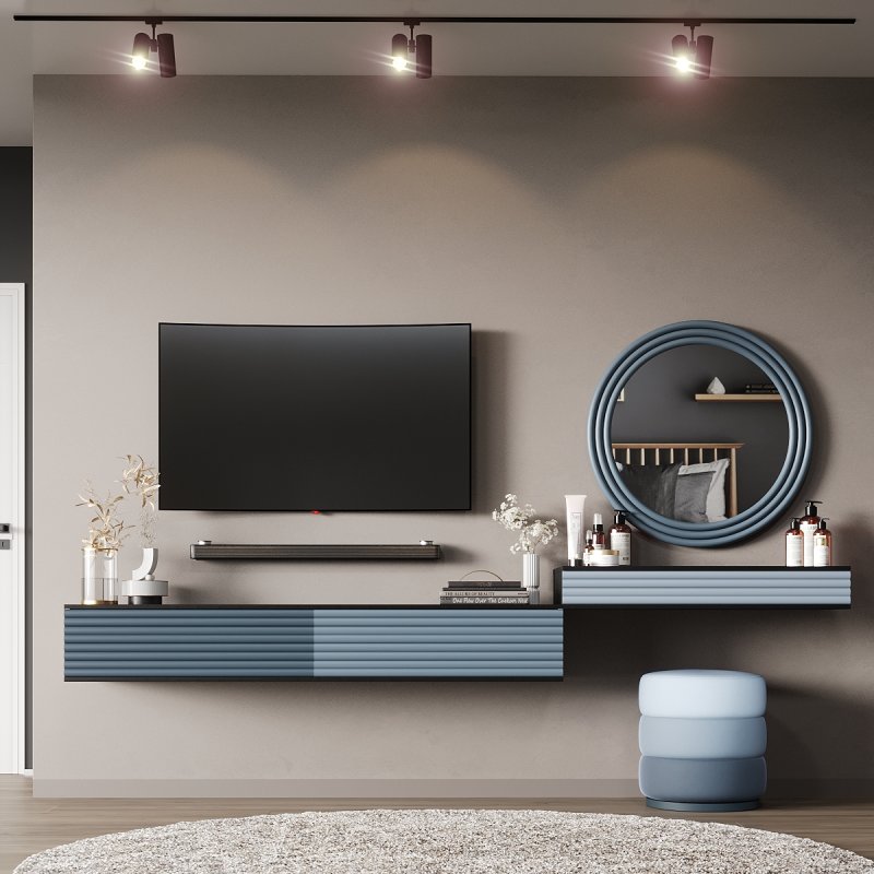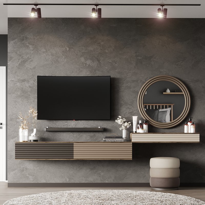 Спальня для кожного з нас – місце відпочинку, місце сили, сну та усамітнення. Кожен куточок повинен доповнювати один одного, створюючи максимально комфортну та затишну атмосферу. Пропонуємо створити її за допомогою наших меблів. Перед Вами комплект, в який входить тумба під TV, трюмо з дзеркалом і пуф. Габаритні розміри навісної тумби 275*1700*330 мм (В/Ш/Г), вона має дві місткі висувні ящики зі зручною системою відкриття push to open. Її габарити з легкістю дозволять Вам розмістити всі необхідні речі, будь то постільна білизна чи піжама, книги чи журнали, аксесуари чи елементи декору. Акцентуємо Вашу увагу на тому, що тумба виготовлена з якісного ЛДСП та фрезерованого МДФ. Ці матеріали досить стійкі до впливу зовнішніх факторів, тому складного догляду за меблями Вам не потрібно.