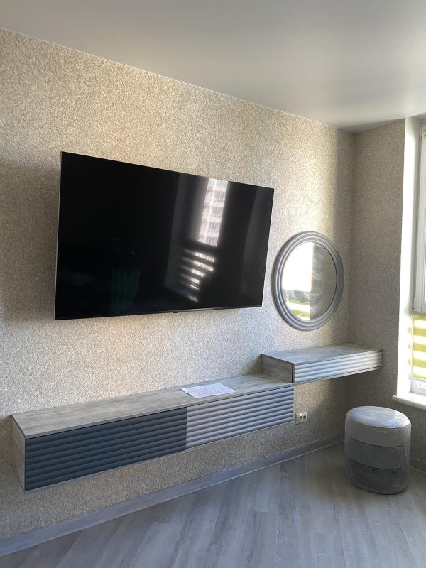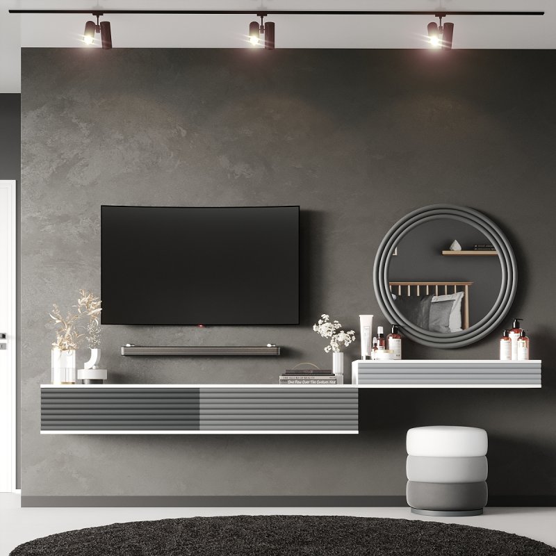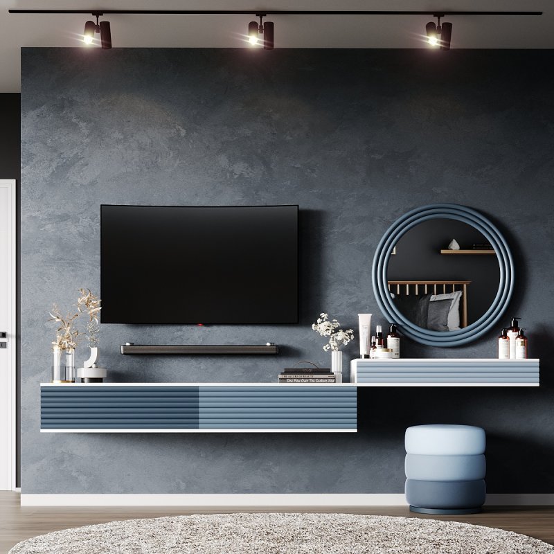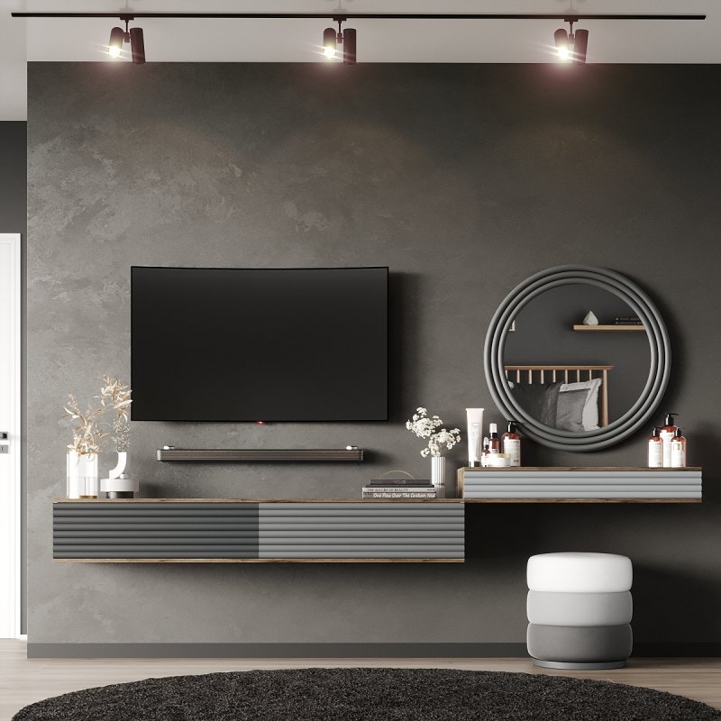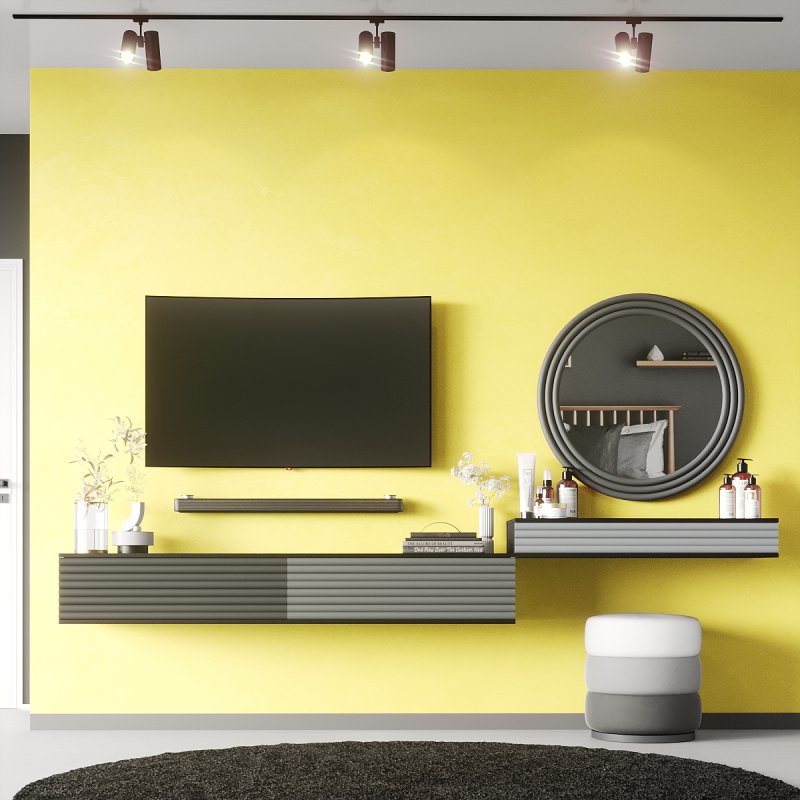 Спальня для кожного з нас – місце відпочинку, місце сили, сну та усамітнення. Кожен куточок повинен доповнювати один одного, створюючи максимально комфортну та затишну атмосферу. Пропонуємо створити її за допомогою наших меблів. Перед Вами комплект, в який входить тумба під TV, трюмо з дзеркалом і пуф. Габаритні розміри навісної тумби 275*1700*330 мм (В/Ш/Г), вона має дві місткі висувні ящики зі зручною системою відкриття push to open. Її габарити з легкістю дозволять Вам розмістити всі необхідні речі, будь то постільна білизна чи піжама, книги чи журнали, аксесуари чи елементи декору. Акцентуємо Вашу увагу на тому, що тумба виготовлена з якісного ЛДСП та фрезерованого МДФ. Ці матеріали досить стійкі до впливу зовнішніх факторів, тому складного догляду за меблями Вам не потрібно.