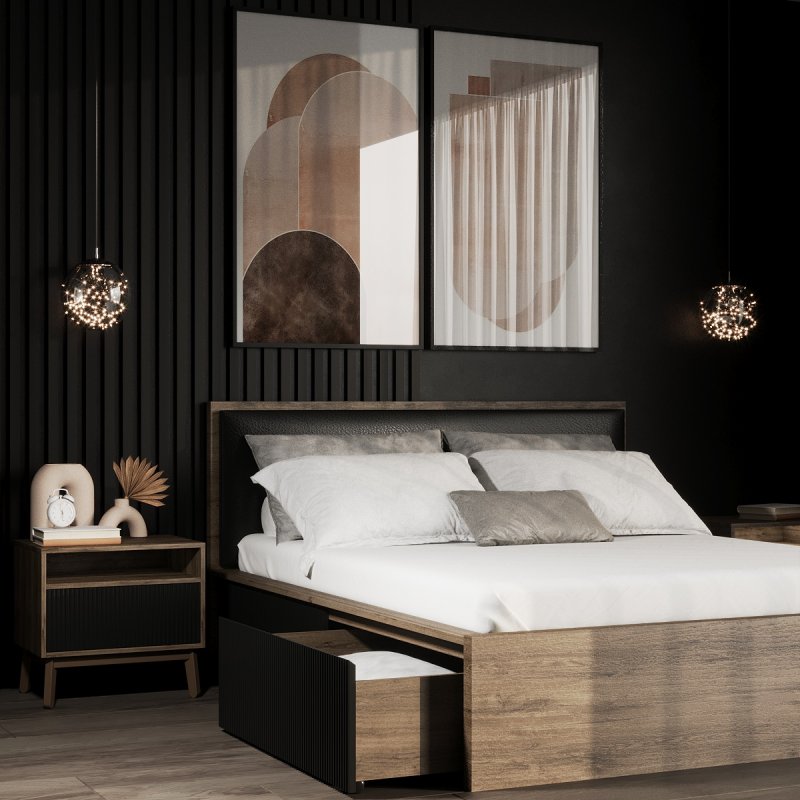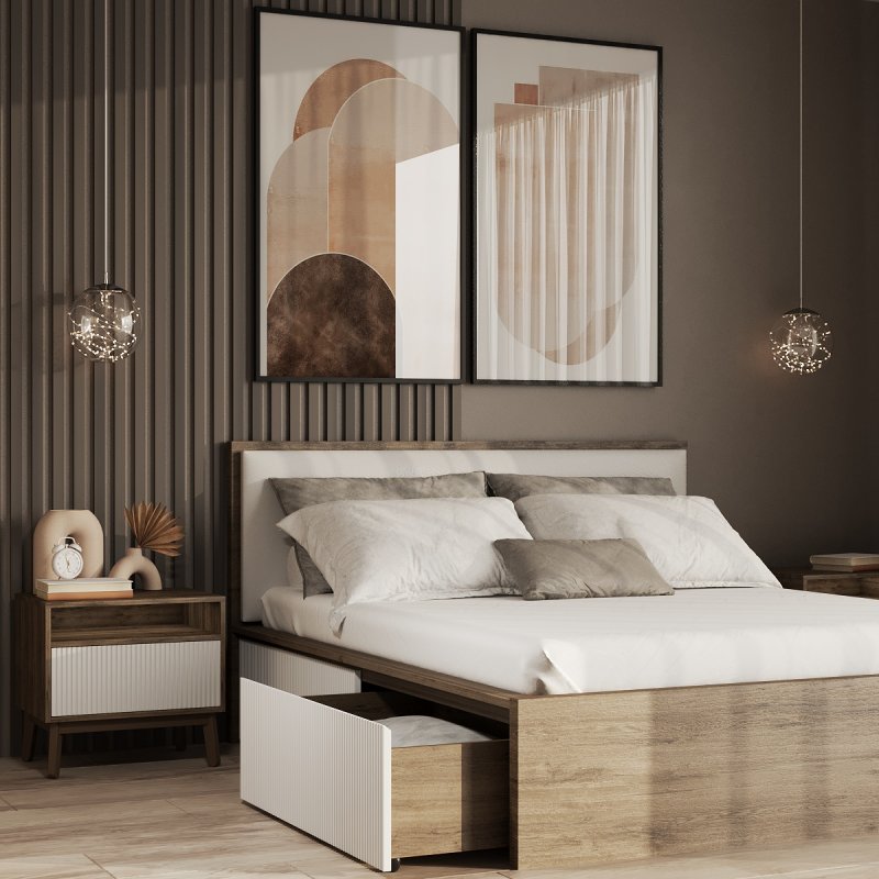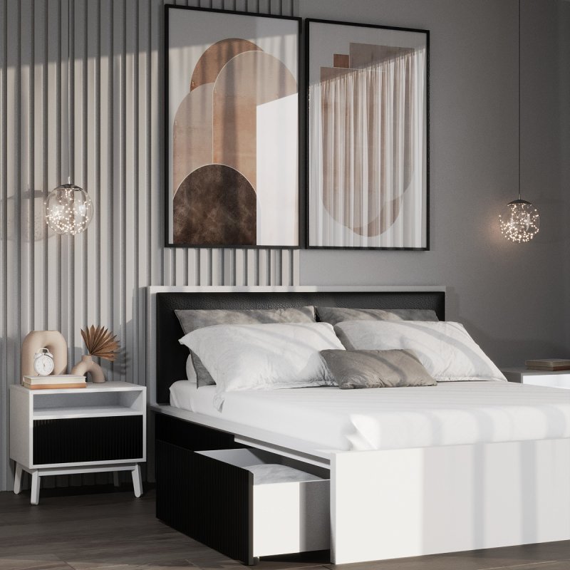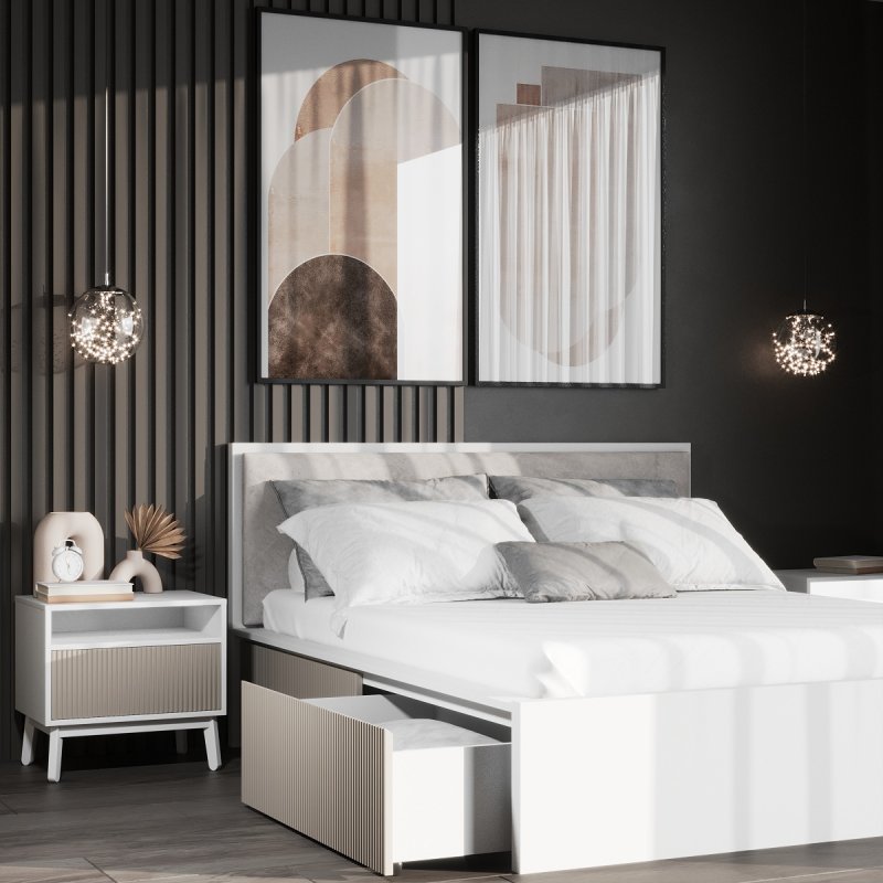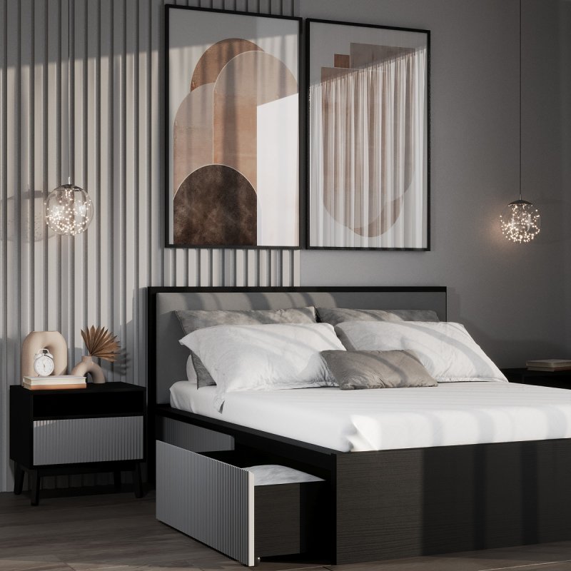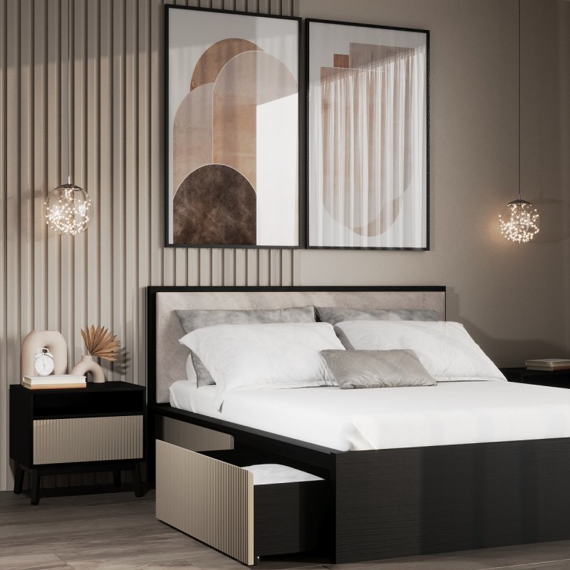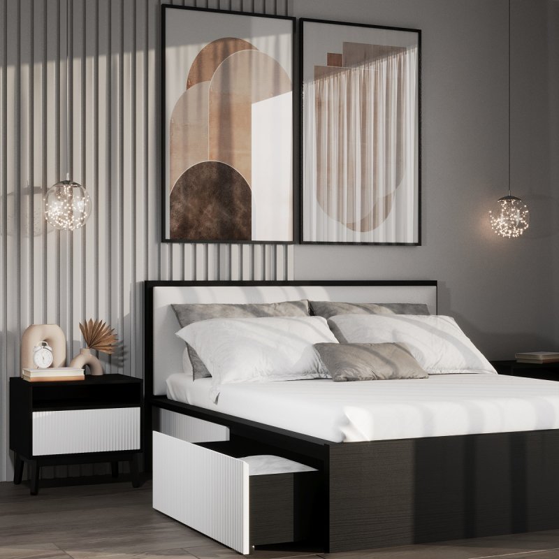 Виготовлено ліжко з якісних матеріалів - ДСП та МДФ. Міцний масивний каркас забезпечує стійкість виробу та надає йому солідності та надійності. А наявність висувних ящиків робить ліжко максимально функціональним, дозволяючи сховати в них додаткові комплекти спальної білизни чи інші необхідні речі. Сучасний механізм відкриття Push to open набирає все більшої популярності, завдяки своїй зручності в експлуатації та відсутності зайвих деталей у вигляді ручок. Ліжко двоспальне з ящиками за місткістю замінить собою комод, даючи можливість заощадити простір. Внутрішній розмір ящиків 97х59.