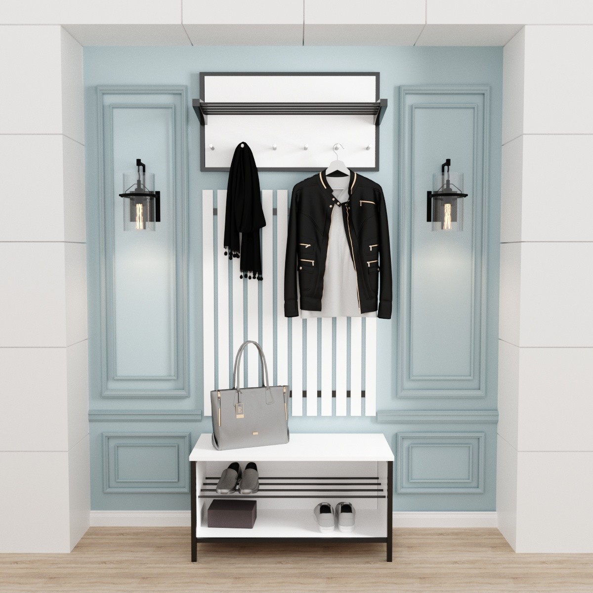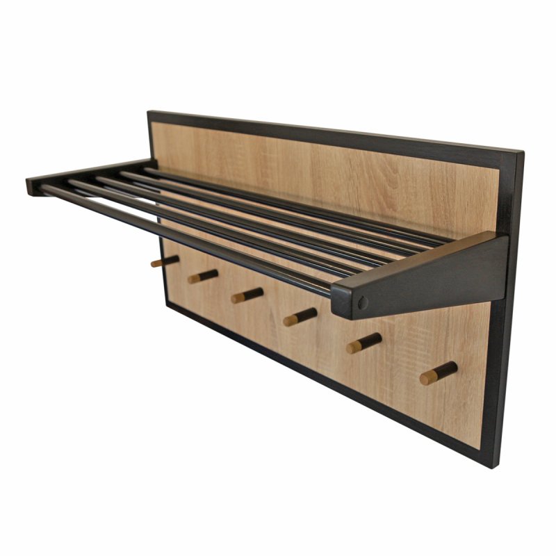 Вішалка має містку полицю для головних уборів та аксесуарів, виготовлену з п'яти металевих трубок, пофарбованих спеціальною порошковою фарбою. Трубки надійно зафіксовані у фігурних бічних елементах масиву берези. З метою захисту від вологи та впливу інших негативних факторів, а також надання стильного зовнішнього вигляду, дерев'яні складові пофарбовані тонованим лаком у тон з полицею.