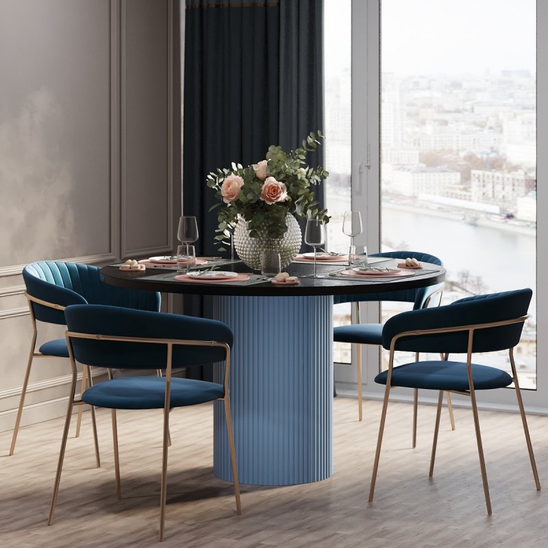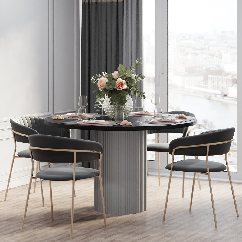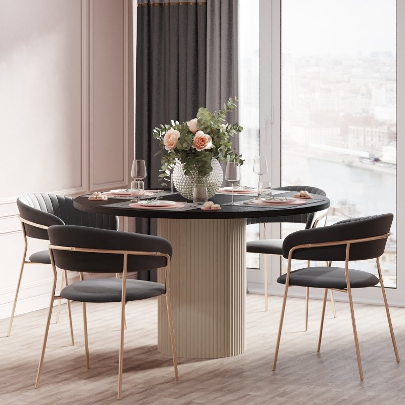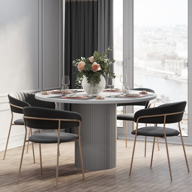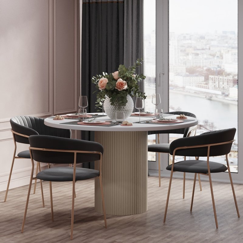 Варіанти стільниці представлені на вибір в білому, чорному або аліканте кольорах. Палітра каркасу не залишить байдужим поціновувачів сучасного стилю в інтер’єрі: попіл, лазур або какао. Переваги круглої форми столу беззаперечні: відсутність гострих кутів, безпечне використання, раціональне використання простору кімнати. Безумовно, універсальний виріб дозволяє розмістити більшу кількість людей. Фрезовані фасади створюють незвичну атмосферу затишку та теплої атмосфери оселі.