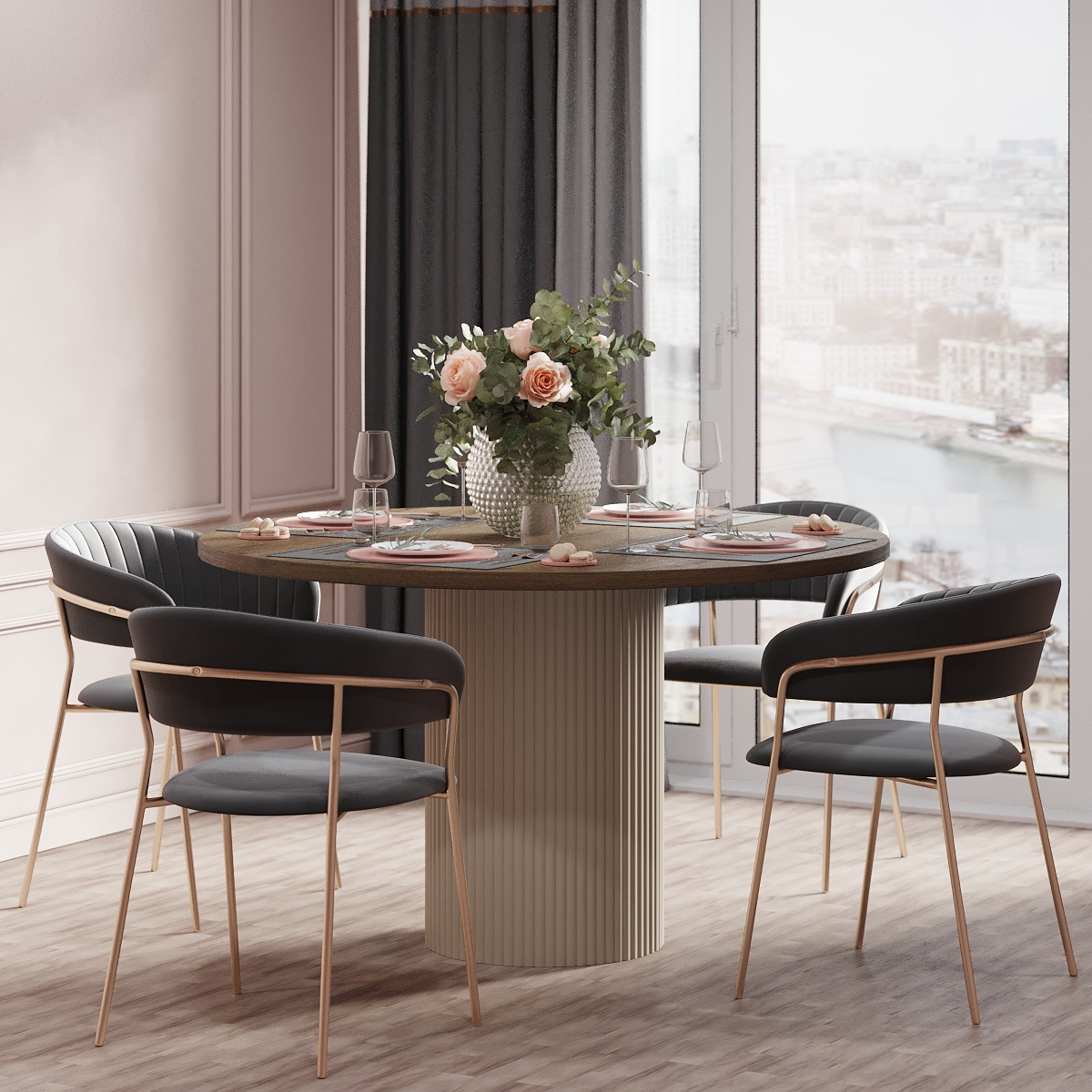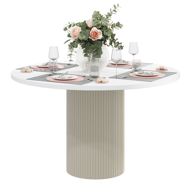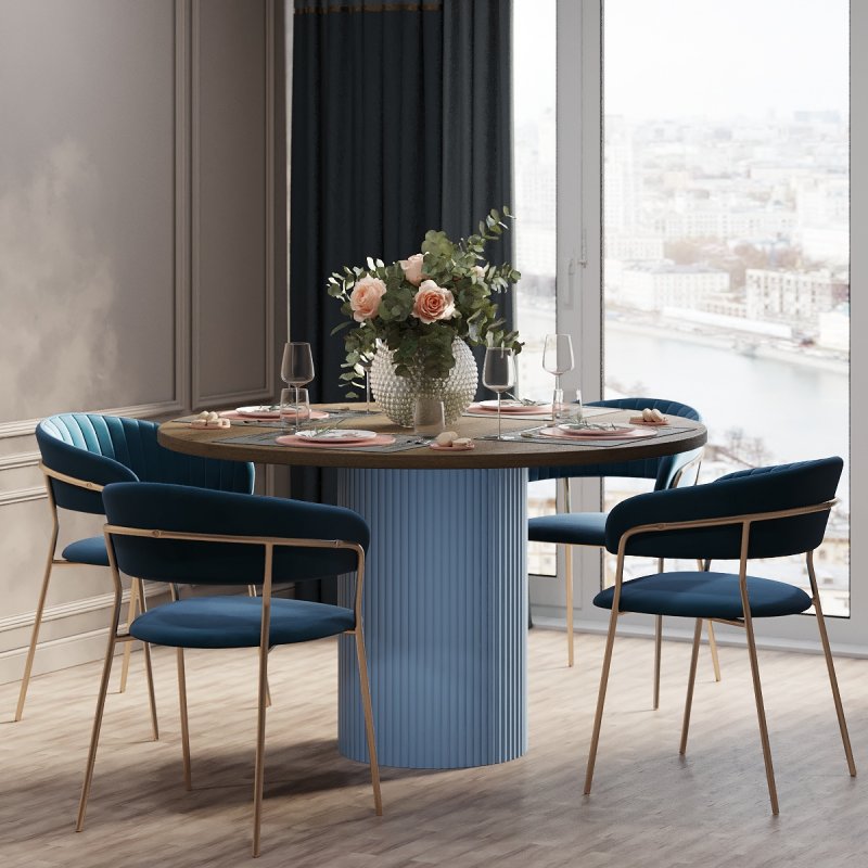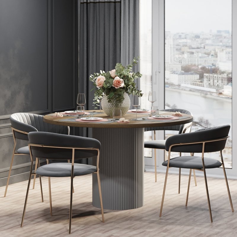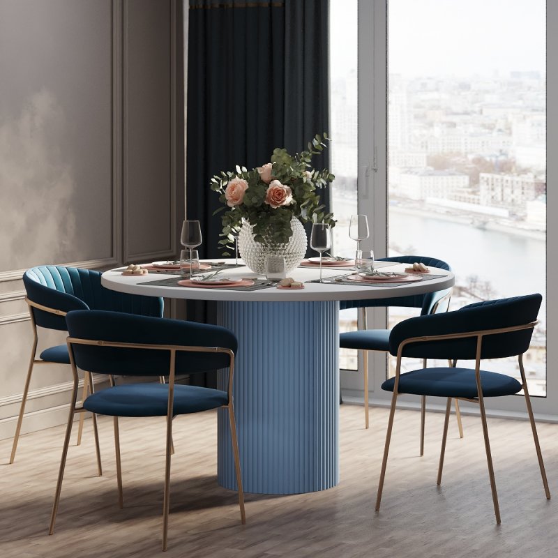 Варіанти стільниці представлені на вибір в білому, чорному або аліканте кольорах. Палітра каркасу не залишить байдужим поціновувачів сучасного стилю в інтер’єрі: попіл, лазур або какао. Переваги круглої форми столу беззаперечні: відсутність гострих кутів, безпечне використання, раціональне використання простору кімнати. Безумовно, універсальний виріб дозволяє розмістити більшу кількість людей. Фрезовані фасади створюють незвичну атмосферу затишку та теплої атмосфери оселі.