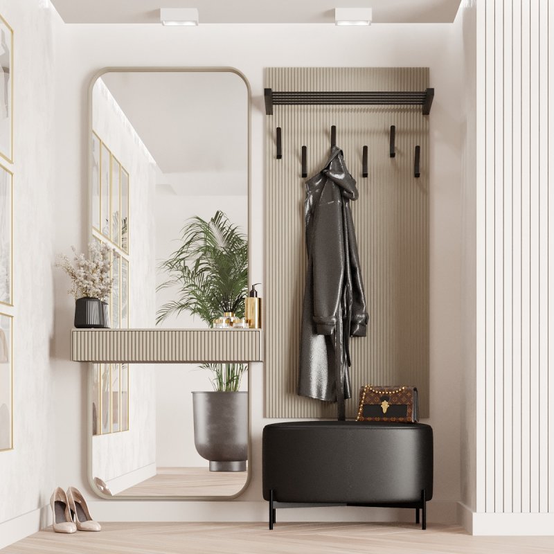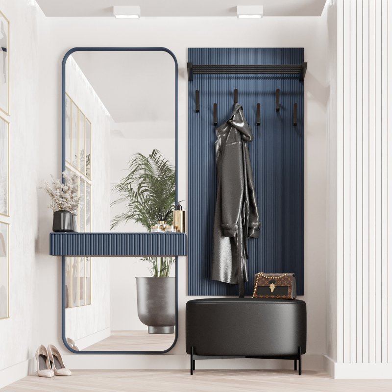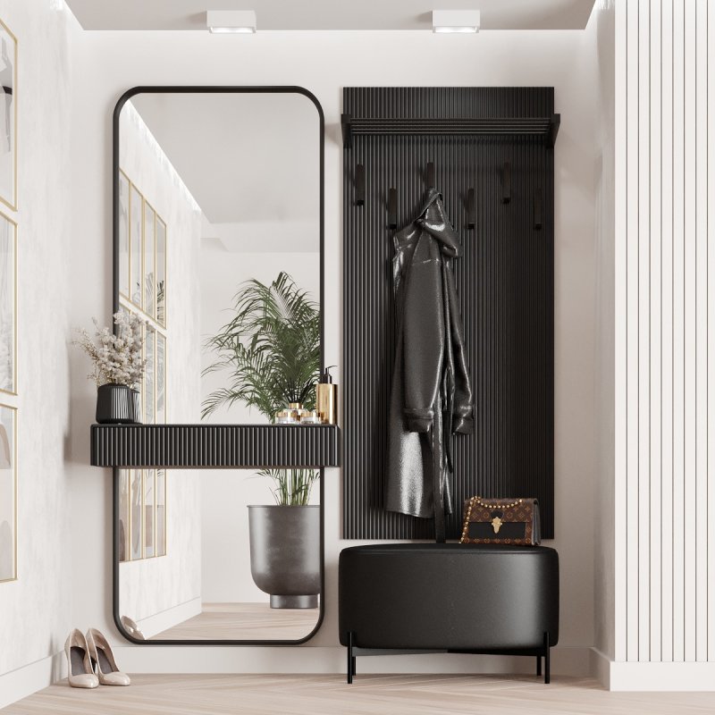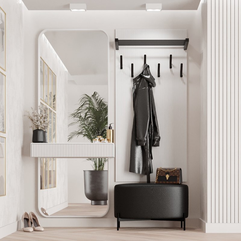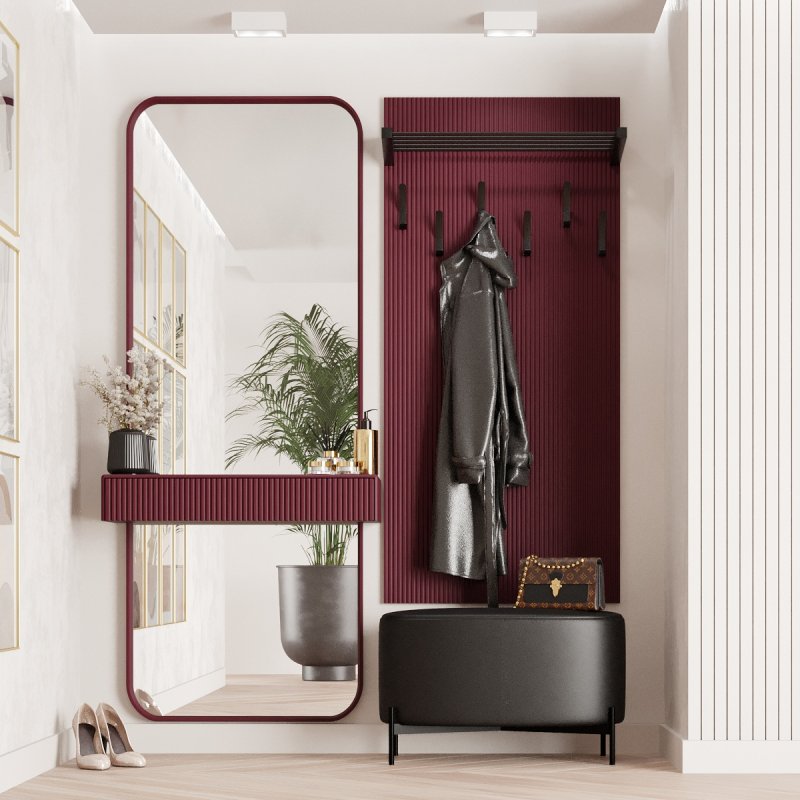 Готовий передпокій має велику палітру кольорів і доступний в наступних відтінках: білий, чорний, марсал, оливковий, корал, фіалковий, капучіно, темний лазур. Вішак має шість гачків для верхнього одягу та полицю для головних уборів або аксесуарів. Дзеркало також укомплектоване полицею та має нішу для косметики або декору. Комплект у передпокій – це прекрасна частина домашнього інтер'єру, яка додасть вашій оселі стилю і смаку.