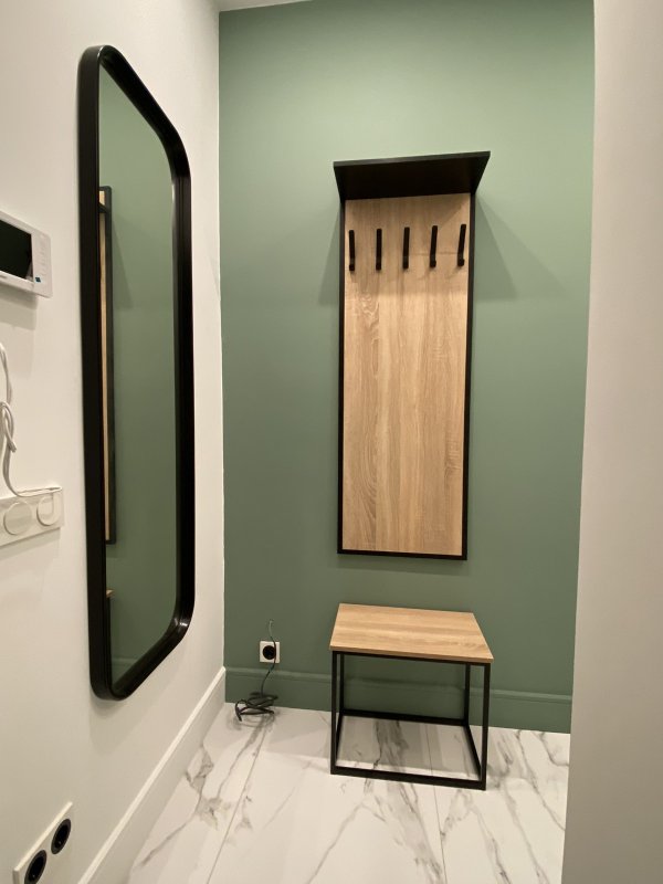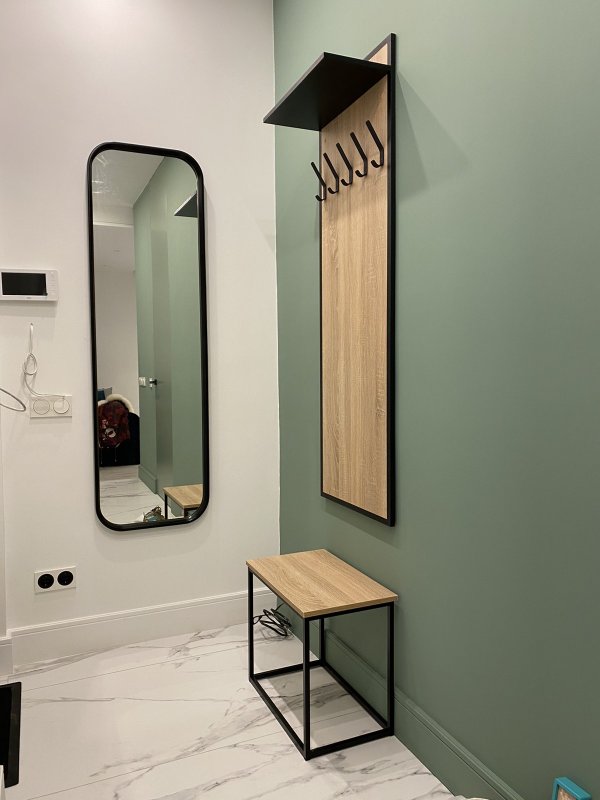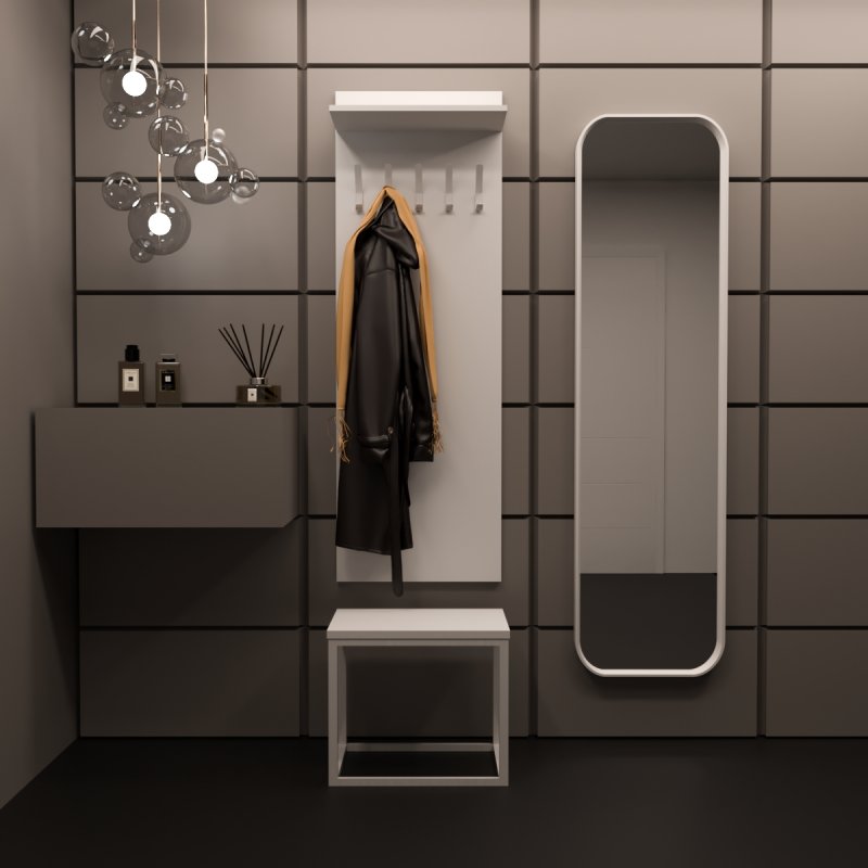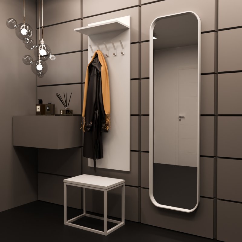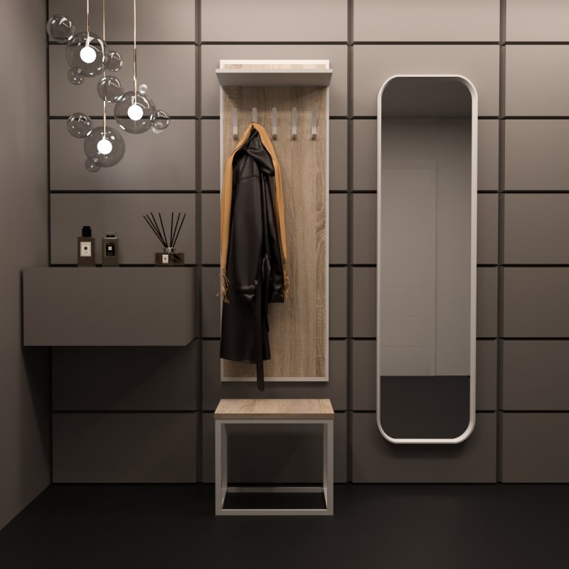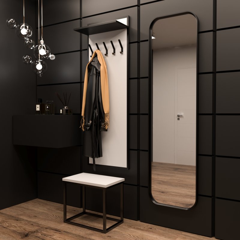 Наш комплект меблів для передпокою включає три основні елементи, незамінні в домашньому побуті. Вішак настінний Міранда 2 - компактна і зручна модель, виконана з ламінованої ДСП товщиною 16 мм. Вішак має полицю для аксесуарів та п'ять надійних металевих гачків для верхнього одягу. Рамка і гачки контрастного чорного кольору, що надає виробу певної брутальності. Габаритні розміри вішалки становлять (В/Ш/Г): 1480х500 х236 мм.