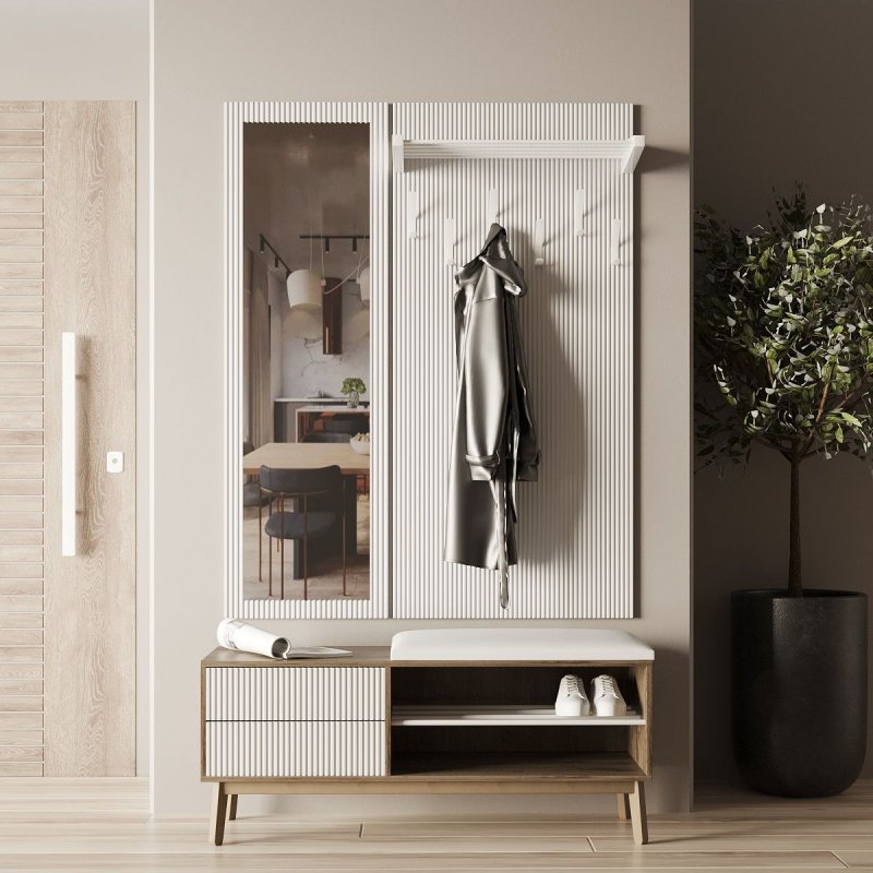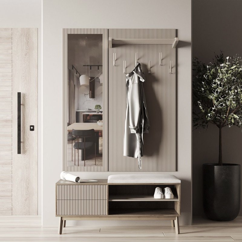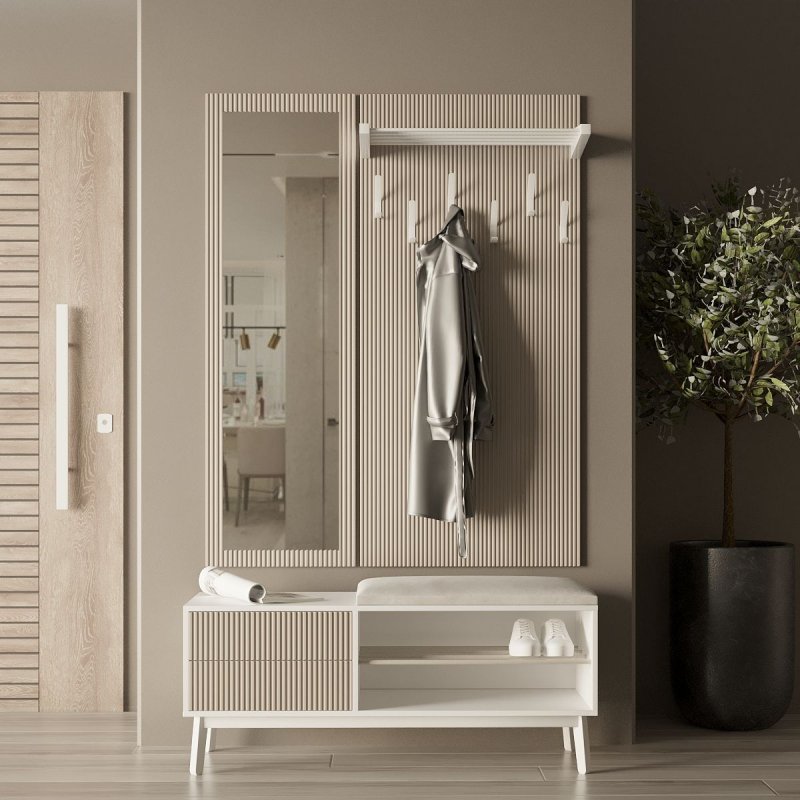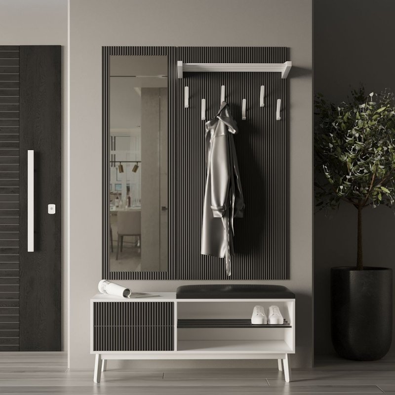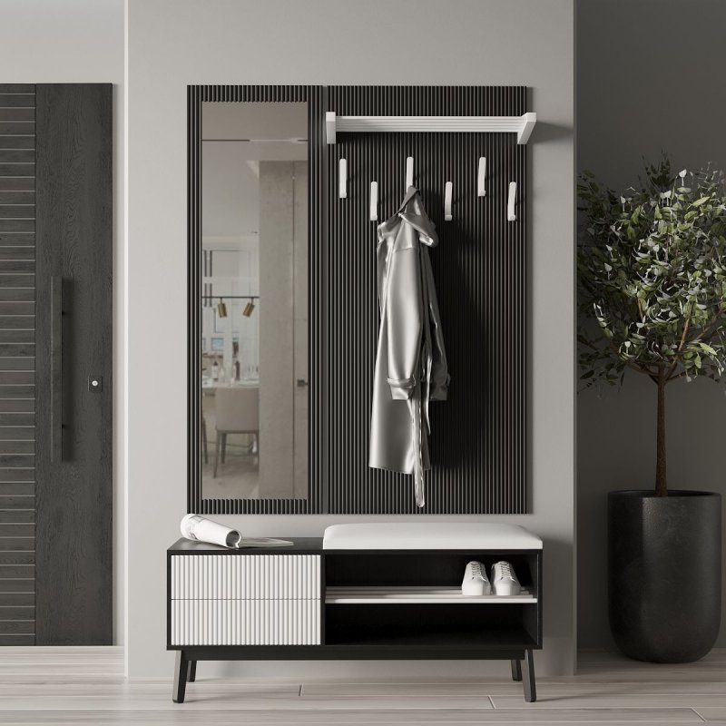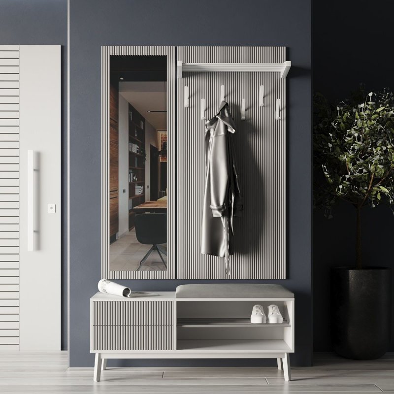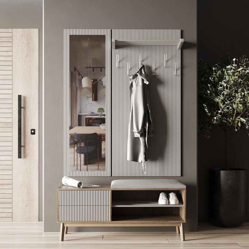 Вішак кріпиться безпосередньо на стіну, що значно заощаджує простір. Це є дуже важливим критерієм, особливо якщо передпокій маленький, і потрібний компактний варіант. Функціональність вішака полягає в тому, що він включає як гачки для верхнього одягу, так і поличку для головних уборів. Гармонічним завершенням даного комплекту є дзеркало, розміри якого (1500х485х20мм) максимально зручні для огляду на повний зріст.