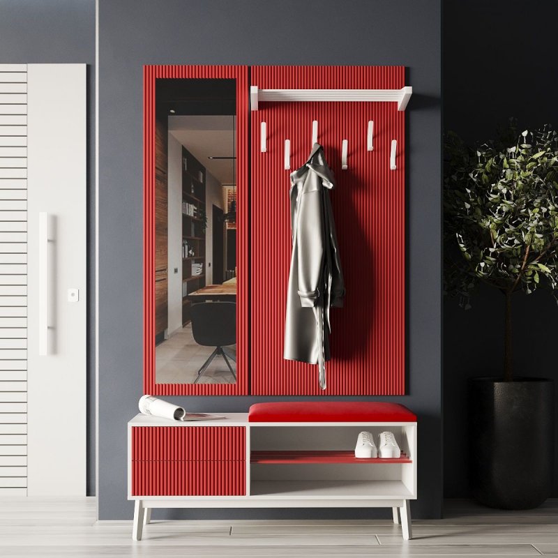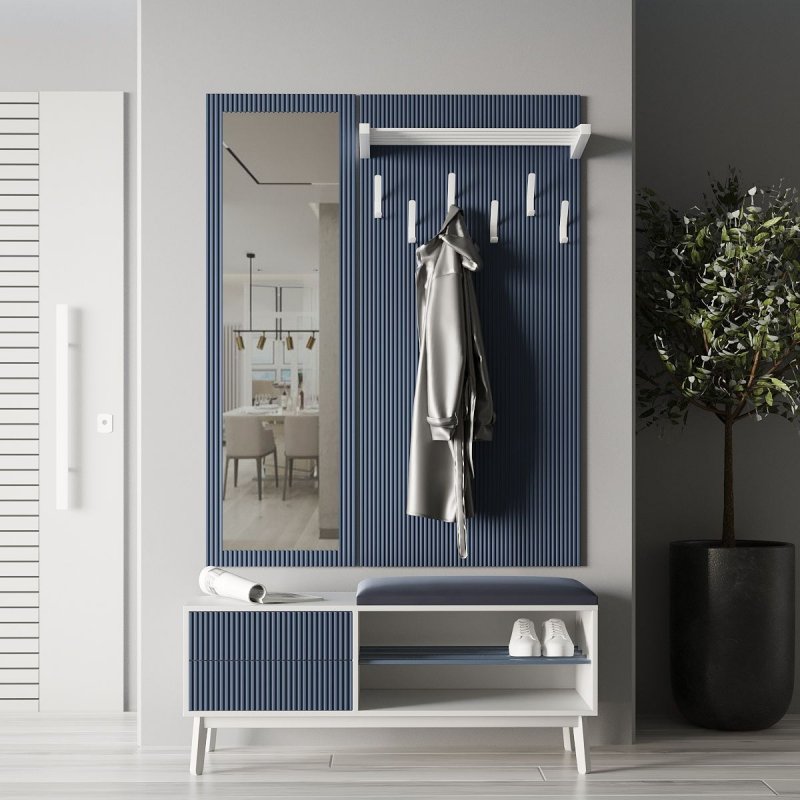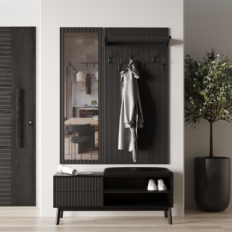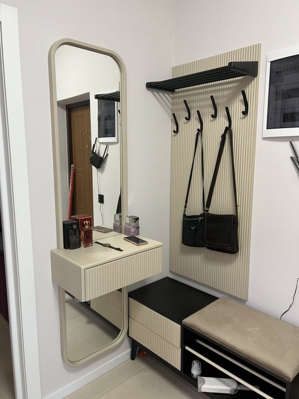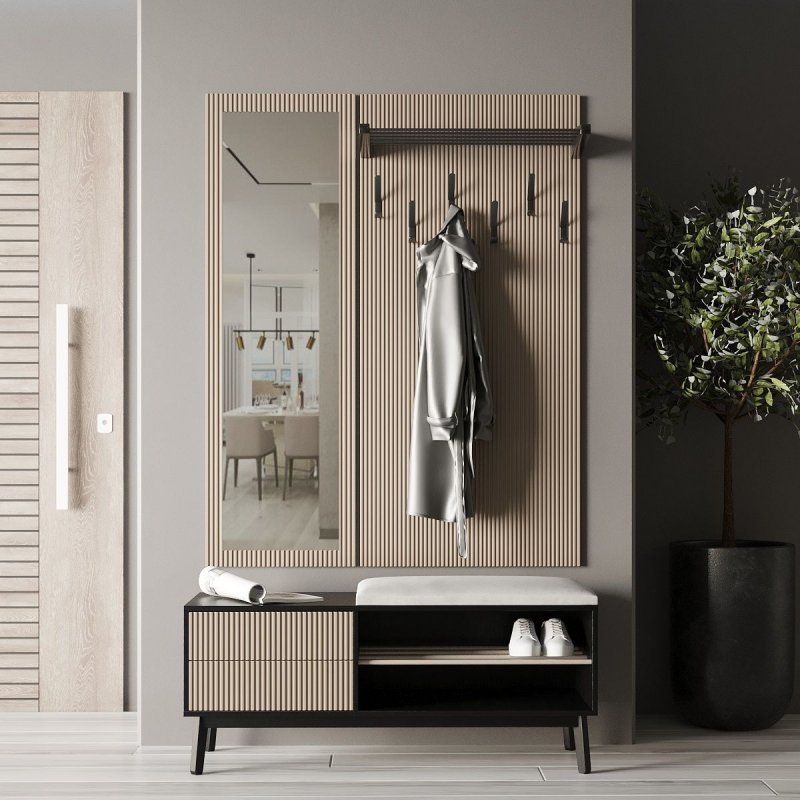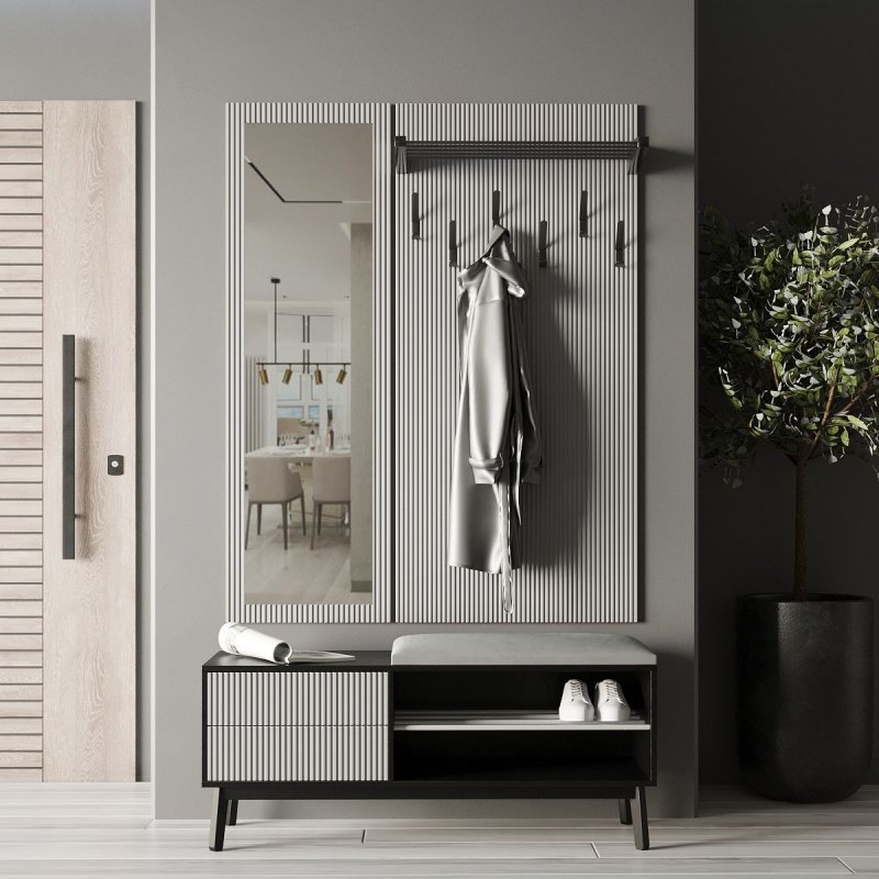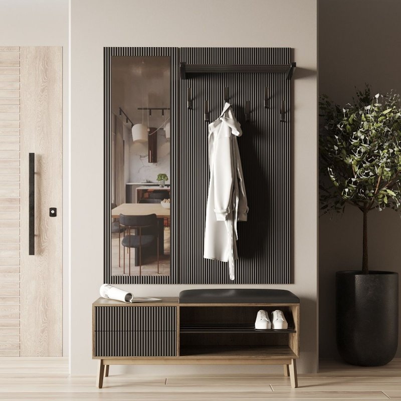 Вішак кріпиться безпосередньо на стіну, що значно заощаджує простір. Це є дуже важливим критерієм, особливо якщо передпокій маленький, і потрібний компактний варіант. Функціональність вішака полягає в тому, що він включає як гачки для верхнього одягу, так і поличку для головних уборів. Гармонічним завершенням даного комплекту є дзеркало, розміри якого (1500х485х20мм) максимально зручні для огляду на повний зріст.