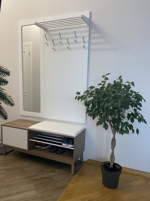 Готовий передпокій Брюссель – це поєднання сучасного стилю та функціональності. Купуючи відразу повний комплект, ви отримуєте можливість раціонально використовувати вільний простір, а також суттєво спрощуєте процес підбору меблів. Маленький передпокій у коридор складається з трьох обов'язкових предметів інтер'єру: тумба для взуття, дзеркало та вішалка для одягу. Тумба наділена двома висувними ящиками і двома відкритими полицями для взуття. На її поверхні облаштовано комфортне м'яке місце для сидіння та вільний простір для речей. Завдяки стійкості та надійності виріб може витримувати велике навантаження. Розміри 500х1200х400мм (ВхШхГ).