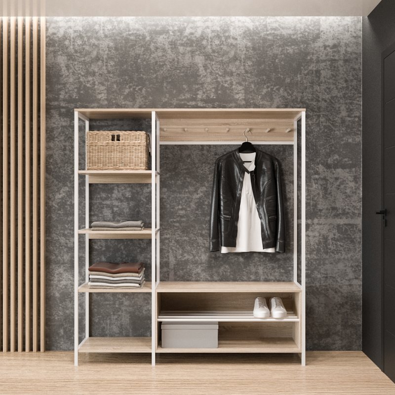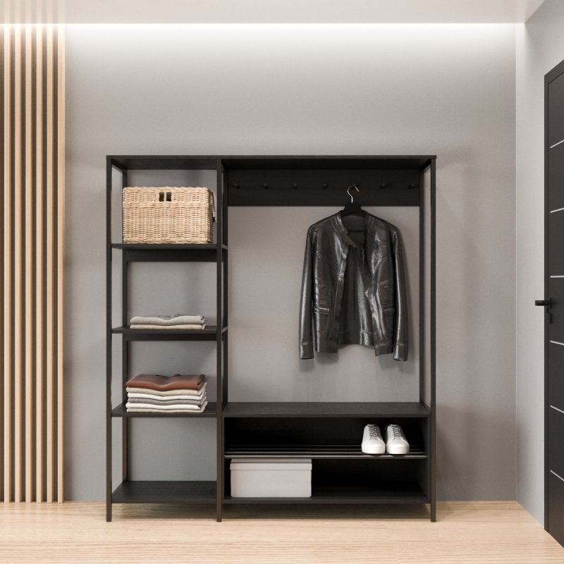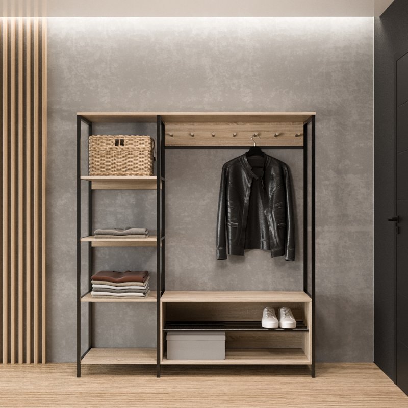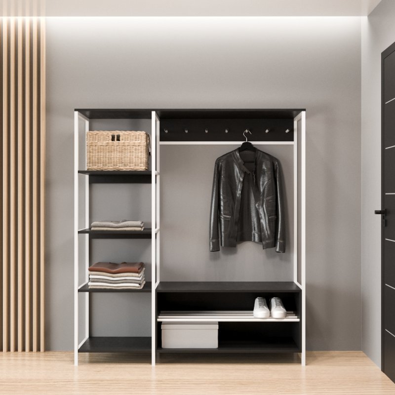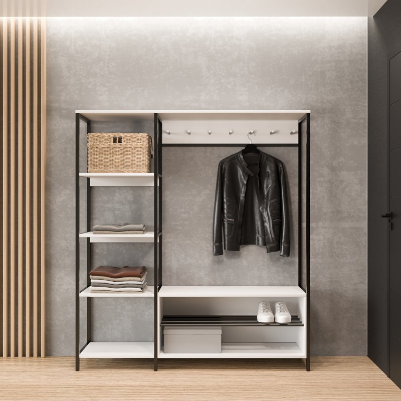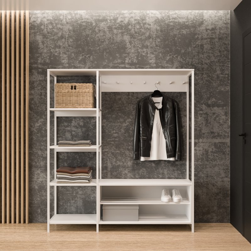 Безпосередньо під вішаком розміщується зручна та містка ніша для взуття. У ніші можна зберігати не тільки чисте домашнє взуття, а й сезонне вуличне. Спеціально розроблена центральна поличка із забарвлених металевих трубок стійка до вологи та бруду.