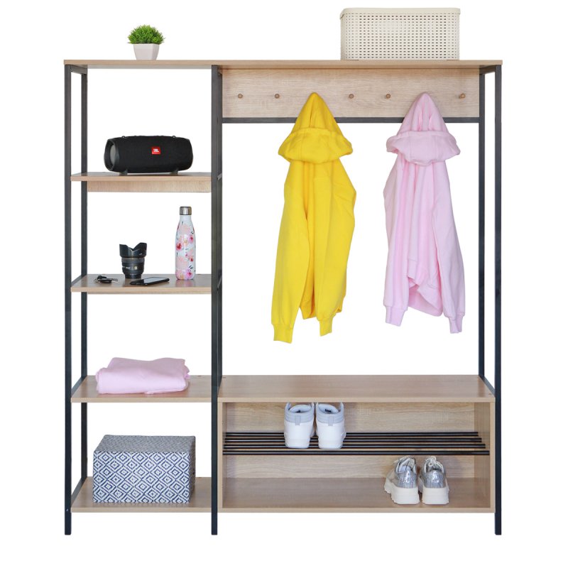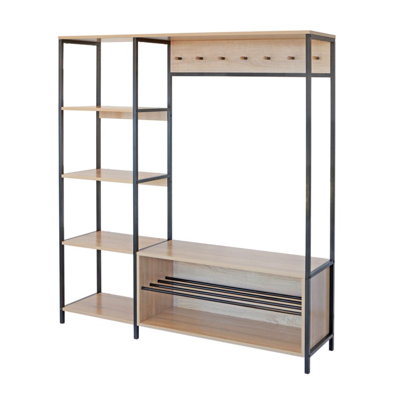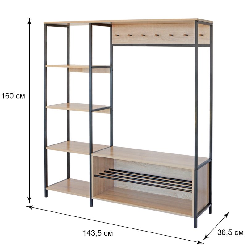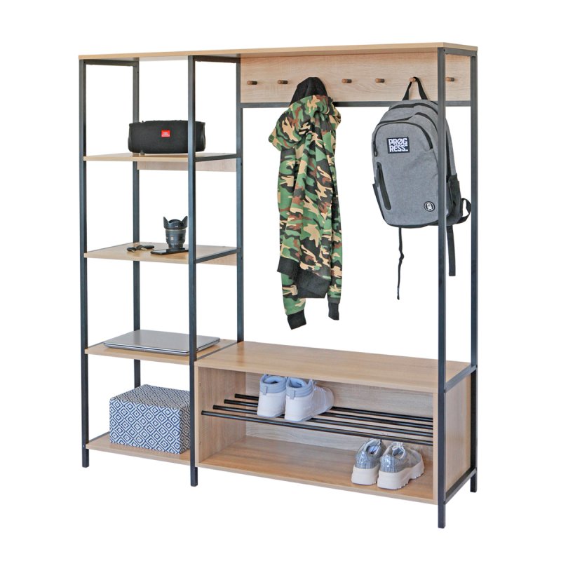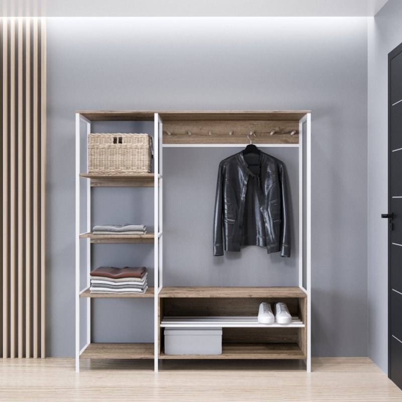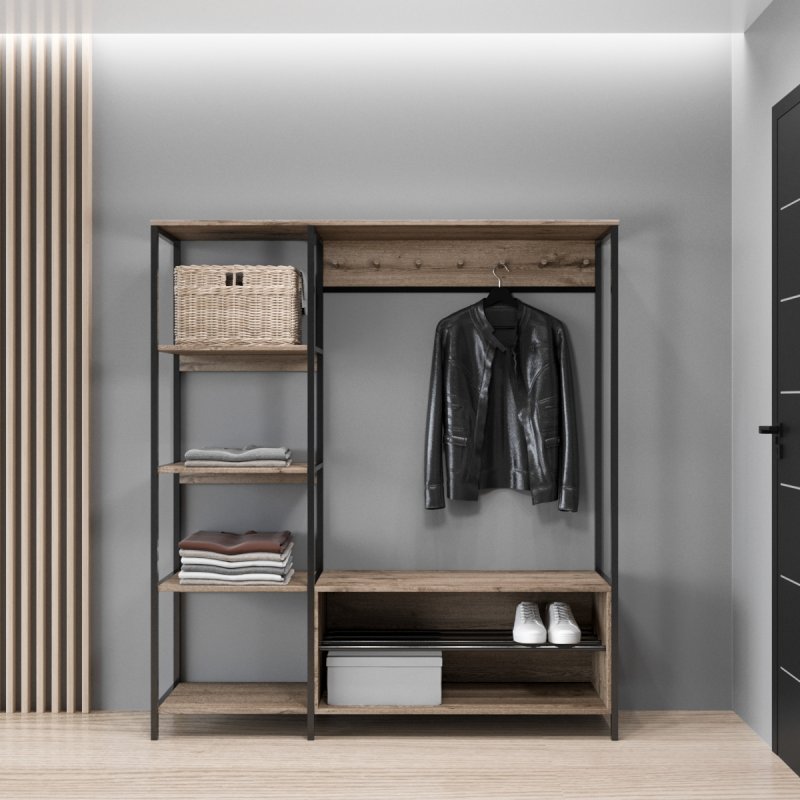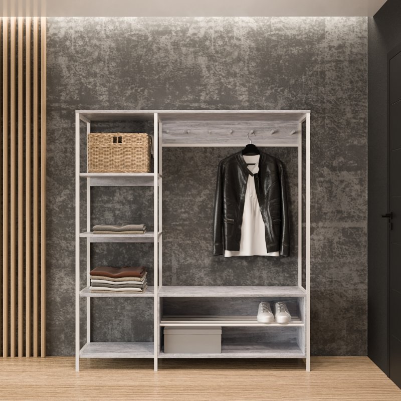 Безпосередньо під вішаком розміщується зручна та містка ніша для взуття. У ніші можна зберігати не тільки чисте домашнє взуття, а й сезонне вуличне. Спеціально розроблена центральна поличка із забарвлених металевих трубок стійка до вологи та бруду.