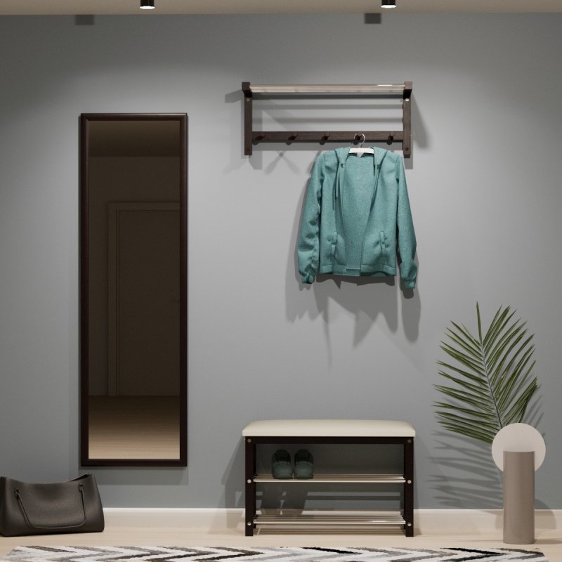 Настінний вішак "Ніколь" характеризується невеликими, але достатніми для невеликої родини розмірами (В/Ш/Г) 320×770×250 мм. Виріб повністю дерев'яний, виготовлений з масиву берези, пофарбований високоякісним меблевим лаком, який захищає поверхню від зносу та впливу вологи. Вішак має містку полицю із хромованих трубок, а також п'ять гачків для одягу. Гачки також металеві, для надійнішого розміщення одягу гачки мають на кінцях дерев'яні фіксатори в тон вішалці.