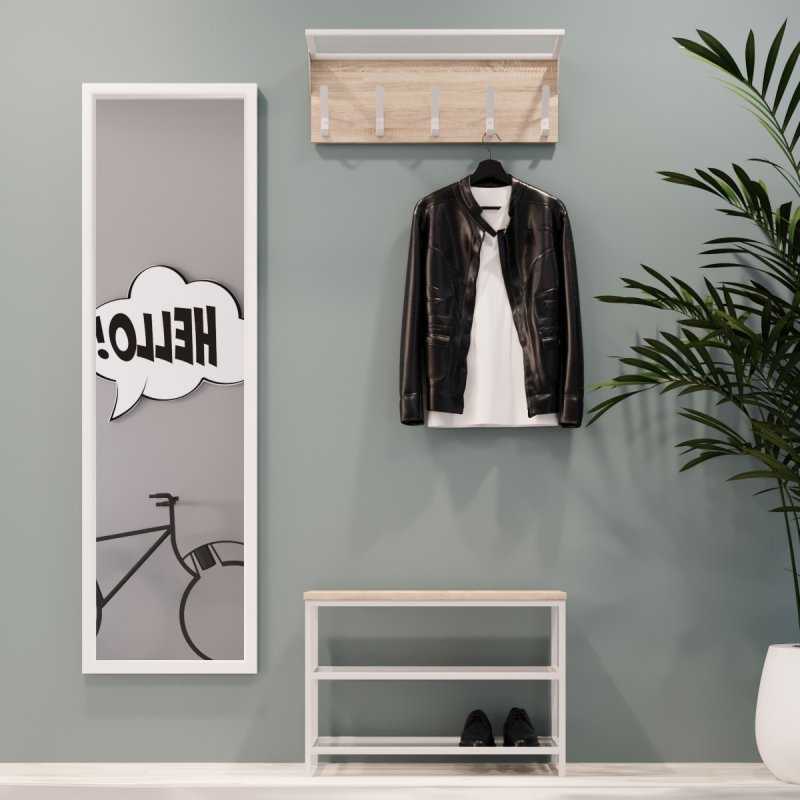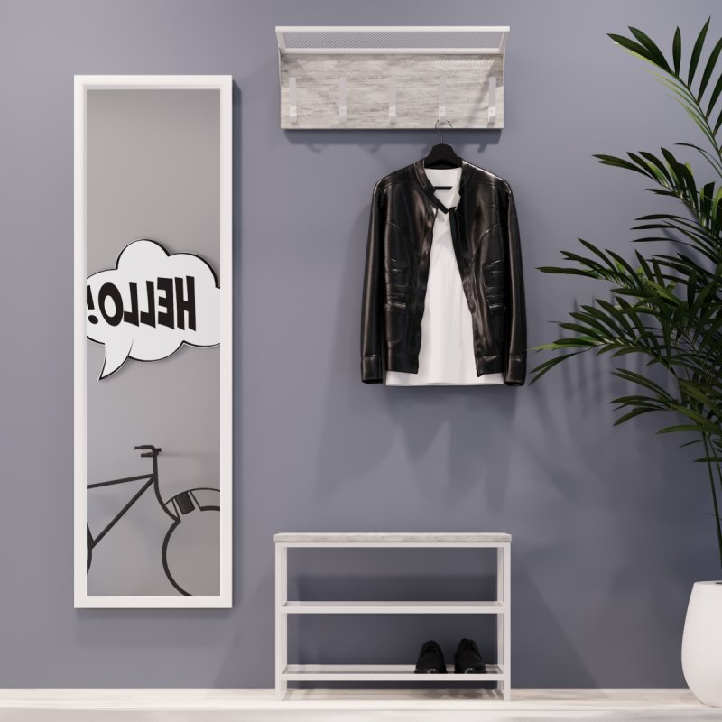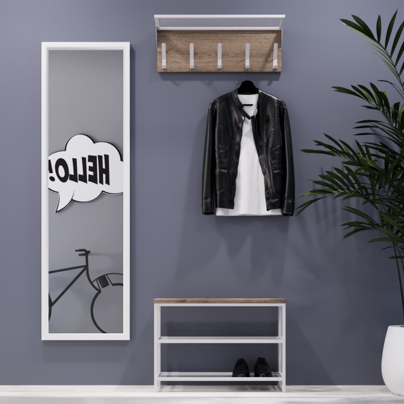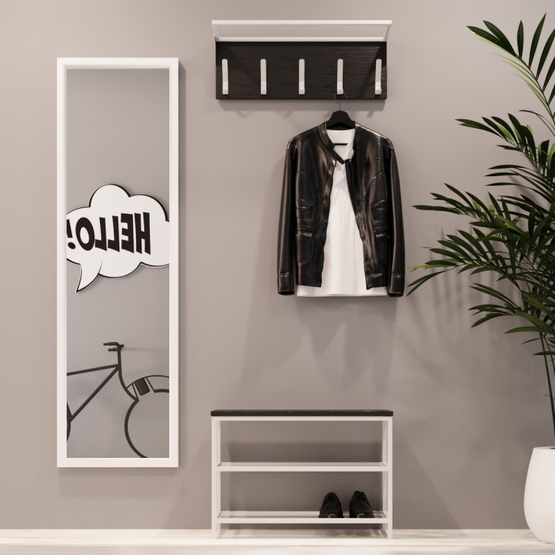 Настінний вішак "ЛТ" виконана з ЛДСП, оснащена стильною полицею-сіткою для головних уборів та аксесуарів. Контрастне поєднання холодного металу та теплої основи надає виробу фактурного та виразного вигляду, що привертають увагу всіх вхідних.