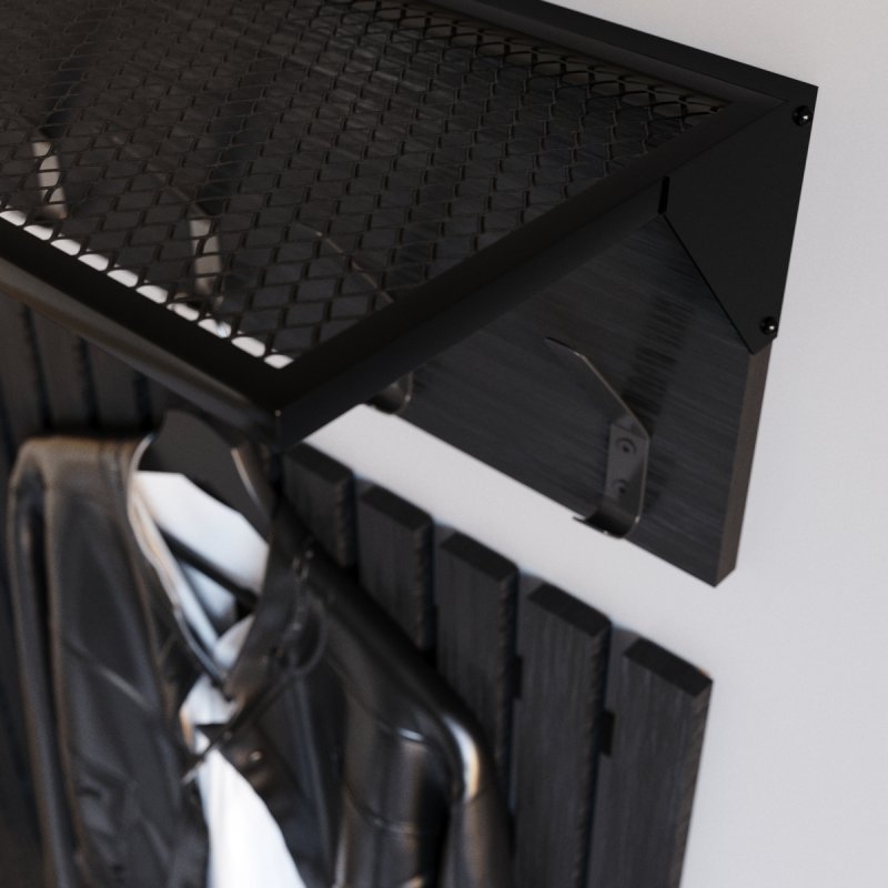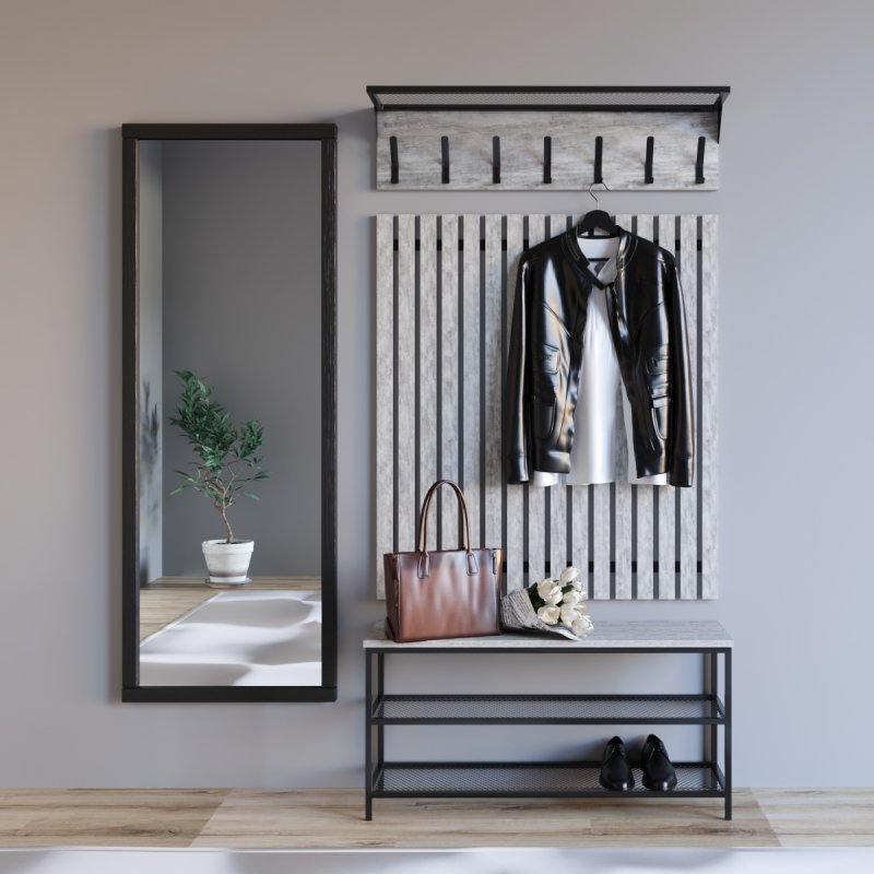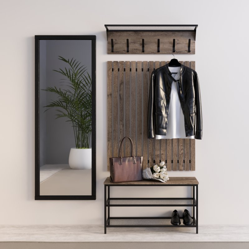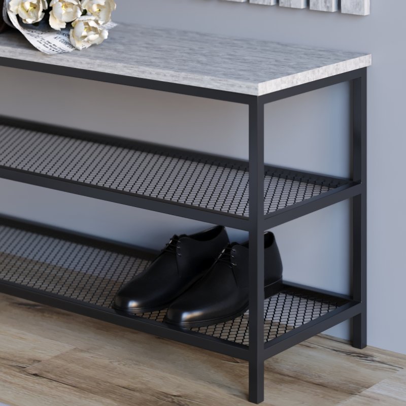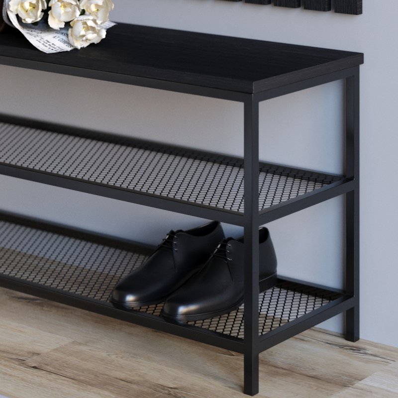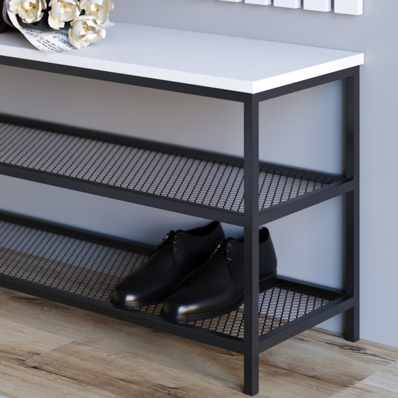 Сувора банкетка в стилі loft доповнює меблі для передпокою. Міцна металева основа гарантує надійність та довговічність виробу, жорстке сидіння з ЛДСП підкреслює аскетичний характер комплекту. У нижній частині передбачені дві сіткові полиці для взуття, виконані також із металу. Габаритні розміри банкетки (В/Ш/Г): 480×880×300 мм (розмір А) та 480×990×300 мм (розмір B).
