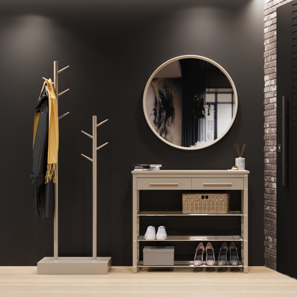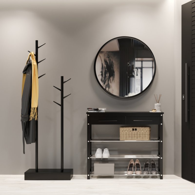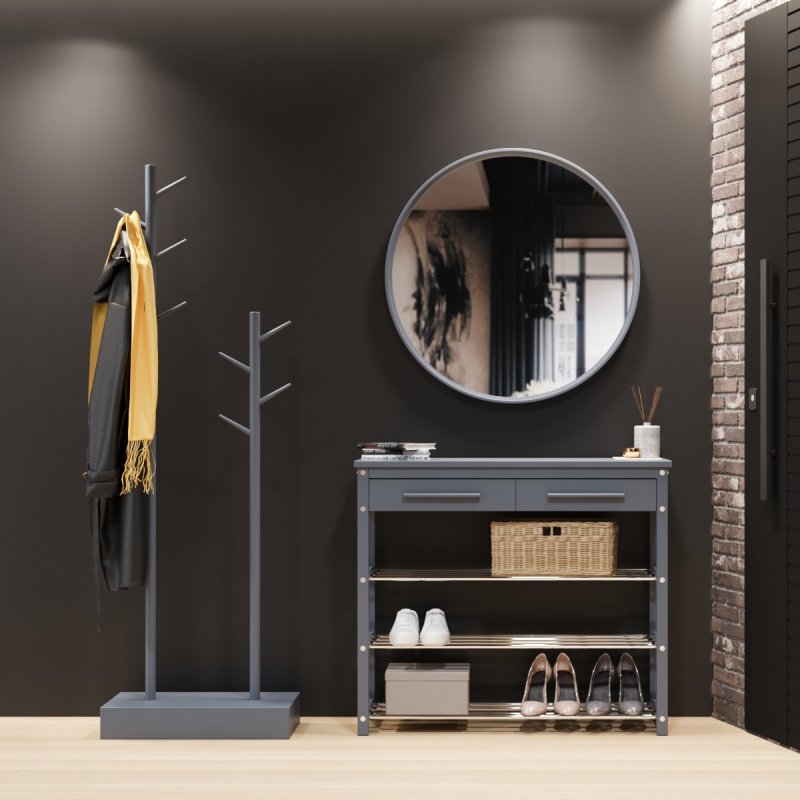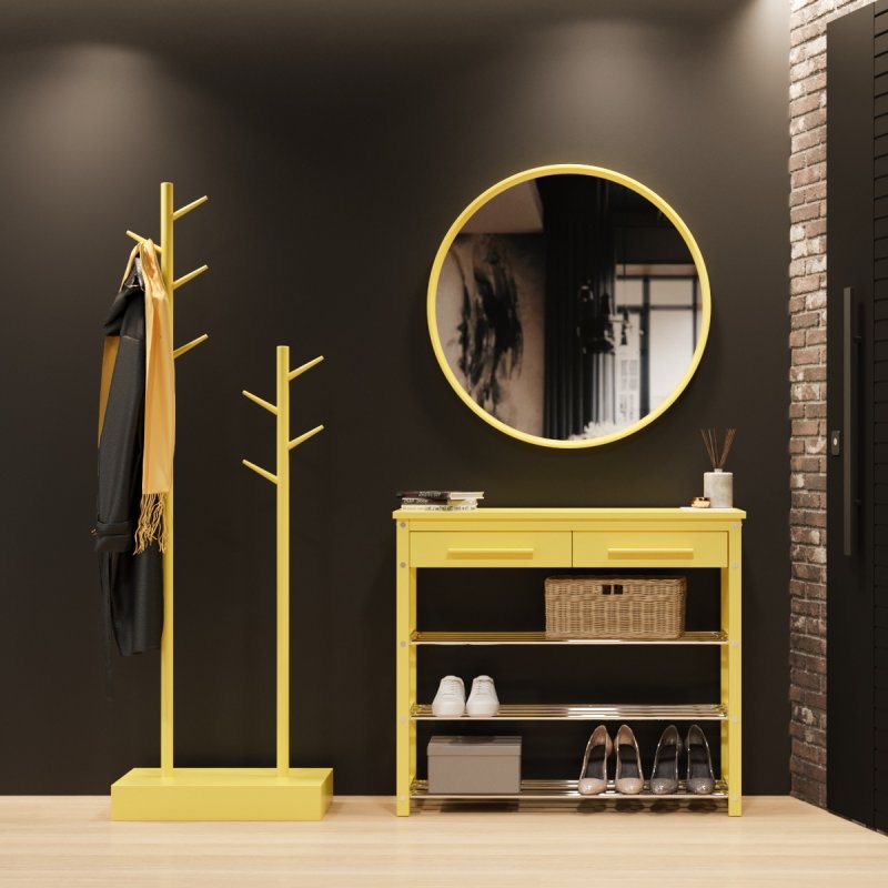 Підставка для взуття “NVD-10” має три полиці із хромованих трубок, вони ідеальні для розміщення вуличного взуття всіх членів сім'ї. Дві висувні ящики під стільницею стануть зручним місцем для зберігання невеликих аксесуарів та супутніх товарів, властивих вхідній кімнаті. Габаритні розміри моделі (В/Ш/Г): 865×1000×320 мм.