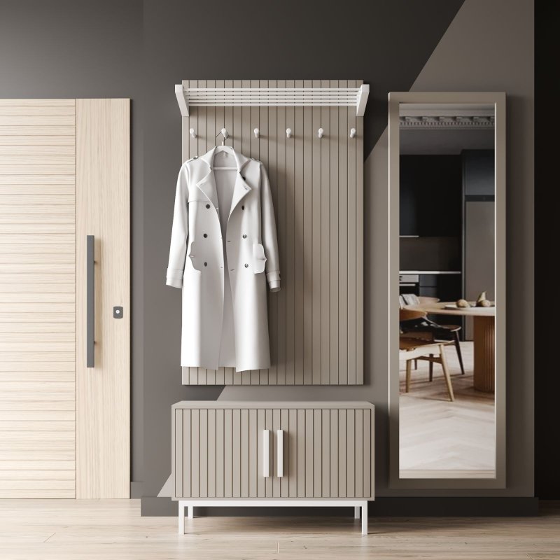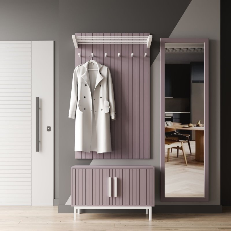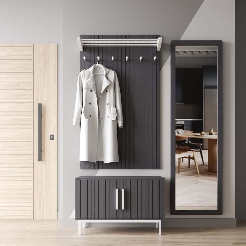 Настінний вішак (1300х770х270мм) оснащений шістьма гачками для верхнього одягу щоденного використання та нішою для аксесуарів та головних уборів. Тумба з поличками для взуття (500х770х370мм) має закритий вигляд, що допомагає захистити вміст від пилу та сторонніх очей. Висота ніжок розрахована для комфортного прибирання під виробом, а поверхня послужить чудовою підставкою для сумок, пакетів, телефону та інших дрібниць. Дзеркало на повний зріст (1665х520х200мм) – обов'язковий атрибут сучасного передпокою, тому що дає можливість оцінити свій зовнішній вигляд перед виходом з дому, поправити зачіску або завдати макіяжу.