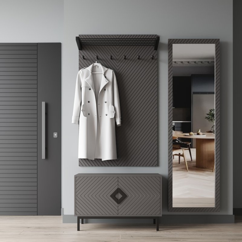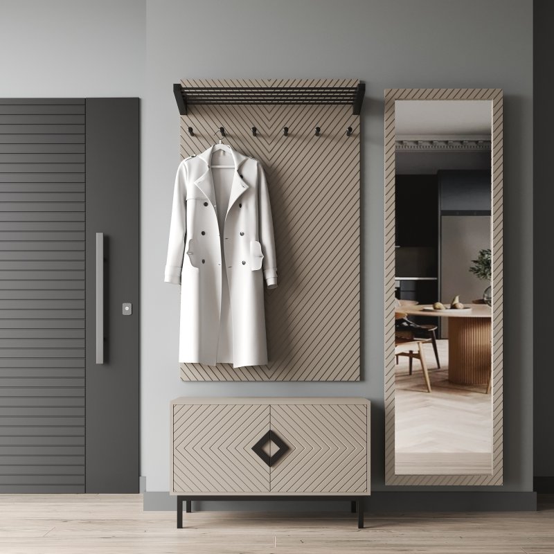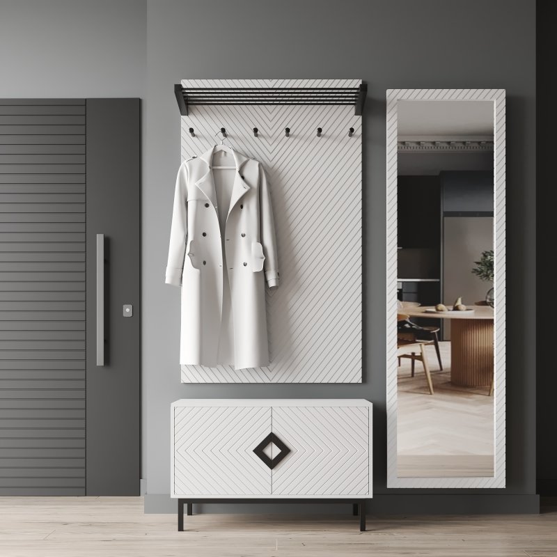 Ця банкетка в передпокої є місцем для зберігання взуття та деяких потрібних речей, здатних зайняти місце на полиці. Завдяки функціональності вона допоможе зберегти порядок і чистоту вашої кімнати, що особливо важливо у великій родині. Вішак з комплекту є найпопулярнішою моделлю та прикріплюється безпосередньо до стіни. Виріб включає шість гачків для акуратного розміщення верхнього одягу. На верхній полиці зручно розмістяться головні убори, парасольки та інші аксесуари, необхідні у повсякденному житті.