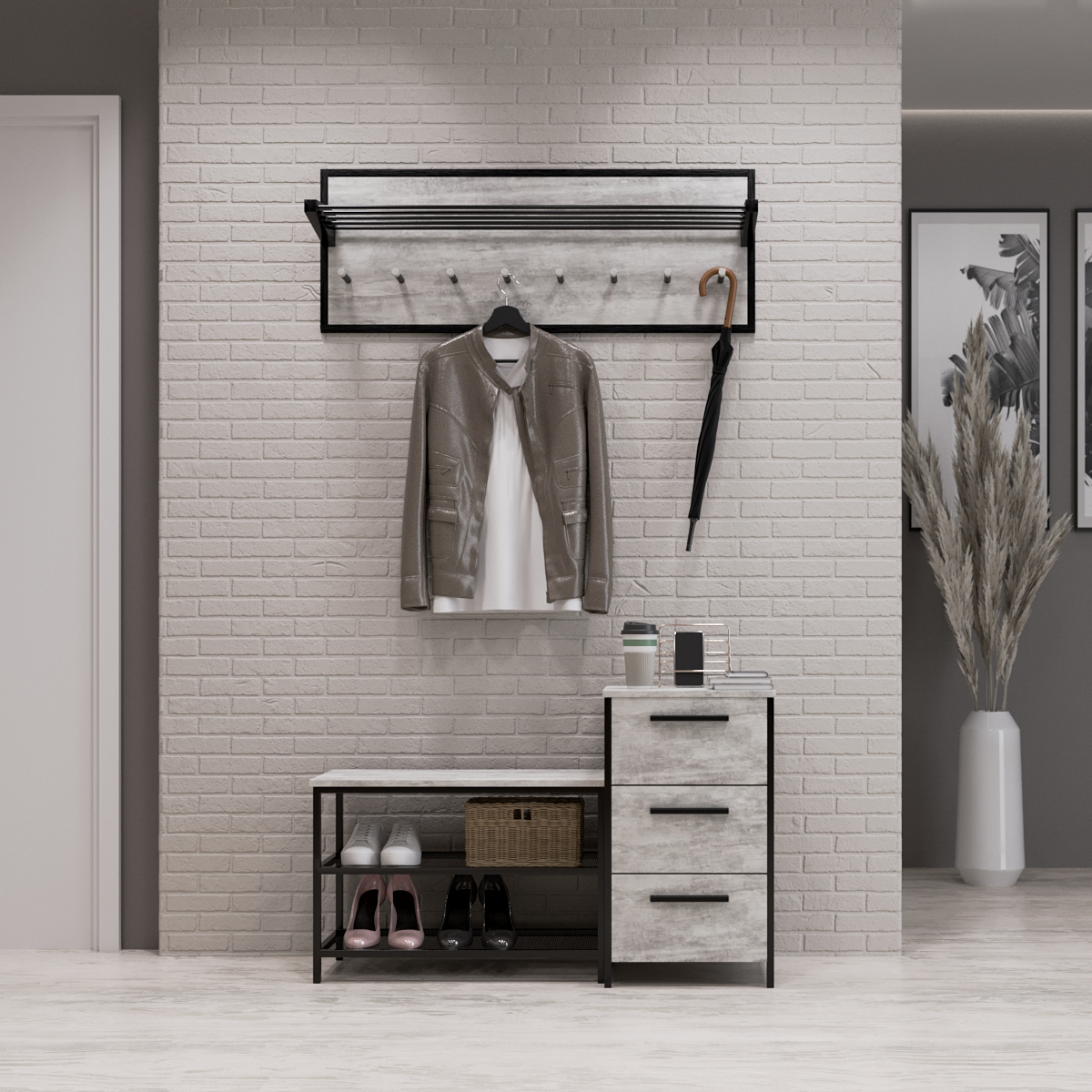 Підставка для взуття доповнює інтер'єр та надає приміщенню завершеного вигляду. Ця модель нагадує невеликий комод із трьома полицями, кожна з яких закривається дверцятами. Цей варіант більш місткий: тут зручно зберігатиметься взуття всіх членів сім'ї. Розмістити взуття можна навіть у коробках: зимове взуття не змішуватиметься з літнім, а значить зберігатиме охайний вигляд довгий час. Розмір тумби для взуття (ВхШхГ): 680х1080х390 мм. Для кращого захисту від зовнішніх факторів конструкція покрита порошковим термофарбуванням. Цей передпокій в коридор підійде і для кімнат невеликої квадратури, а також візуально розширить приміщення.