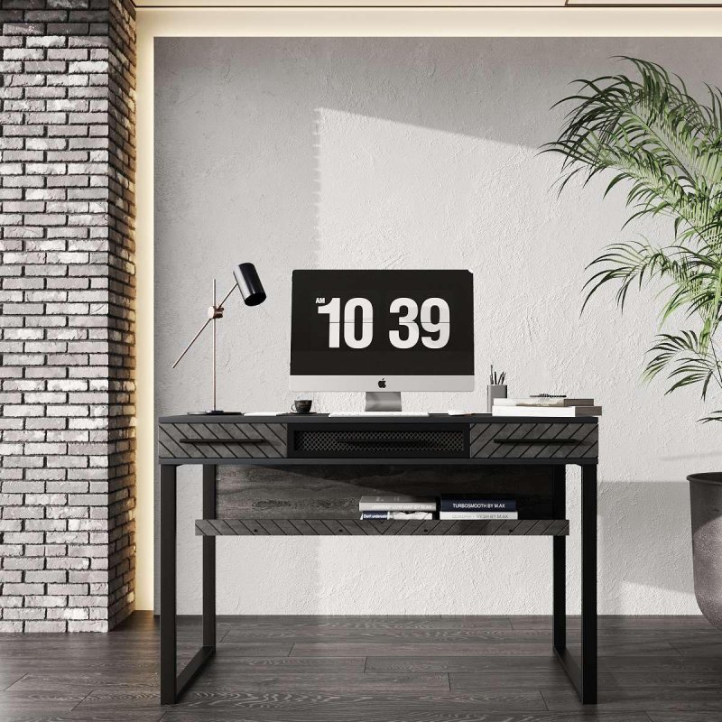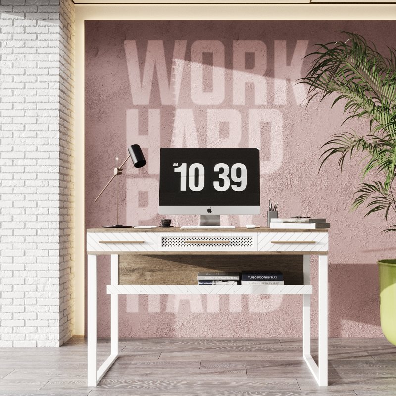 Письмовий стіл є робочим місцем для школяра, студента або людини, яка працює вдома. Таким чином, головними його критеріями повинні бути зручність в експлуатації та функціональність. Письмовий стіл із пеналом Бруклін, виконаний у сучасному стилі лофт. Виріб має широку та міцну стільницю з ДСП, що дозволить розмістити на ній комп'ютер чи ноутбук, настільну лампу, колонки, зошити, книги, органайзери тощо. Наявність трьох висувних ящиків та полички допоможе підтримувати чистоту та порядок, дозволяючи зберігати тут необхідні дрібниці повсякденного життя. А в простору нішу в задній частині столу помістяться всі дроти та перехідники для підключення техніки. Розміри даної моделі 760х1200х600мм, що є оптимальним для комфортної, зручної та правильної роботи за столом. Масивні металеві ніжки роблять письмовий стіл із полицями дуже стійким, надійним та неймовірно стильним.