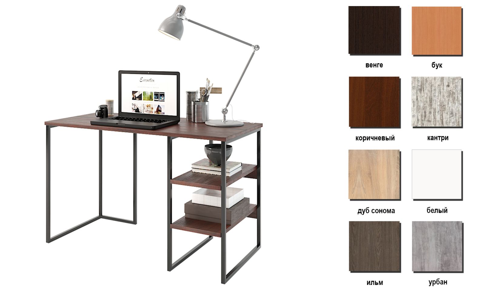 Новий письмовий стіл “Універ 3” – повністю відповідає вимогам цього стилю, його основа виготовлена з міцної металевої труби квадратного перерізу зі стороною 20 мм, покрита порошковим термофарбою чорного кольору. Стільниця та полиці виготовлені з якісного та безпечного ДСП з імітацією текстури натурального дерева. На відміну від подібного комп'ютерного столу "Вега 3", де є більш міцна стільниця. Ця модель є його бюджетною версією, товщина стільниці тут складає 16 мм.