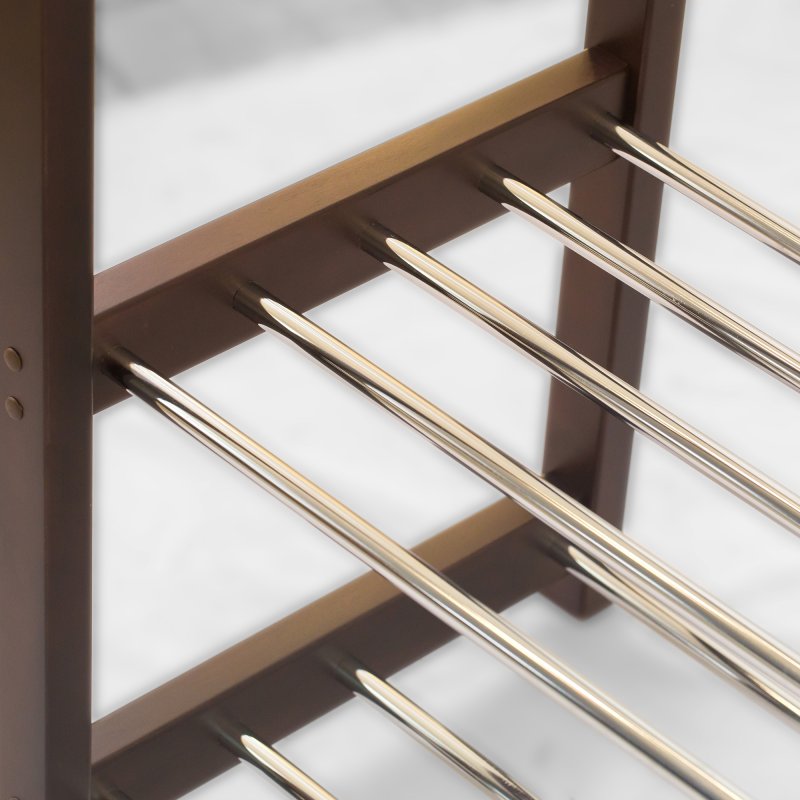 Стійка Люкс виготовлена з натурального дерева, покритого двокомпонентним італійським поліуретановим лаком. Поперечина для плечиків зроблена з хромованої труби. Полиці для взуття також виготовлені з хромованих трубок. Це значно полегшує догляд виробу і допомагає надовго зберегти його зовнішній вигляд. Екологічність матеріалів, краса і витонченість натурального дерева підкреслять смак і статус господарів. Зручність та надійність конструкції вішалки дозволять із задоволенням її використовувати протягом тривалого часу.