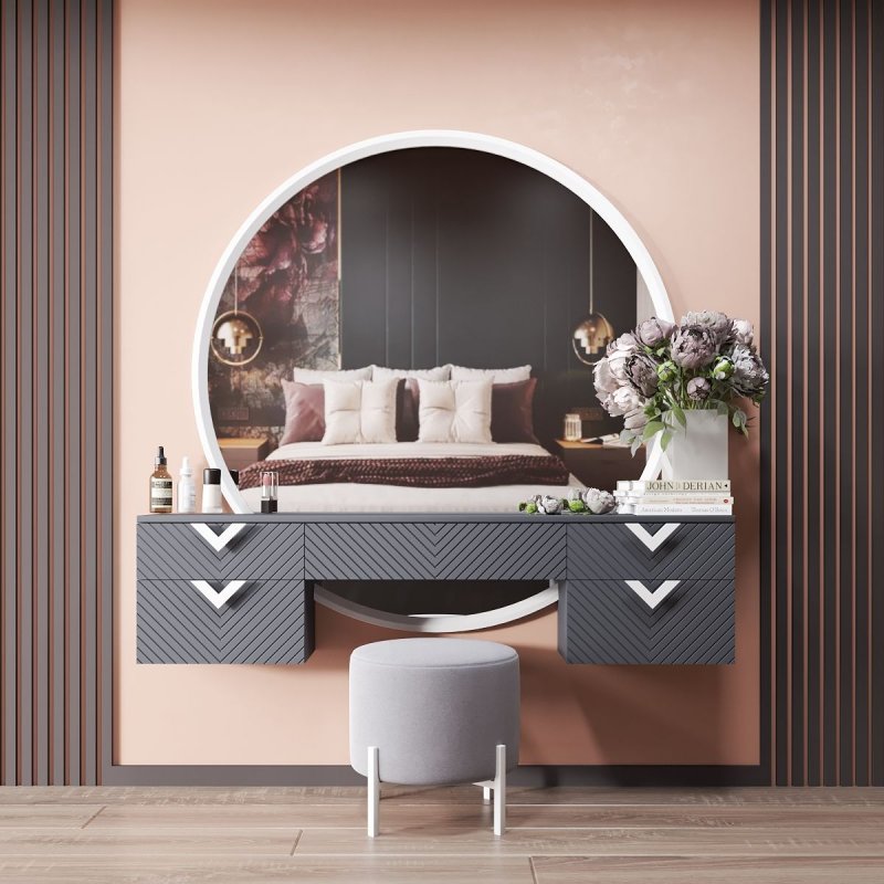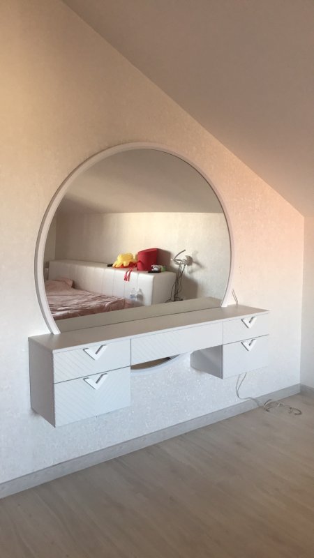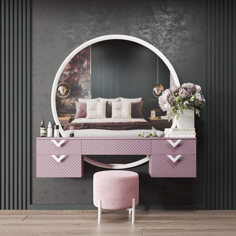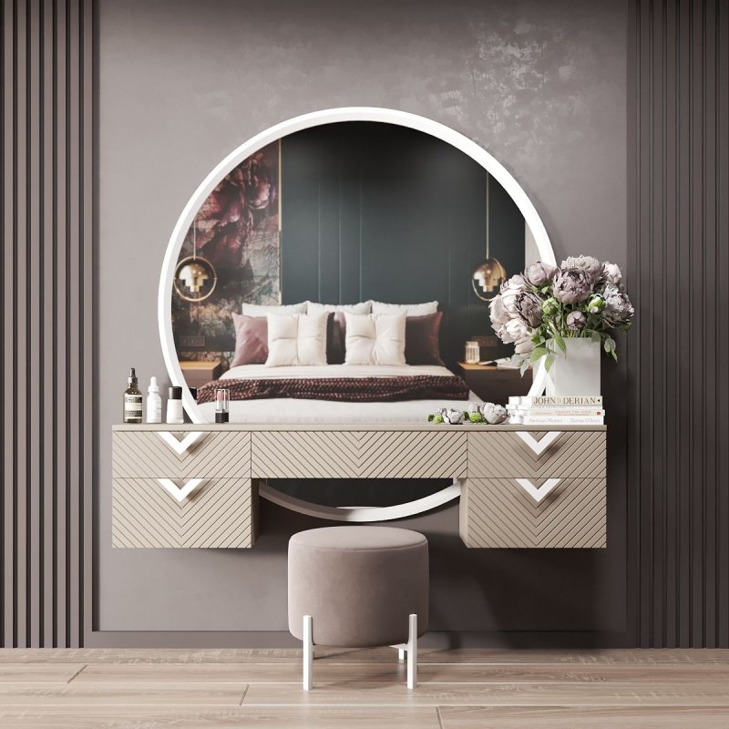 На широкому міцному столі гармонійно і стильно виглядатимуть ваза з квітами, скринька для прикрас, а також ваші улюблені книги. Велике кругле дзеркало візуально збільшить кімнату, додасть світла та додасть їй особливого шарму. А кожна модниця зможе милуватися своїми вбраннями, робити різні зачіски та наносити макіяж. Однією з переваг є те, що трюмо з дзеркалом кріпляться безпосередньо до стіни, що значно економить простір у кімнаті і суттєво спрощує процес прибирання. Елегантний круглий пуф на чотирьох тонких ніжках, тон трюмо з дзеркалом, ідеально доповнює цей комплект. Його компактність дозволяє в потрібний момент засунути його під трельяжі або перенести в інше місце.