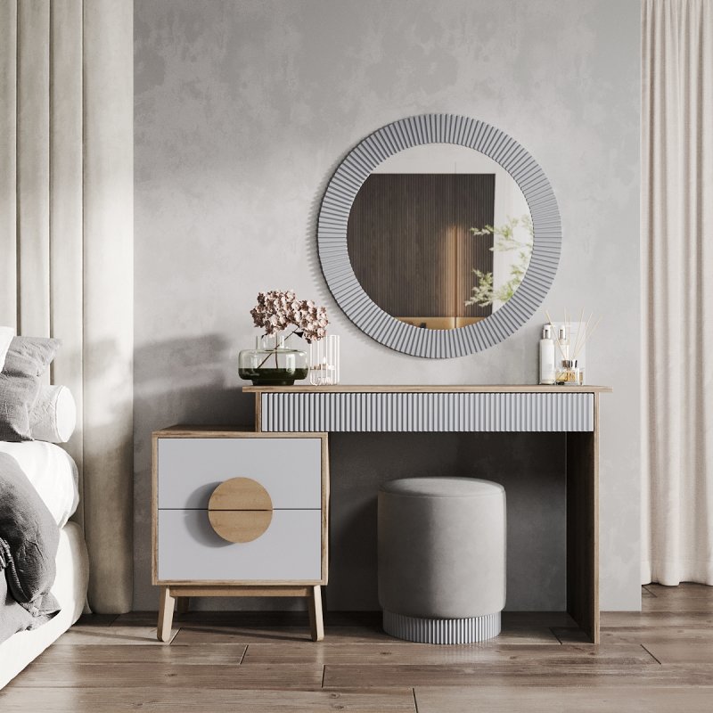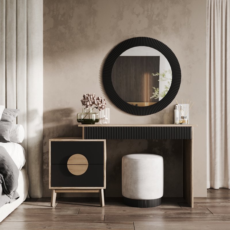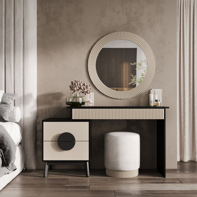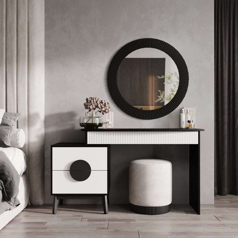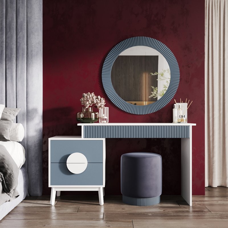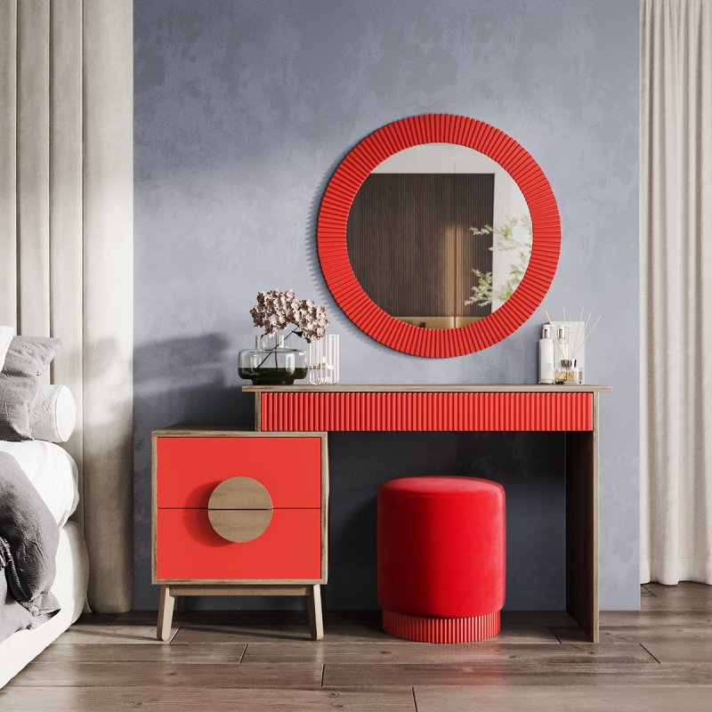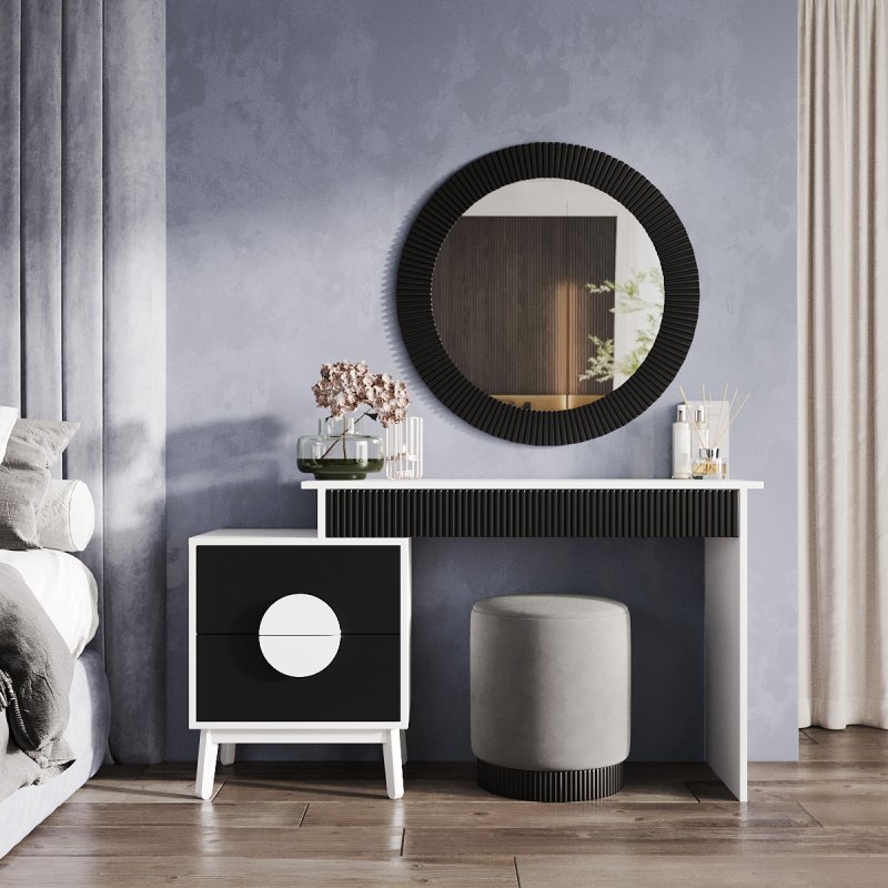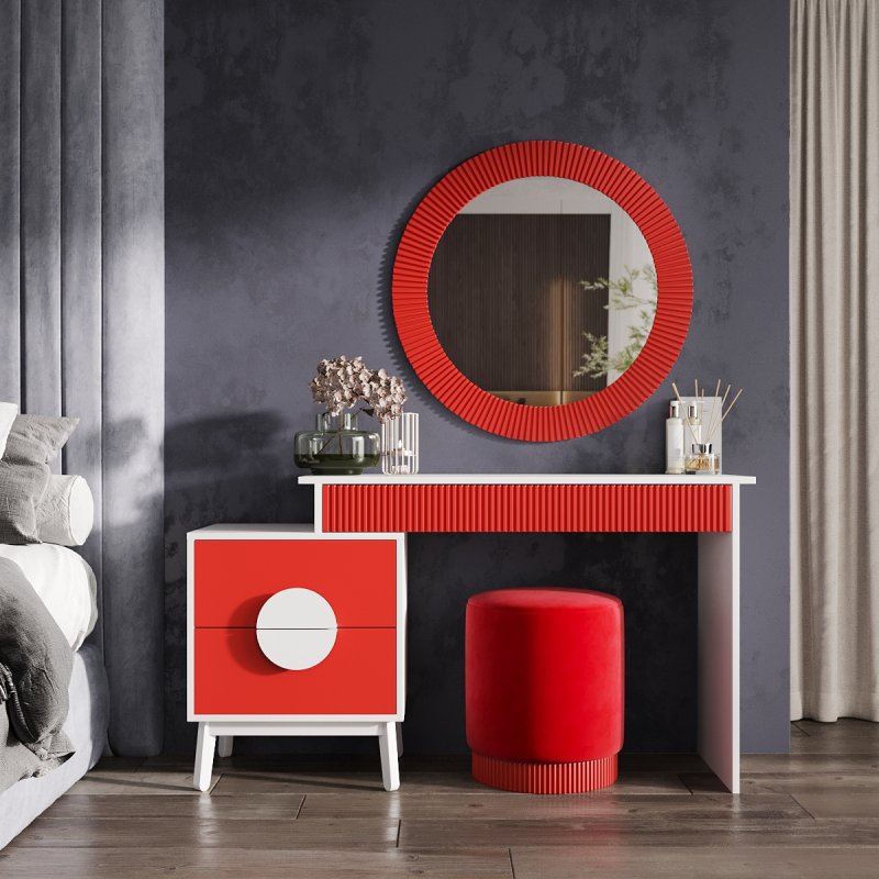 На вибір пропонуються дев'ять сучасних відтінків кольорів: від чорно-білого до червоного-аліканте. Всі вони відмінно поєднуються та доповнять індивідуальний дизайн вашої кімнати. У комплект виробу – столик із дзеркалом – входить функціональний столик із тумбою, елегантне дзеркало та зручний пуф. Сучасне дзеркало доповнить інтер'єр м'якою та світлою енергетикою, додаючи почуття краси та стилю його власника. Відбиваючи світло, воно дає змогу візуально розширити простір. Процес створення макіяжу та зачісок тепер буде подвійно приємним.