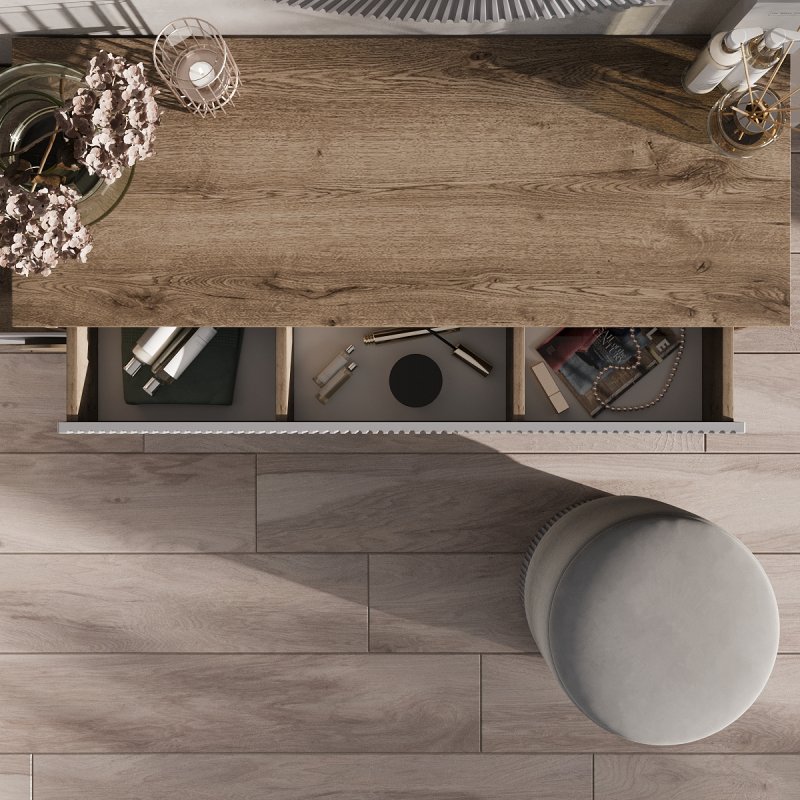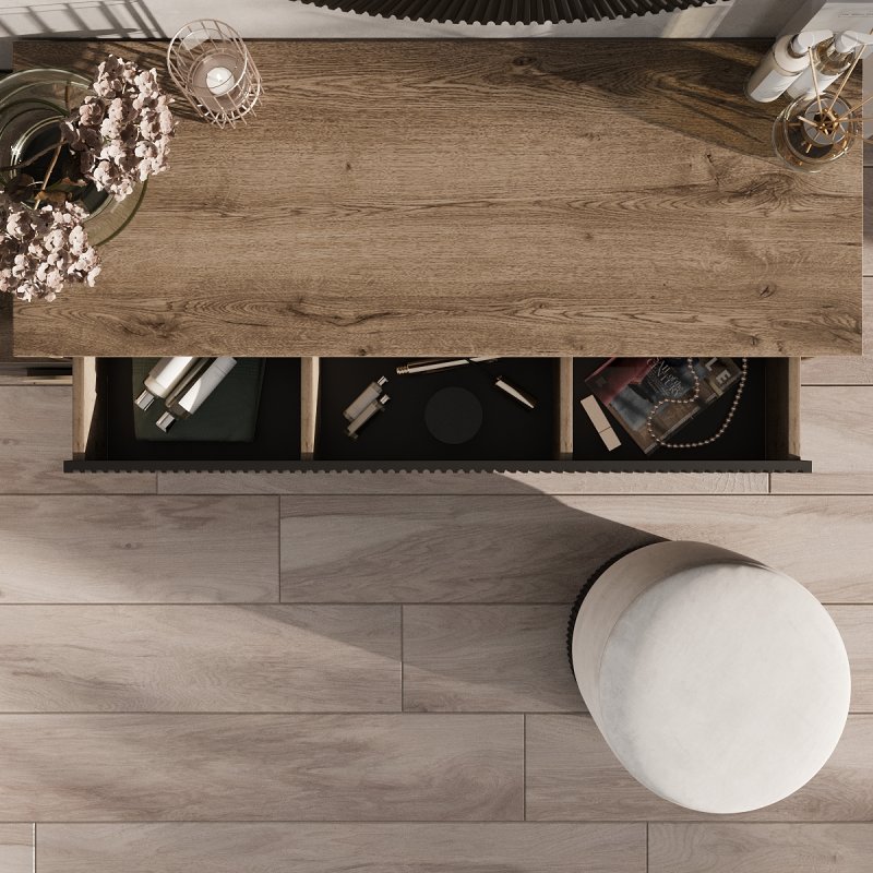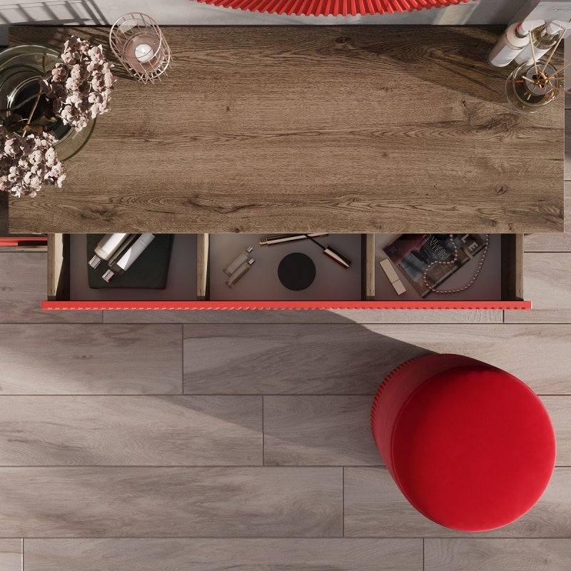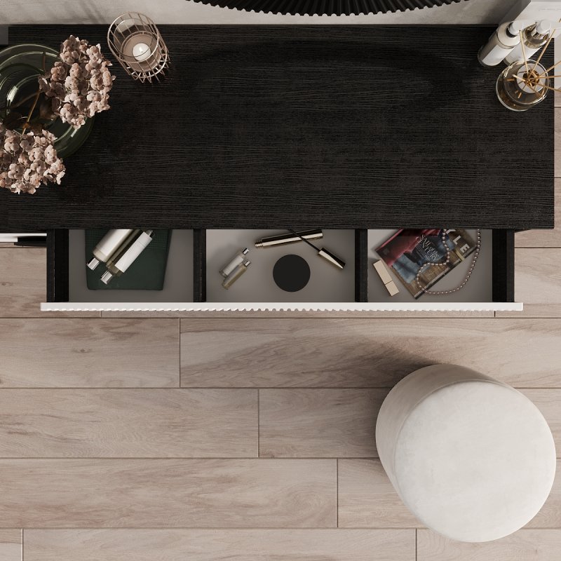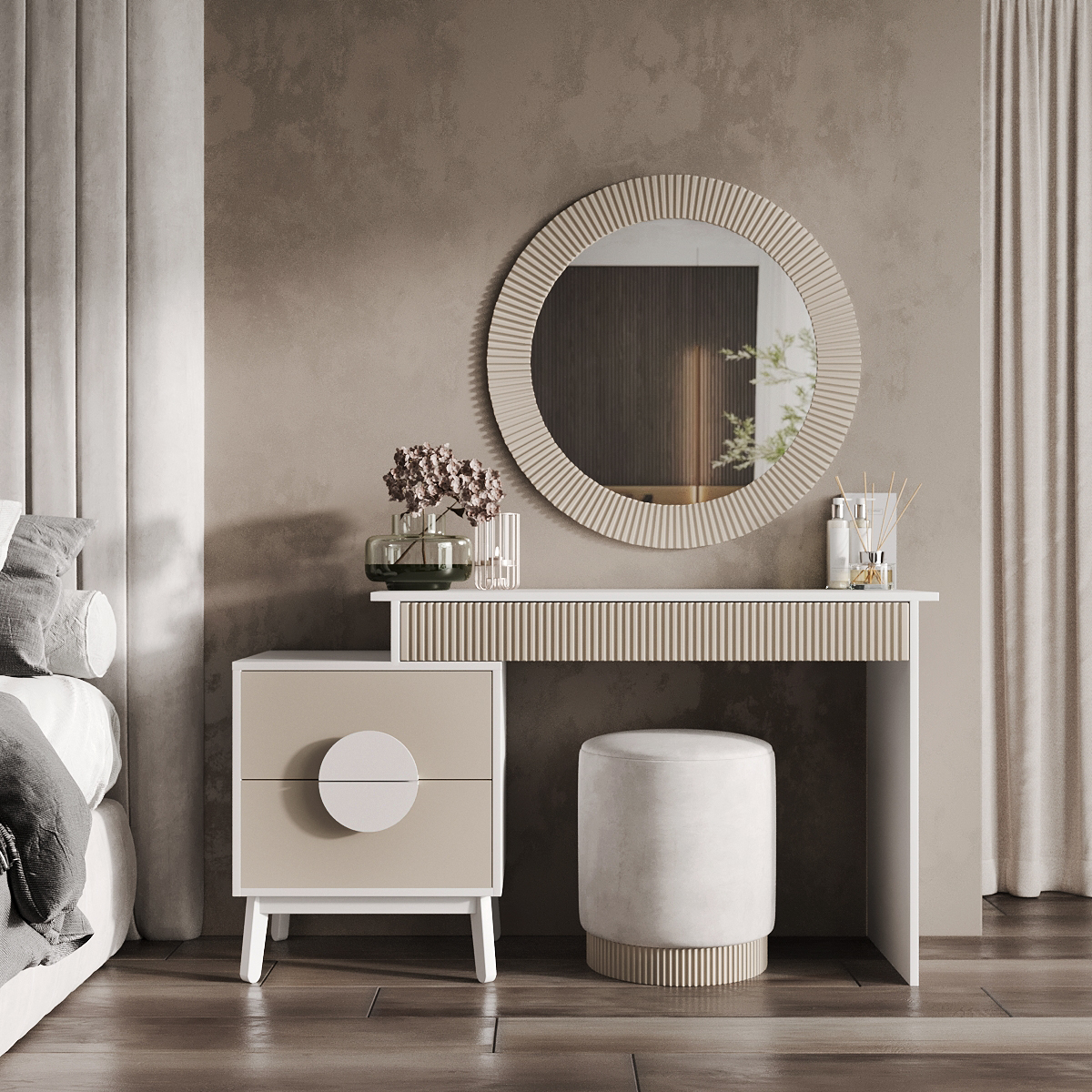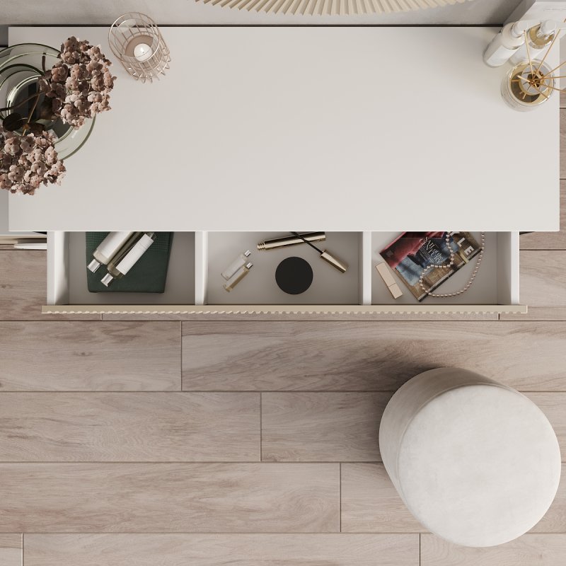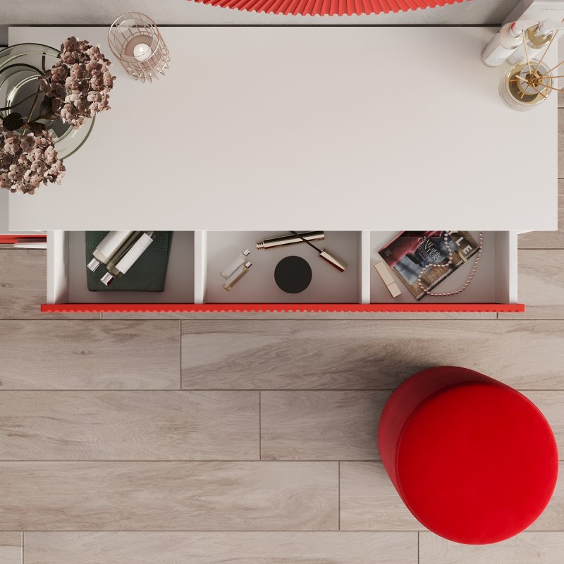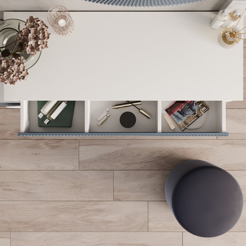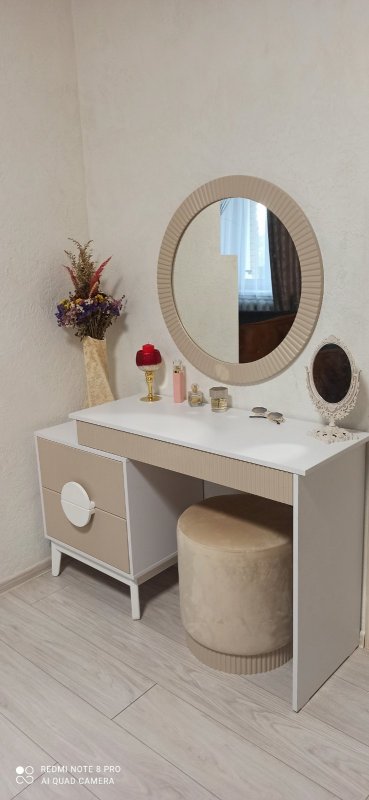 Відмінним доповненням до столу стала вбудована тумба із двома висувними ящиками для зручного зберігання. На поверхні столу можуть витончено розміститися парфум, ваза з квітами, фоторамка та інші речі, що дарують натхнення щодня. Компактний пуф надає виробу завершеного вигляду. Його мобільність дозволяє без зусиль переміщати його як у середині кімнати, і за її межами.