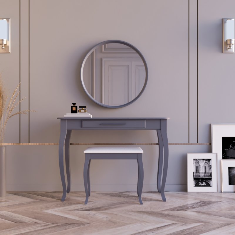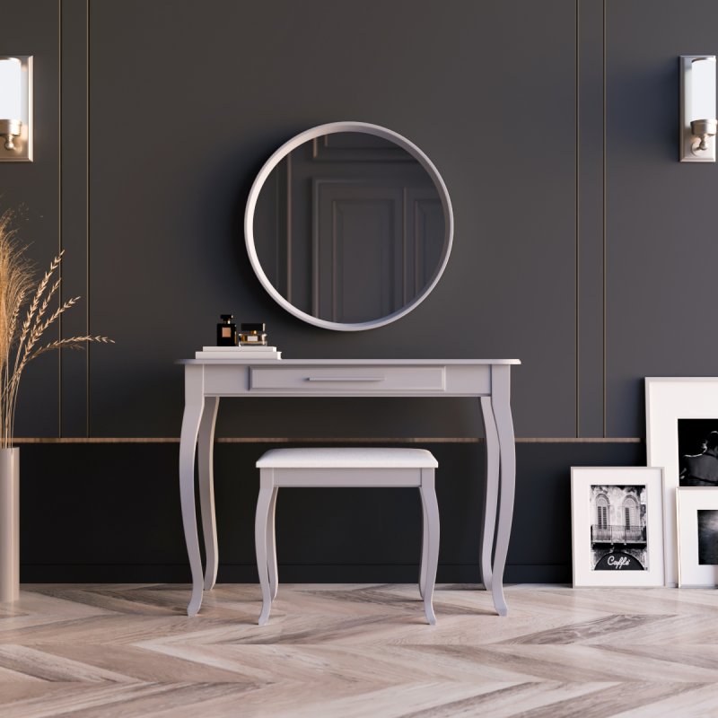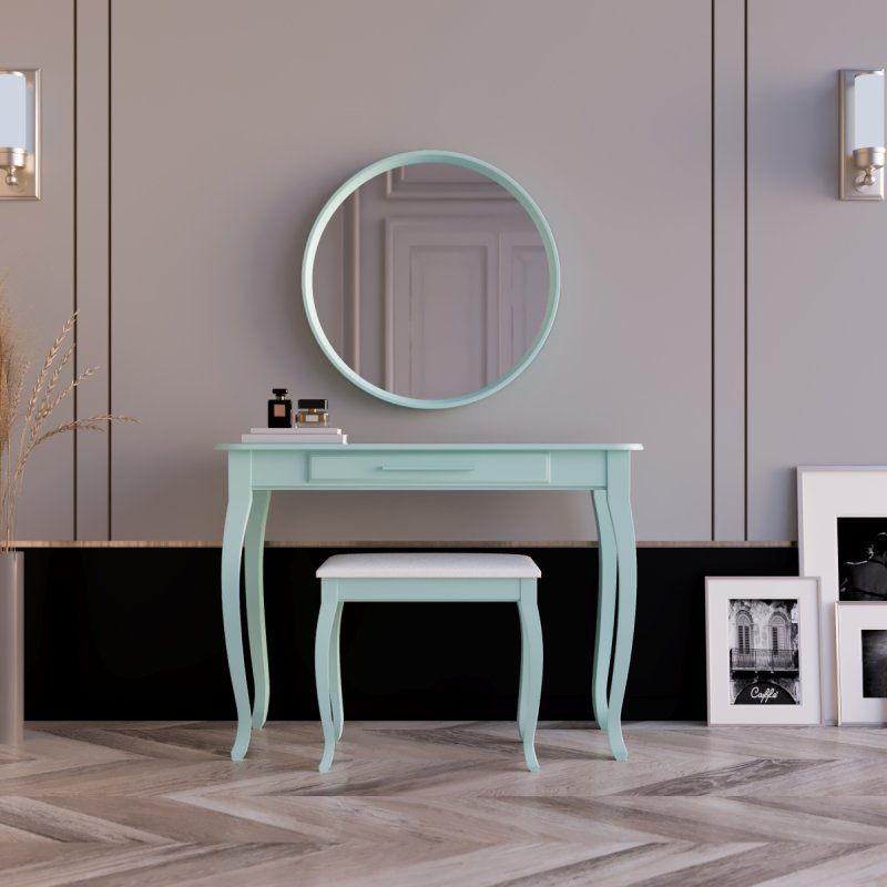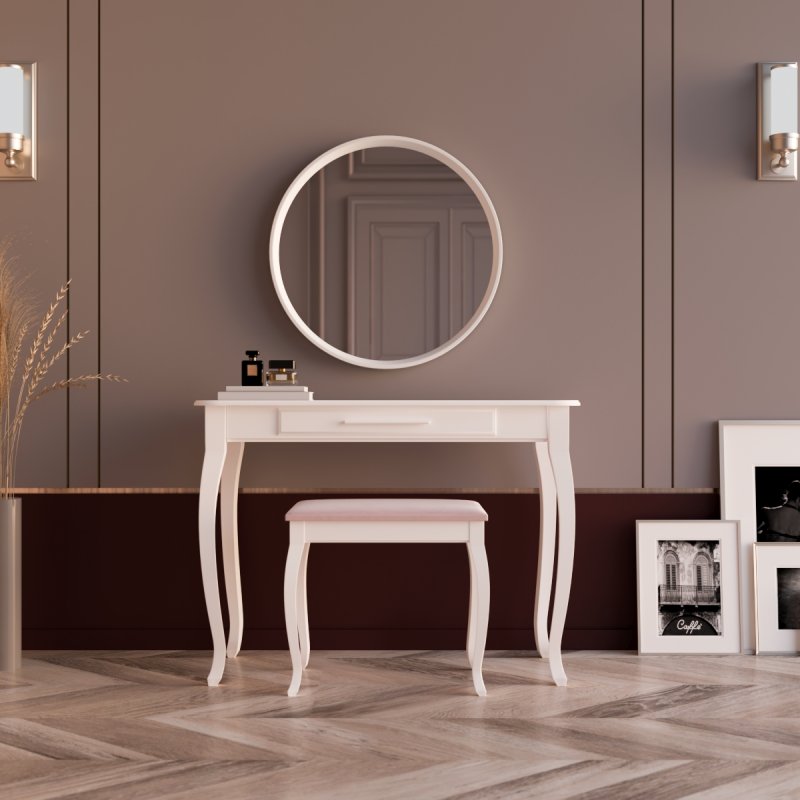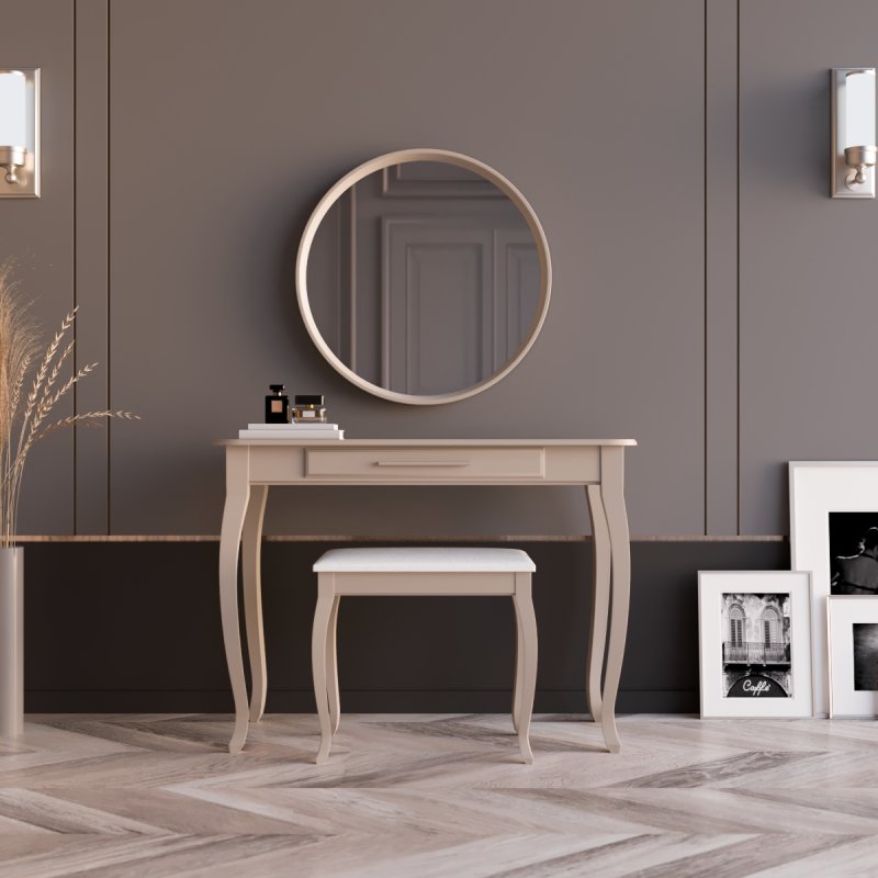 До складу комплекту входить столик для макіяжу "Тейлор". Його витончені та фігурні ніжки виточені з масиву берези, це гарантує їхню міцність та довговічність у процесі експлуатації. Верхня частина виготовлена з фарбованого МДФ, практична та приємна на дотик стільниця невибаглива у догляді – навіть якщо косметика випадково потрапить на поверхню, ви легко її видалите трохи вологою губкою.