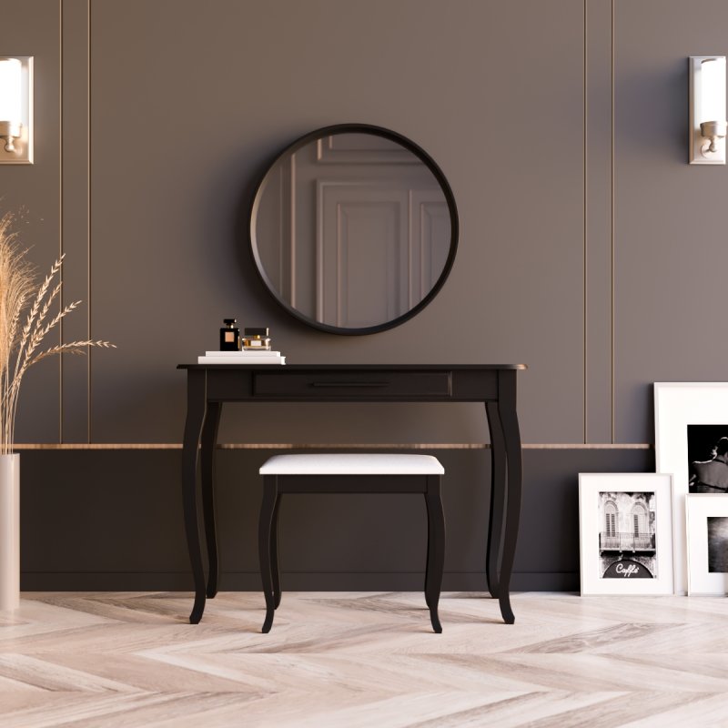 Для зберігання косметичних засобів та аксесуарів передбачений висувний ящик на безшумних напрямних, він дозволяє прибрати з поверхні все, що має бути приховано від сторонніх очей. Габаритні розміри столу становлять (В/Ш/Г): 760 1000 470 мм.