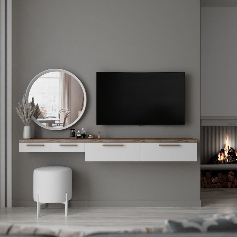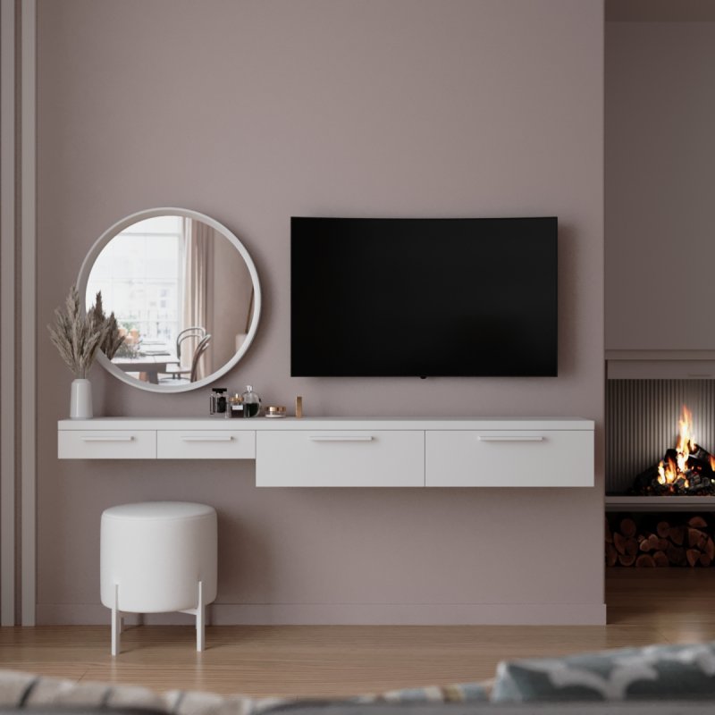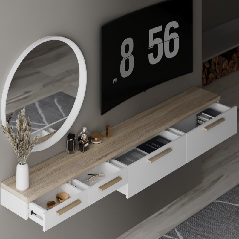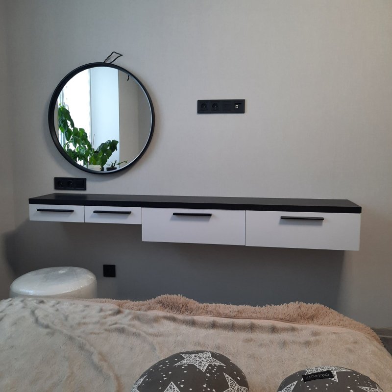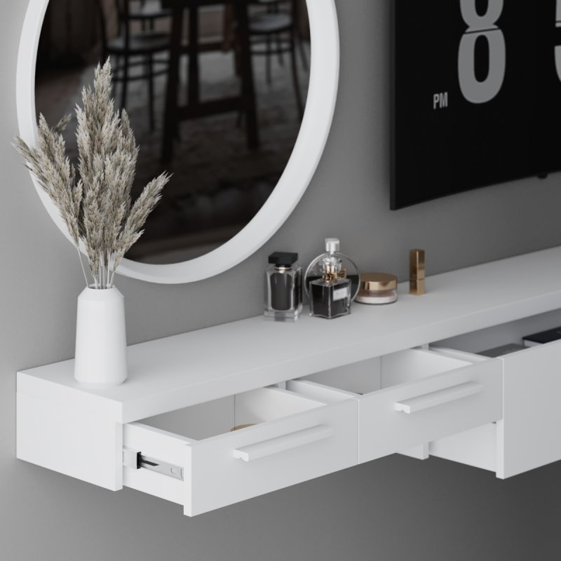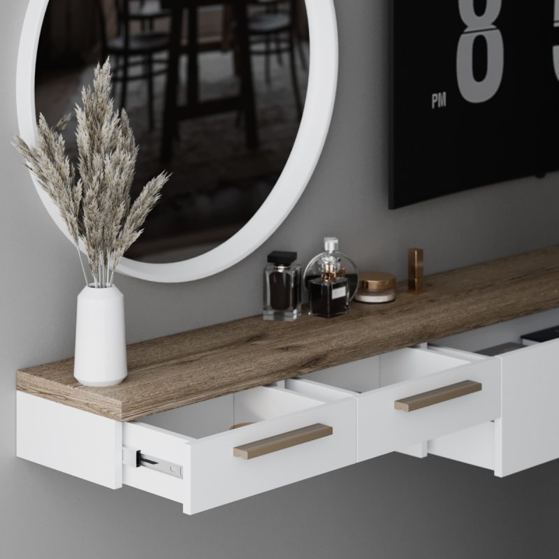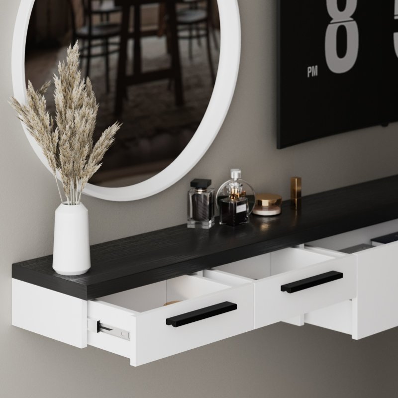 Консольний столик "Андерсен" великий, практичний і функціональний, з одного боку він містить два місткі висувні ящики, з іншого - два поменше. Навісний столик виконаний з ЛДСП у чотирьох видах виконання, під які також підібрано кольорову гаму пуфа та дзеркала. Габаритні розміри столу становлять (В/Ш/Г): 235 1096 306 мм.