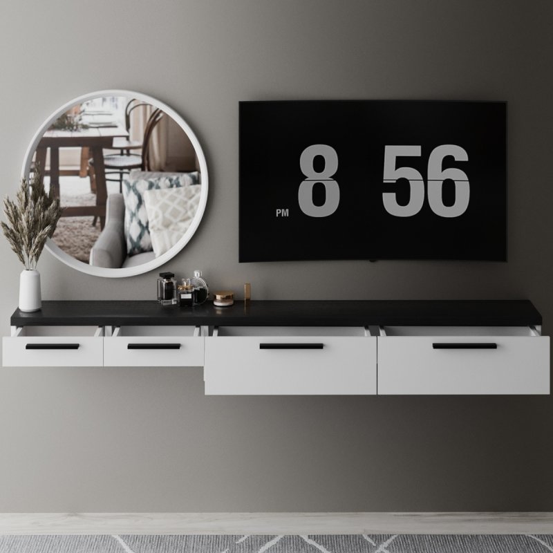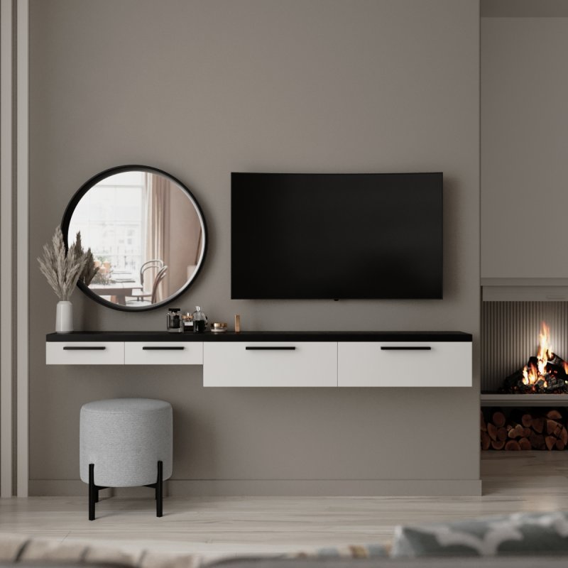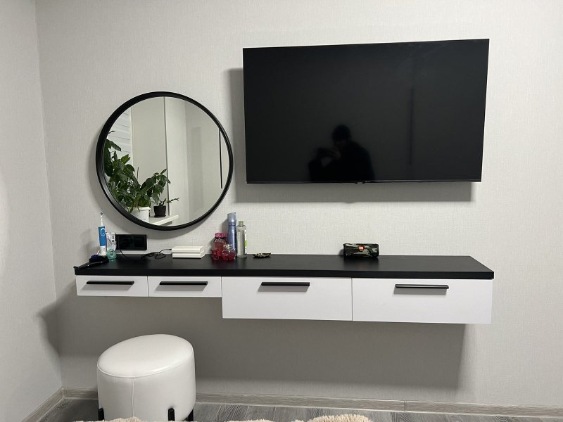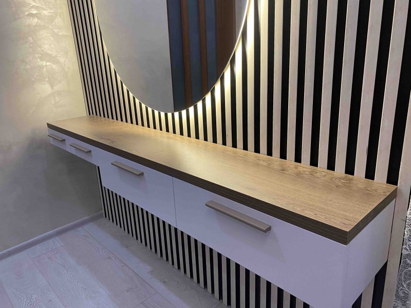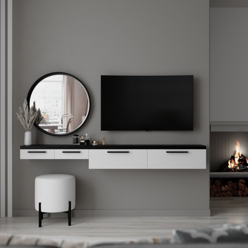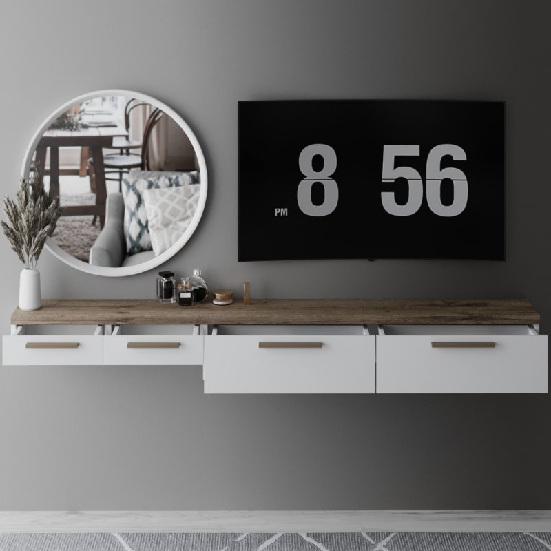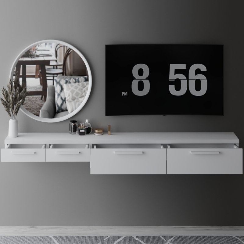 Консольний столик "Андерсен" великий, практичний і функціональний, з одного боку він містить два місткі висувні ящики, з іншого - два поменше. Навісний столик виконаний з ЛДСП у чотирьох видах виконання, під які також підібрано кольорову гаму пуфа та дзеркала. Габаритні розміри столу становлять (В/Ш/Г): 235 1096 306 мм.