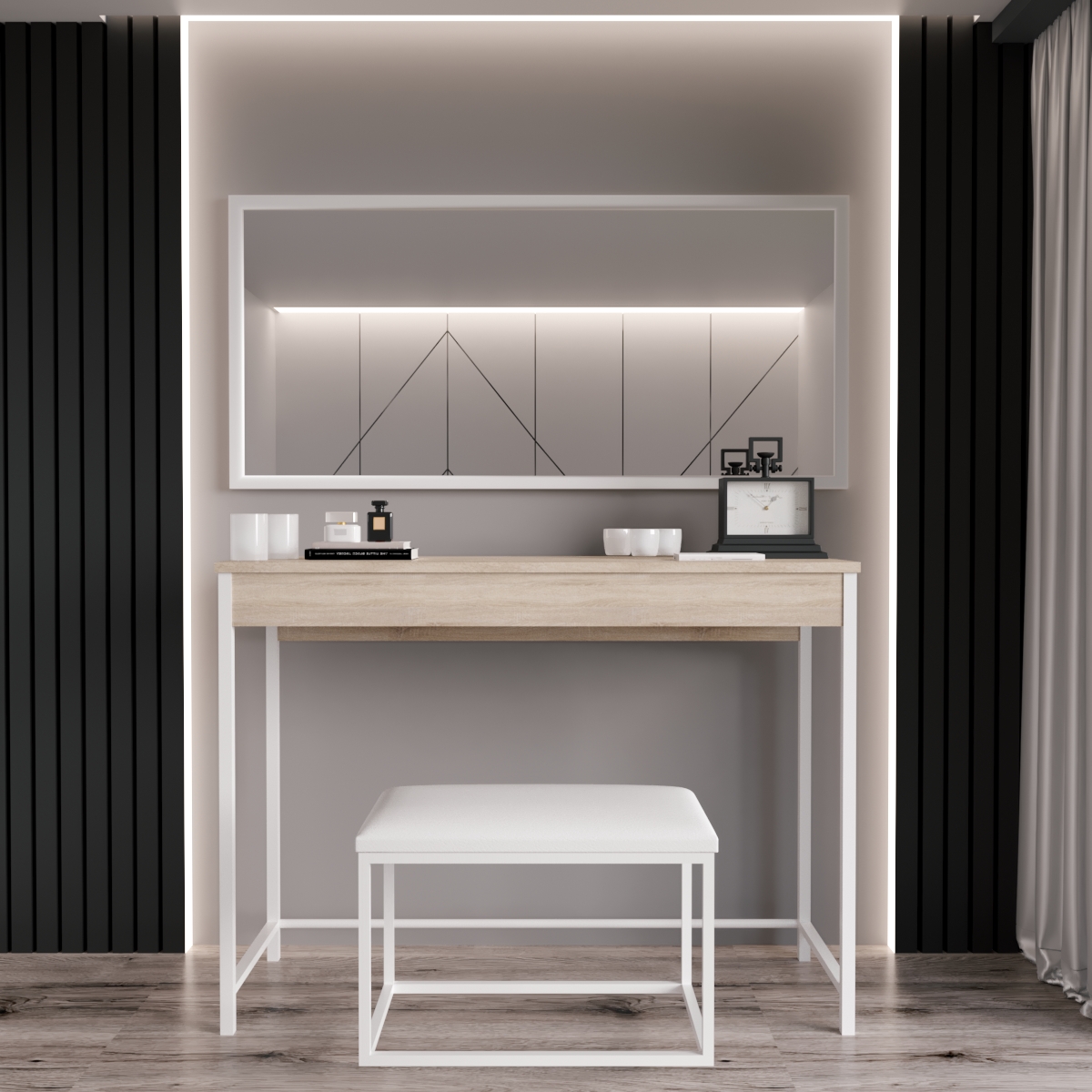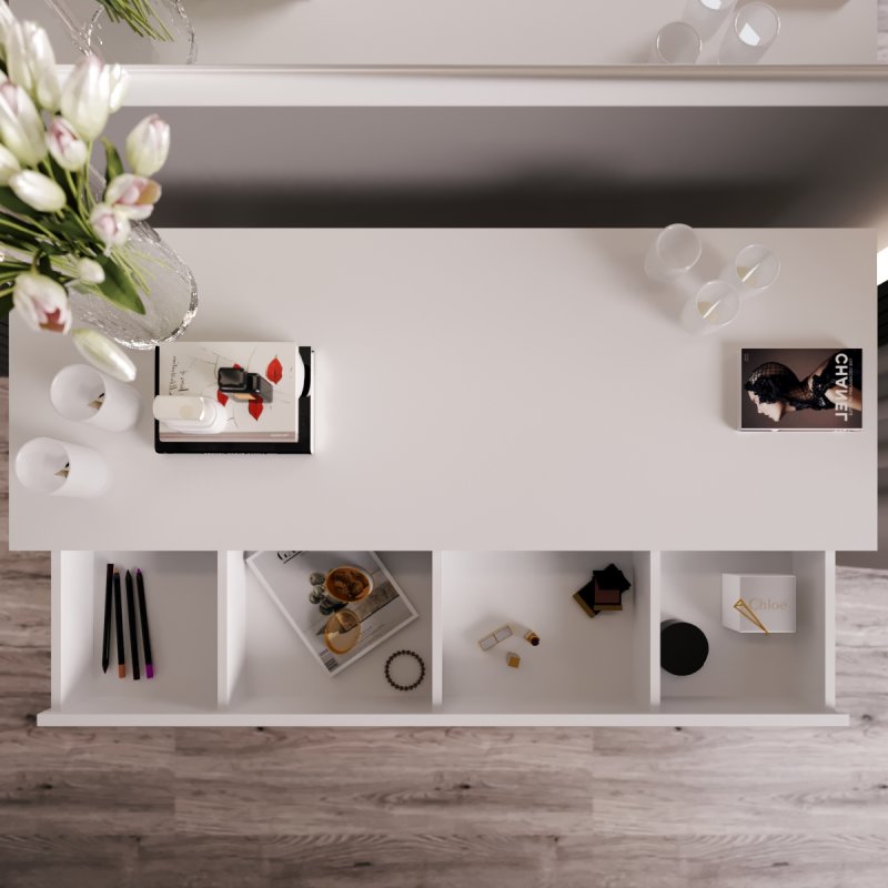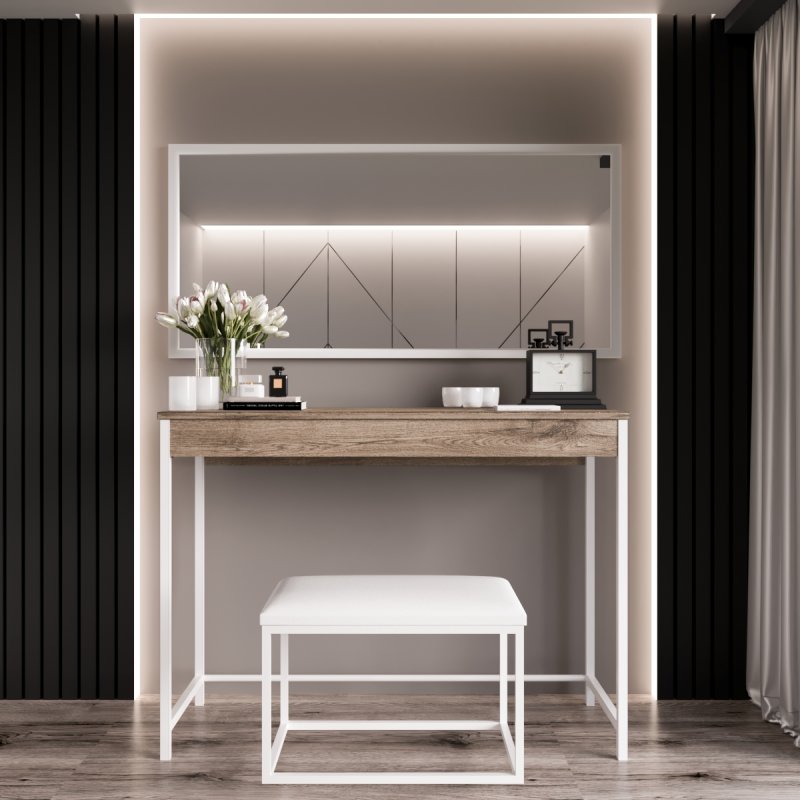 Стільниця столика "Даллас" розмістить все необхідне на увазі: предмети туалету, декору і навіть невелику техніку. Висувна скринька є великим органайзером для дрібниць, які хочеться вберегти від пилу. Внутрішня частина ящика поділена на чотири відсіки, в них поміститься вся косметика, засоби догляду за собою, парфумерія та прикраси. Ви матимете свій простір, де все важливе під рукою і не плутається з іншими речами. Стільниця та ящик виконані з високоякісного ЛДСП, представленого у трьох варіаціях найпопулярнішого виконання: білий, дуб сонома та урбан. Параметри столу складають (В/Ш/Г): 745×1000×370 мм.