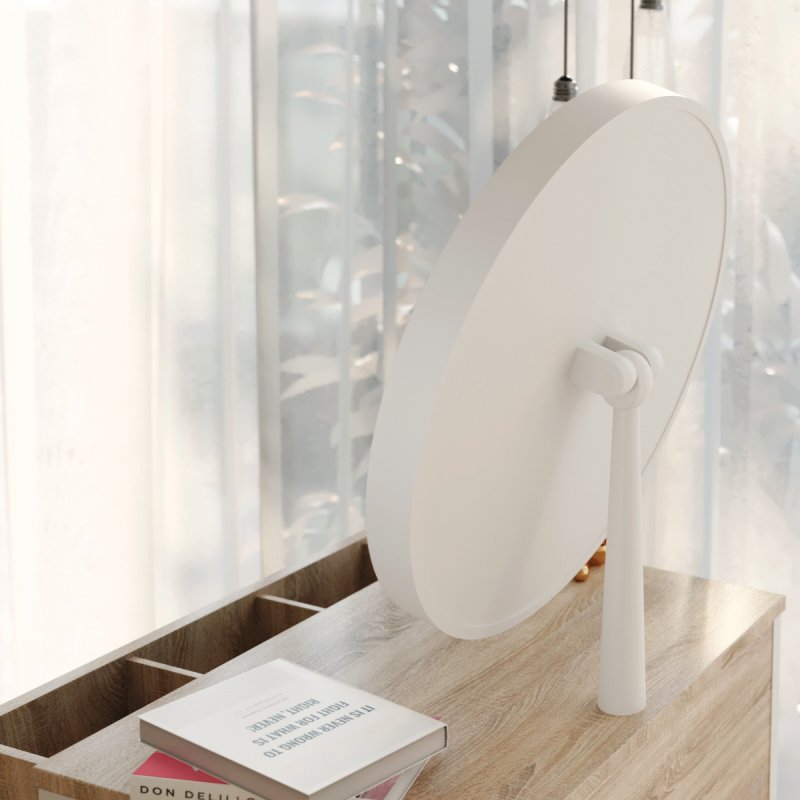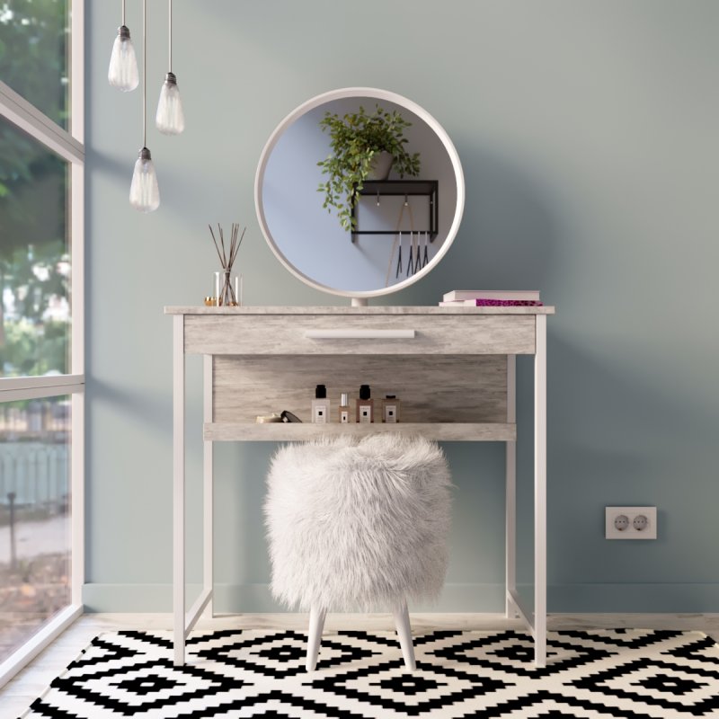 Туалетний столик із дзеркалом "Візард" - головний атрибут цього набору. На відміну від моделі "Візард", ширина даного варіанту становить 80 см. Більш широка стільниця дозволяє зручніше розміститися за столом, а висувна скринька збереже більше ваших косметичних засобів, прикрас та інших особистих дрібниць. Стіл має міцні металеві ніжки, стільниця та ящик виконані з ЛДСП завтовшки 16 мм.