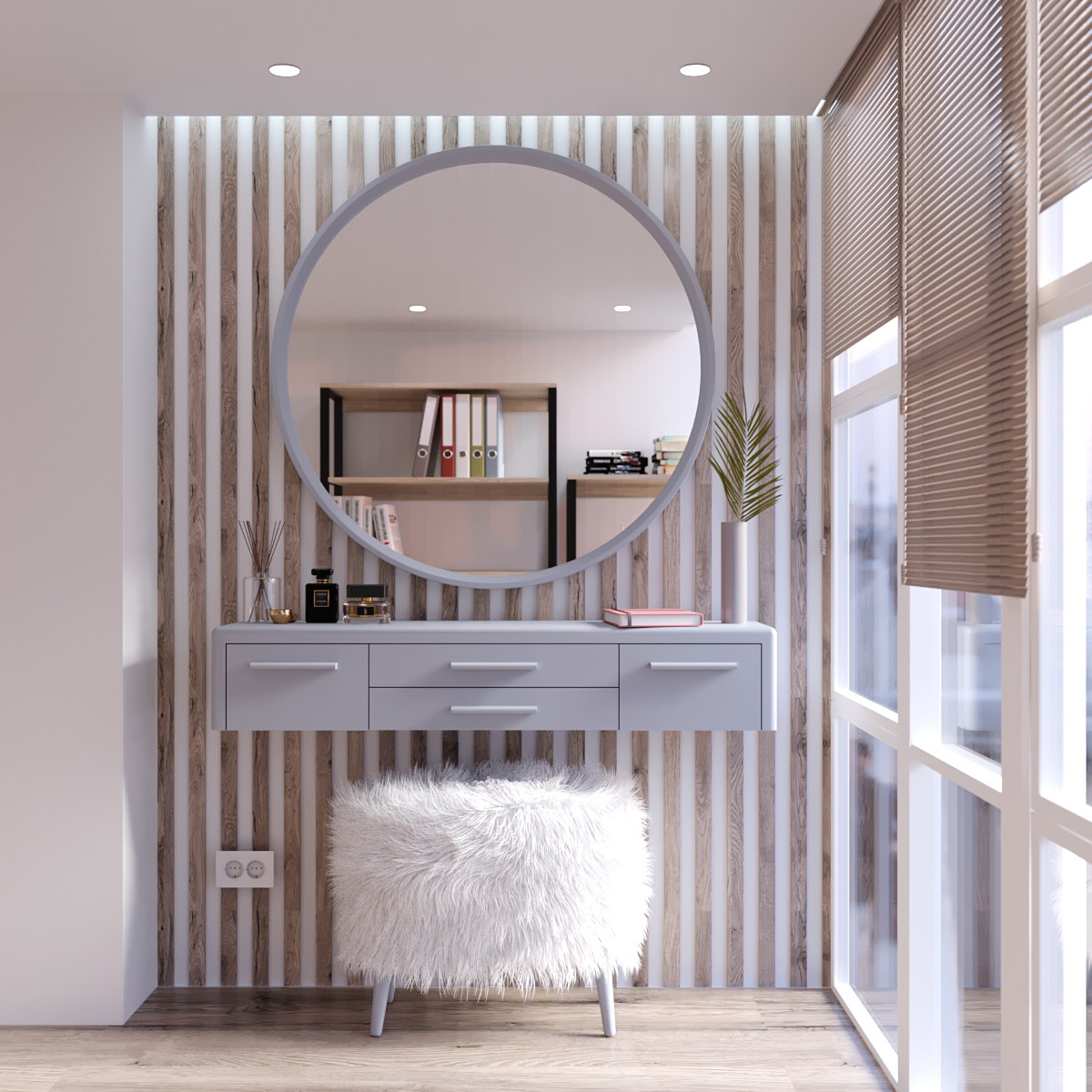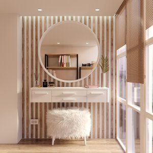 Містка конструкція з чотирма висувними ящиками дозволяє акуратно розкласти всі косметичні засоби, прикраси та інші дрібниці. Завдяки відсутності біля столу ніжок, виріб візуально сприймається як легше, а приміщення стає просторішим. Такий столик для макіяжу можна закріпити на бажаній висоті, зробивши цим місце для догляду за собою більш комфортним.