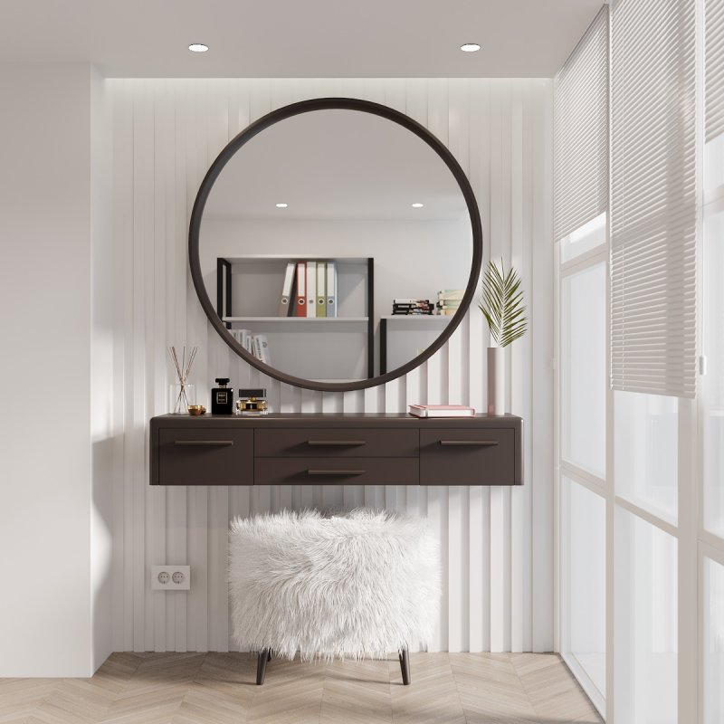 Містка конструкція з чотирма висувними ящиками дозволяє акуратно розкласти всі косметичні засоби, прикраси та інші дрібниці. Завдяки відсутності біля столу ніжок, виріб візуально сприймається як легше, а приміщення стає просторішим. Такий столик для макіяжу можна закріпити на бажаній висоті, зробивши цим місце для догляду за собою більш комфортним.