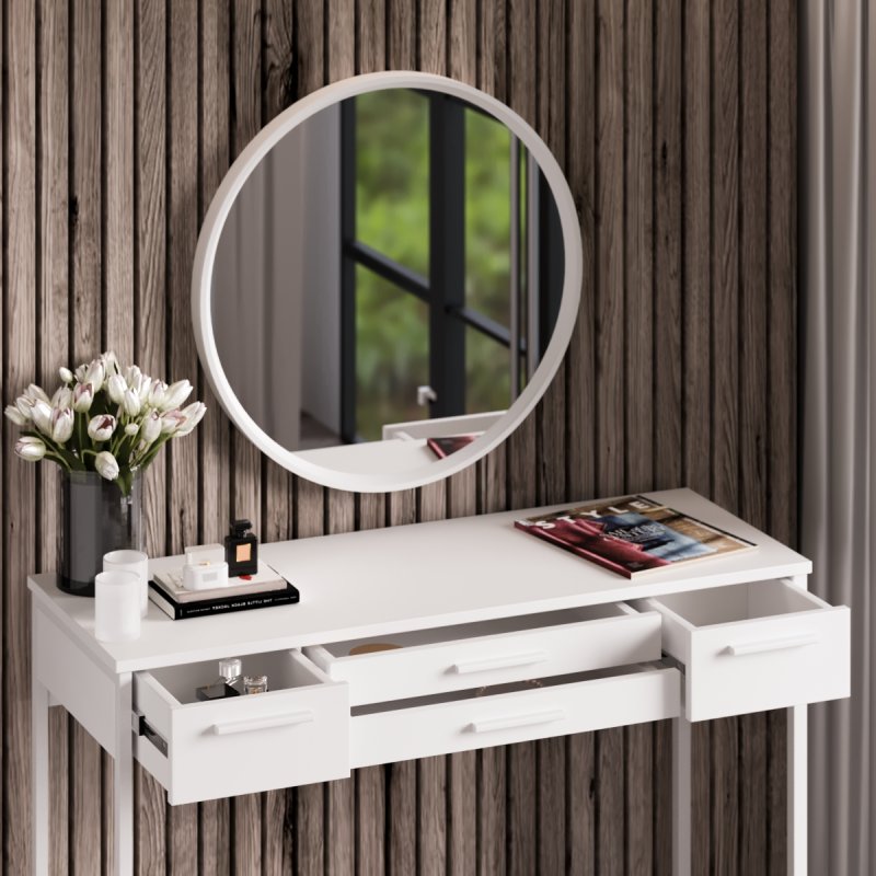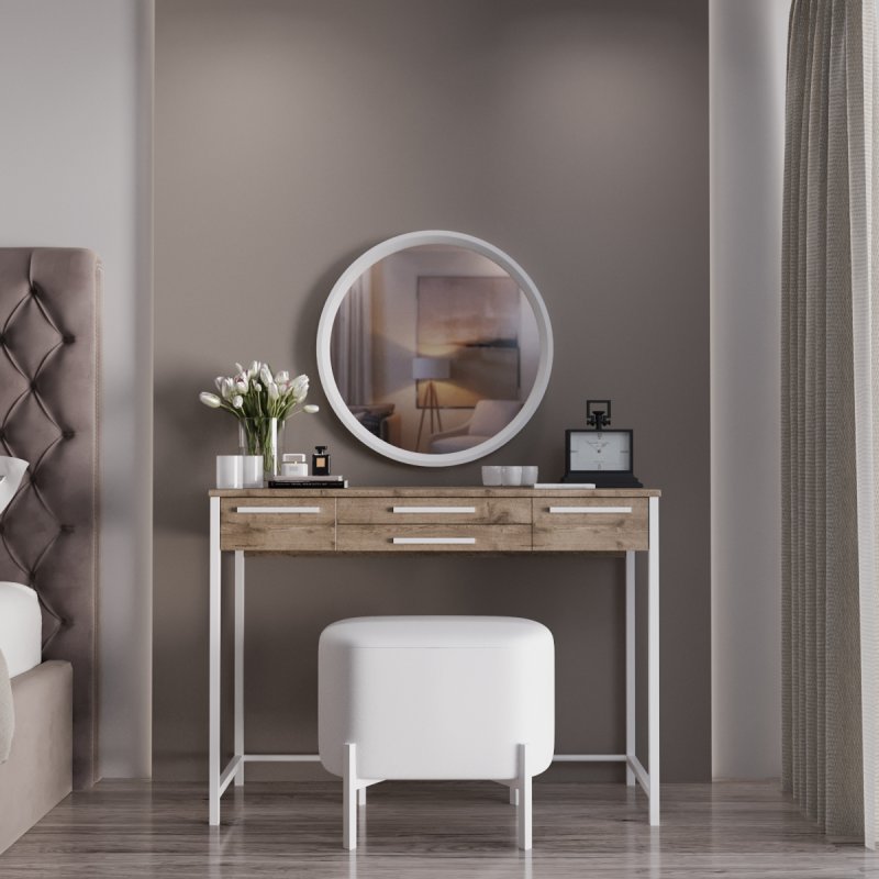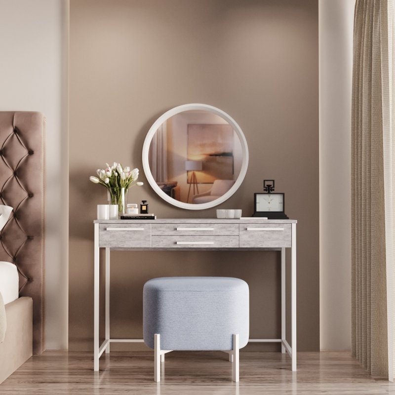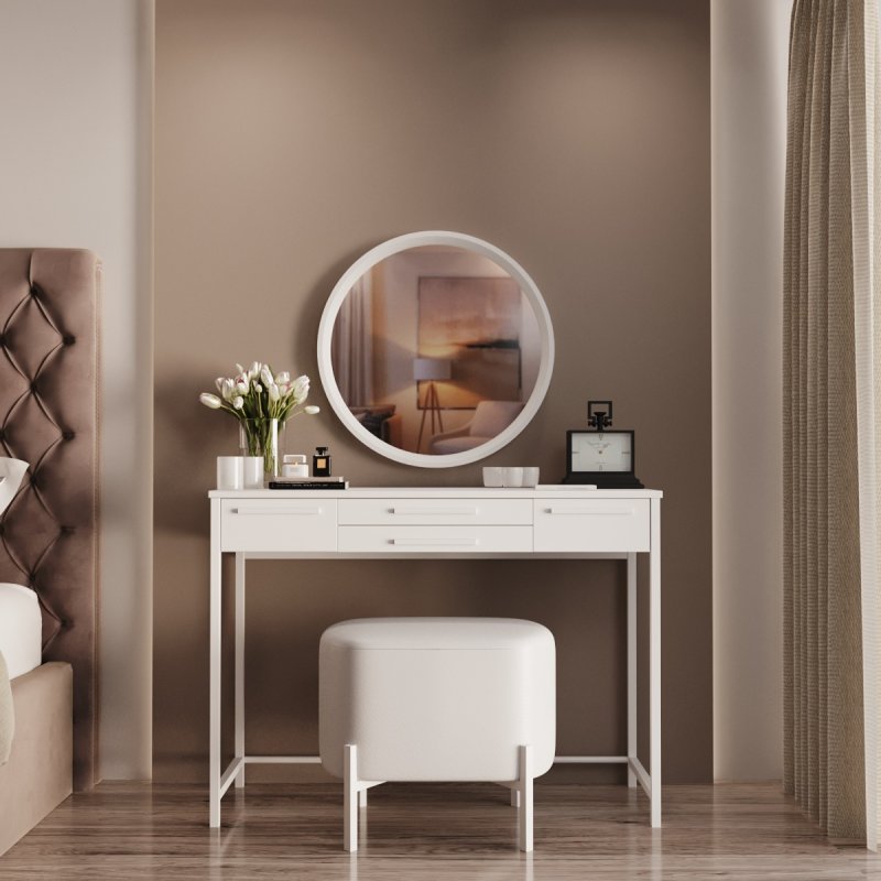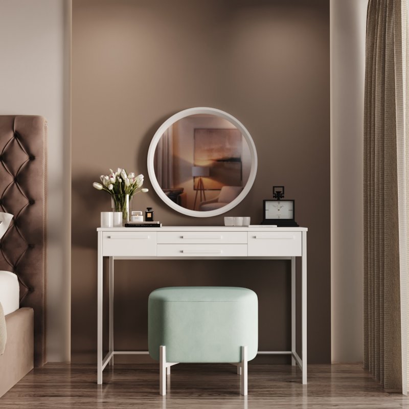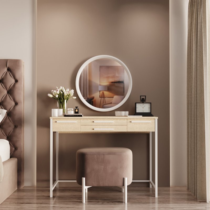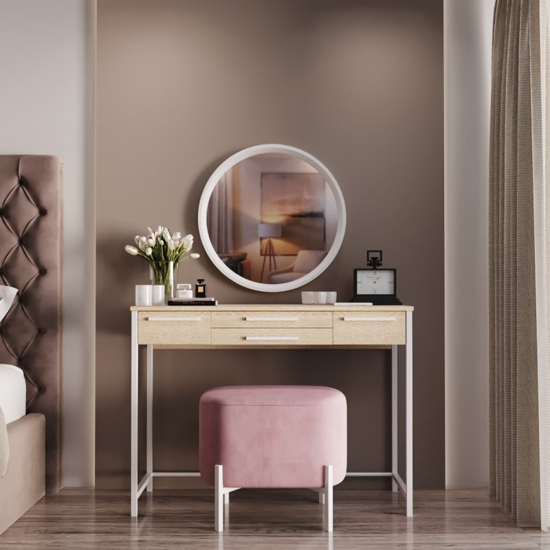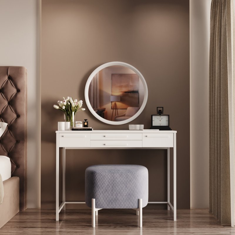 Фірмовий стиль комплекту полягає в лаконічності та зручності. Компактний та функціональний туалетний столик, затишний пуф на невагомій основі та настінне дзеркало круглої форми. Конструкція досить проста в розміщенні і не потребує великої ділянки. Комплект стане приємним акцентом у вашій спальні і подарує комфортне дамське місце.
