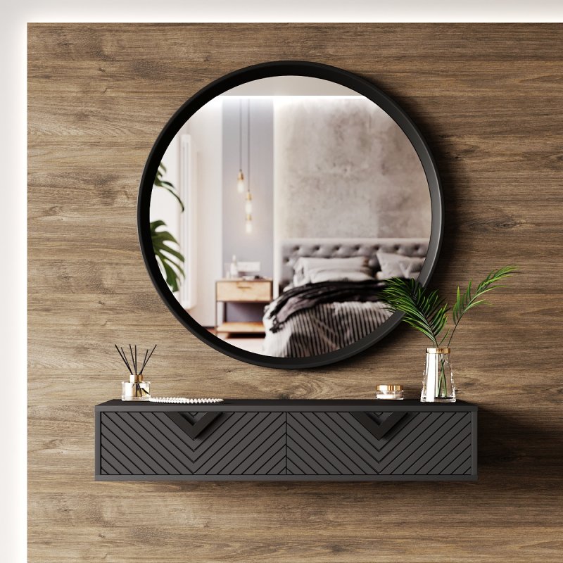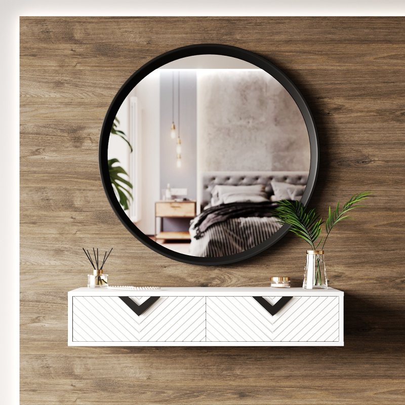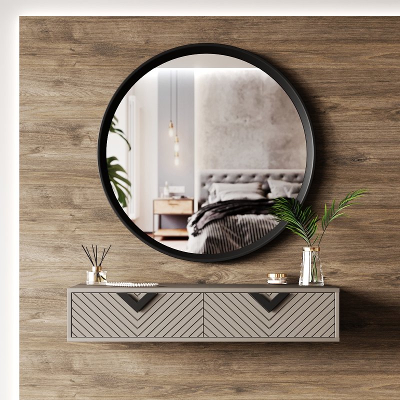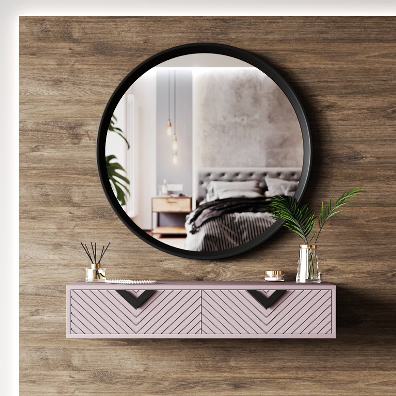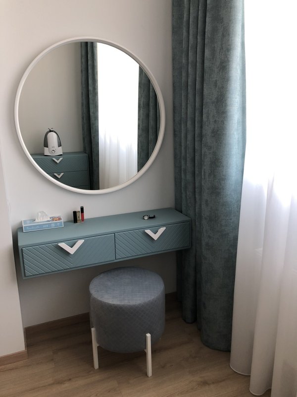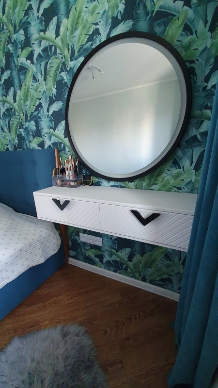 Ця модель є поєднанням стильного дзеркала овальної форми і компактного столика навісної конструкції. Встановлюється столик для макіяжу з легкістю в непрохідному місці, де спокійно і не кваплячись можна приділити час тільки собі. Лаконічний стіл укомплектований двома зручними висувними ящиками закритого типу, що відкриваються без зусиль. Вони роблять виріб більш функціональним та практичним, дозволяючи розміщувати під рукою необхідні предмети повсякденного життя: косметику, парфум, аксесуари та інше.