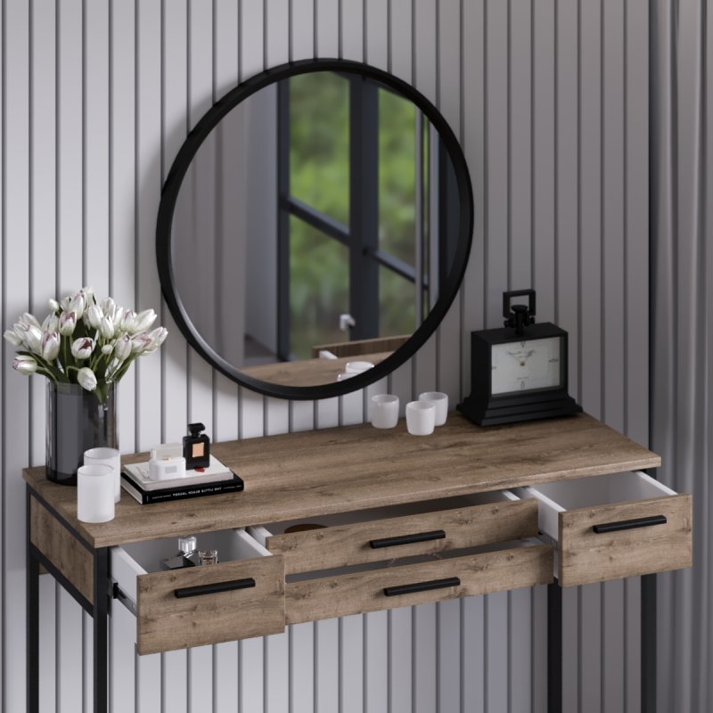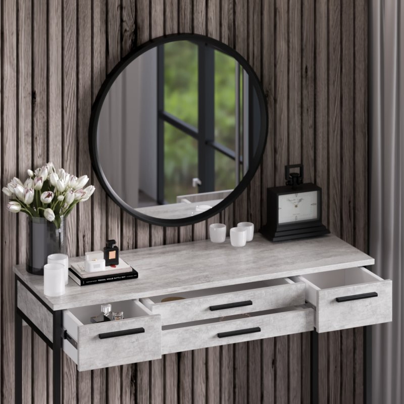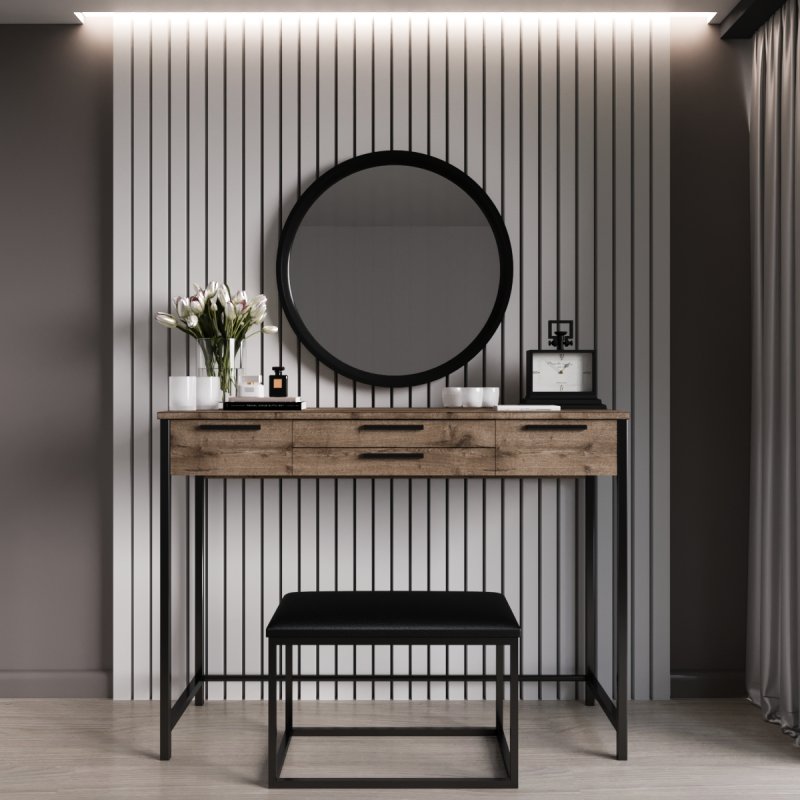 Можете купити туалетний столик окремо або як спальний гарнітур "Візаві Чорний". В даний комплект входить кругле дзеркало настінне "Токіо-600" і банкетка "Мартина". Якщо розмістити дзеркало над столом і сісти на м'який пуф, наносити макіяж стає абсолютно комфортно. Усі складові виконані в єдиному стилі та гармонійно доповнюють один одного.