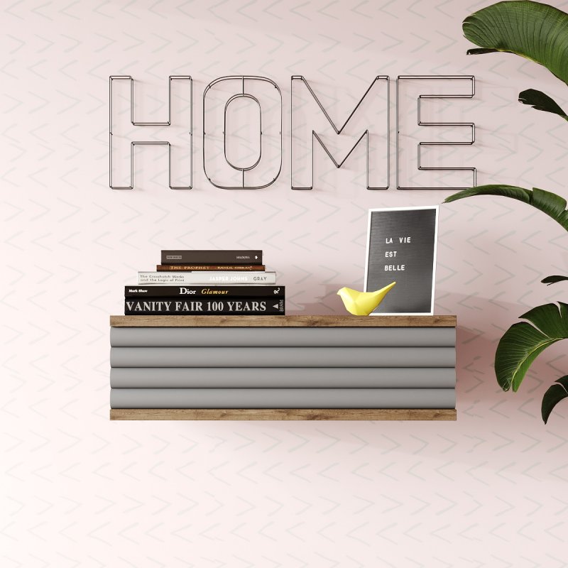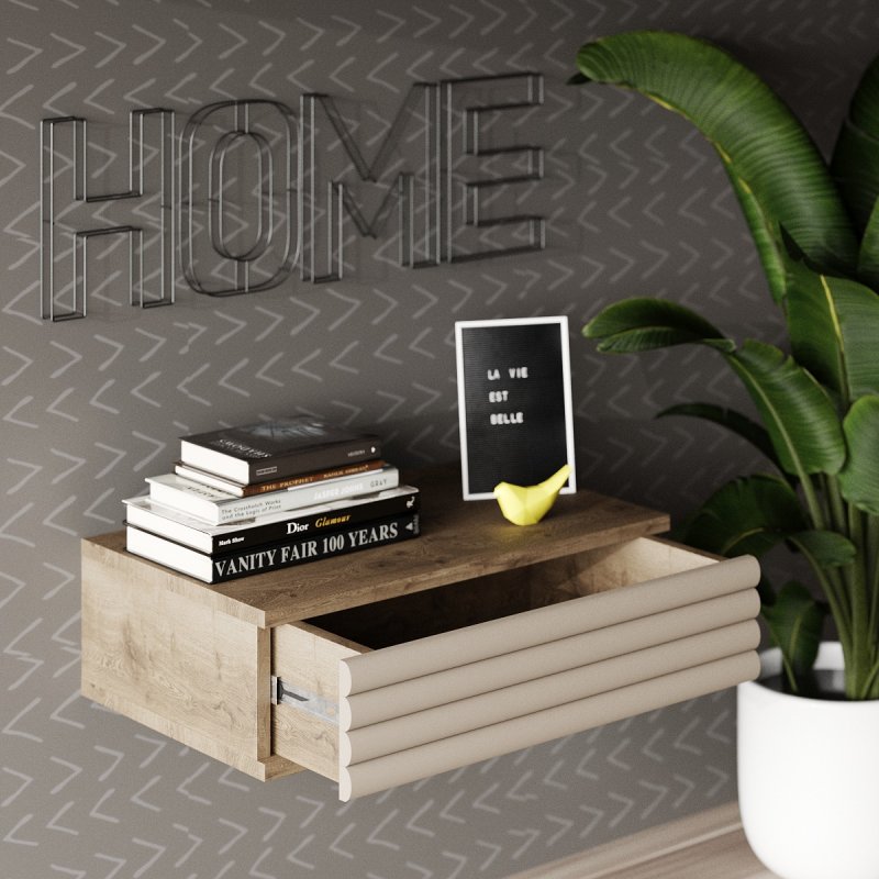 Тумба навісна стійка до навантажень і має один великий місткий ящик з системою відкриття push to open, в який ви зможете скласти свої улюблені книги, аксесуари або косметику. На поверхні ви можете розмістити вазу з квітами, рамку з фотографіями, годинник або світильник. Зручним також буде використання стільниці для зберігання телефону, поки ви спите або для чашки кави вранці. Завдяки тому, що тумба кріпиться до стіни, під нею залишається місце, куди можна поставити гарну коробку або кошик для зберігання білизни, рушників та іншої необхідної дрібниці під рукою.