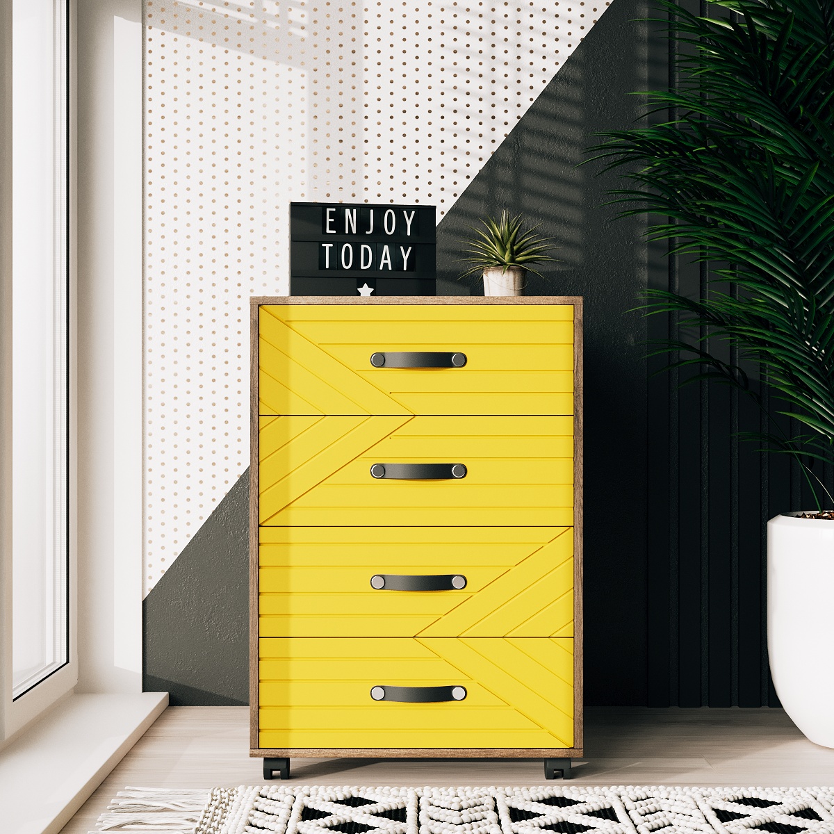 Ми пропонуємо комод на колесах у зручному розмірі 750х500х400 мм. Прямокутна форма є найбільш практичною та універсальною. Висота та ширина стільниці дозволяють також поставити на неї квіти, фотографії та інші предмети декору. А коліщата роблять виріб ще більш мобільним, дозволяючи з легкістю переміщати його в потрібне місце. Комод на 4 ящики на колесах представлений у шести яскравих та стильних відтінках (жовтий, какао, лагуна, елегант грей, грін айс та лаванда). Каркас та ручки виконані у кольорі аліканте, що надає виробу легкості та універсальності. На нашому сайті ви можете знайти тумби Марокко ще в чорному та білому кольорах. А також підібрати письмовий стіл, який ідеально доповнить композицію та додасть їй завершеності.